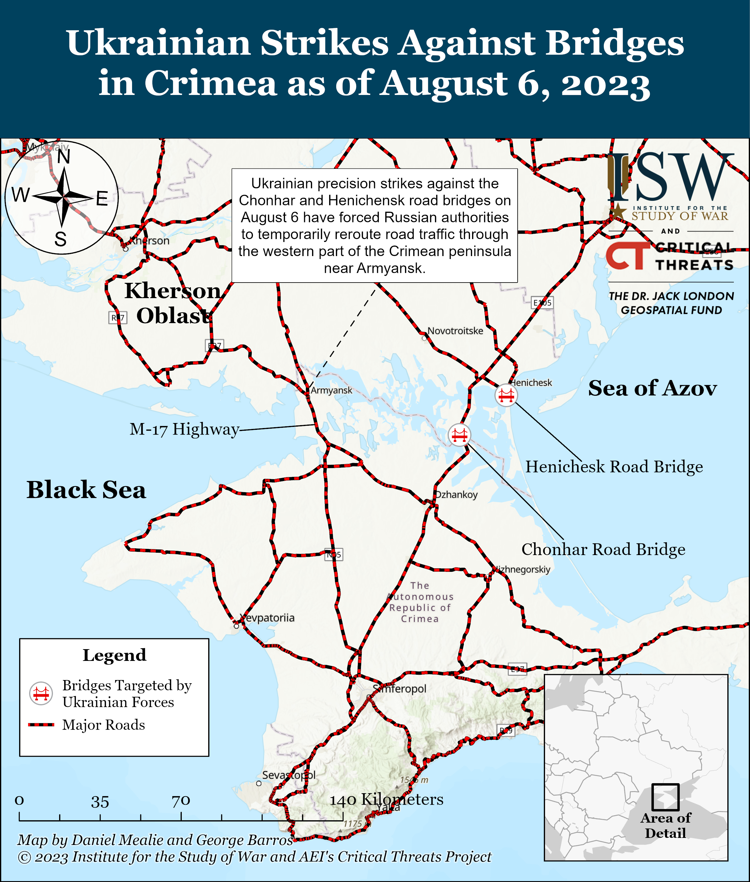 Ukrainian forces struck two key road bridges along critical Russian grounds lines of communication (GLOCs) connecting occupied Crimea and occupied Kherson Oblast on August 6, causing Russian forces to reroute road traffic from shorter eastern routes to longer western routes. Kherson Oblast occupation administration head Vadimir Saldo claimed that Ukrainian forces launched 12 missiles at a road bridge across the Henichesk Strait connecting Henichesk Raion to the Arabat Spit and that Russian air defenses intercepted nine of the missiles.[1] Russian sources amplified images showing significant damage to the bridge and claimed that Ukrainian strikes partially collapsed a section of the bridge.[2] Russian sources amplified footage showing Ukrainian forces striking the Chonhar road bridge along the M-18 (Dzhankoi-Melitopol) highway connecting occupied Crimea with occupied Kherson Oblast and subsequent minor damage to both sides of the bridge.[3] Crimean occupation head Sergei Aksyonov claimed that Ukrainian forces launched two missiles at the bridge and that one missile made it through Russian air defenses and damaged the roadbed of the road bridge.[4] Russian sources claimed that Ukrainian forces used Storm Shadow cruise missiles to conduct both strikes, although ISW has yet to observe confirmation of Russian forces intercepting Storm Shadow cruise missiles.[5]