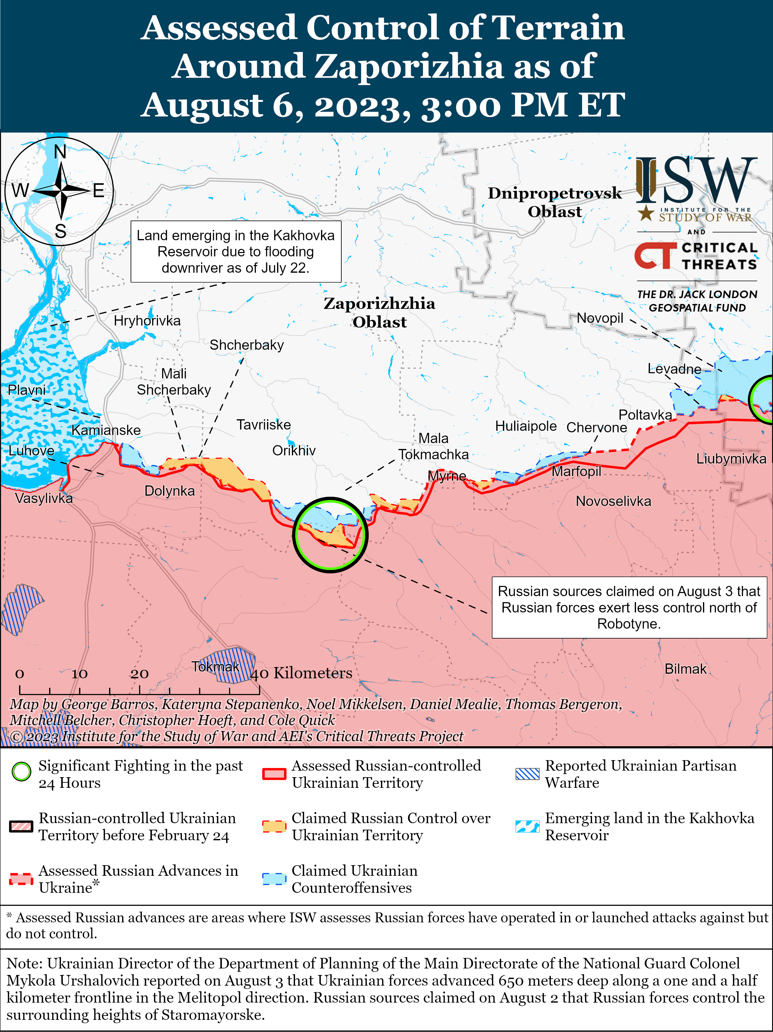 Russian forces counterattacked in western Zaporizhia Oblast on August 6 but did not advance. The Ukrainian General Staff reported that Russian forces conducted unsuccessful offensive actions near Robotyne.[55]