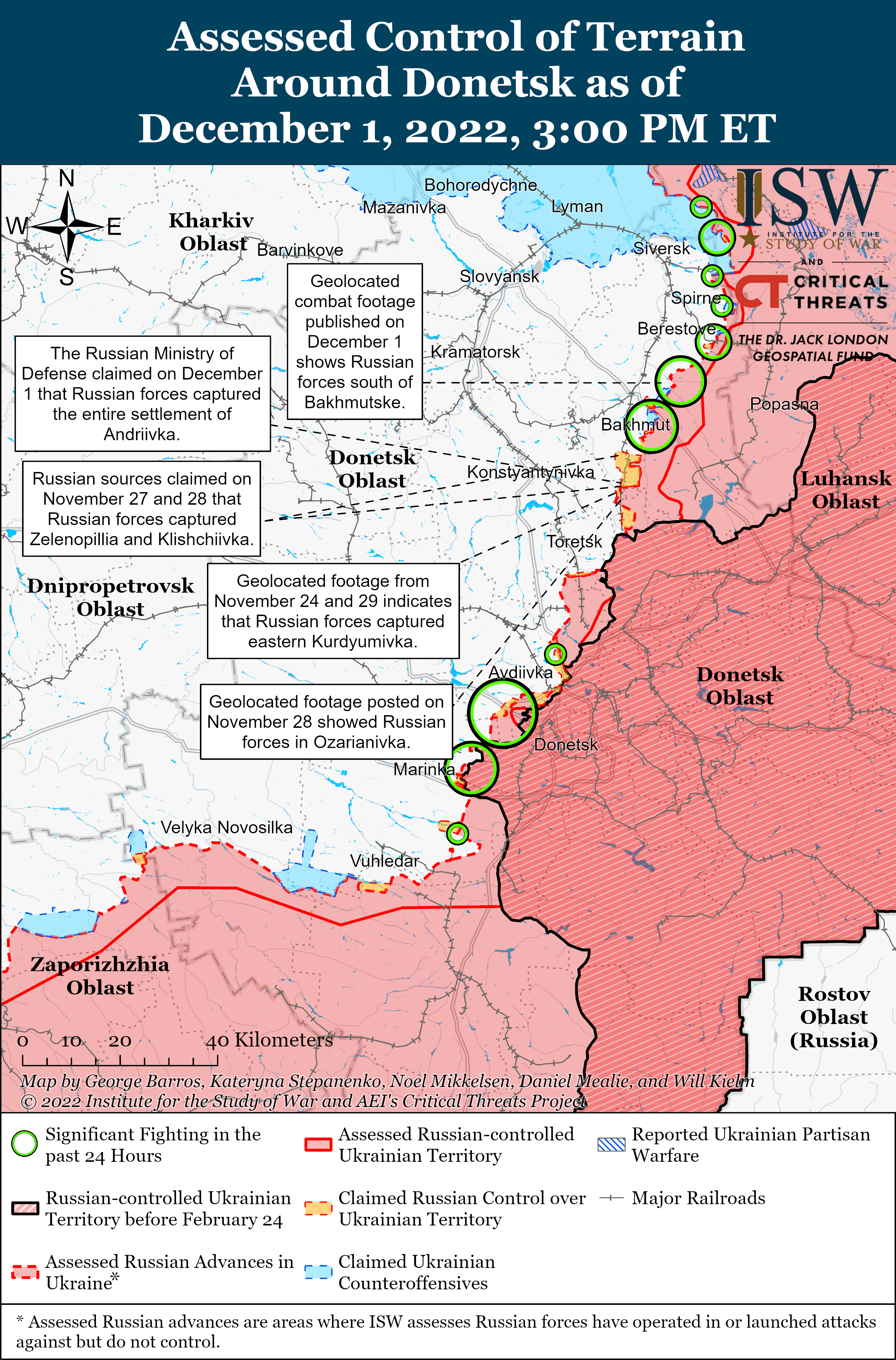 Russian forces likely continued to make marginal advances in the Bakhmut area amidst ongoing offensive operations on December 1. Ukrainian sources reported that Ukrainian forces repelled Russian assaults near Bakhmut; within 22km northeast of Bakhmut near Yakovlivka, Soledar, Bakhmutske, and Bilohorivka; and within 14km southwest of Bakhmut near Opytne, Mayorsk, and Kurdyumivka.[20] Social media sources and a Russian milblogger posted photos on December 1 showing Russian forces south of Bakhmut in Kurdyumivka and Ozarianivka.[21] The Russian Ministry of Defense (MoD) claimed that Russian forces completely control Andriivka (within 10km south of Bakhmut).[22] Geolocated footage posted on December 1 shows Ukrainian forces reportedly withdrawing from positions on the western side of the highway that runs through Opytne (within 4km south of Bakhmut).[23] A Russian milblogger published footage claiming to show Russian forces conducting offensive operations west of Kurdyumvka and claimed that Russian forces now control most of the Horlivka-Bakhmut highway.[24] Another Russian source claimed that Russian forces could now interdict all roads in the Bakhmut direction.[25] CNN published a video report on December 1 in which Ukrainian military commanders in the Bakhmut area tell a correspondent that their forces are outnumbered and facing serious supply issues.[26] The Ukrainian military commanders also told the CNN correspondent that Russian forces are committing significant forces to assaults in the Bakhmut area and are suffering heavy casualties.[27] ISW has previously assessed that the Russian effort to take Bakhmut is a high-cost effort concentrated on a city of limited operational significance.[28]