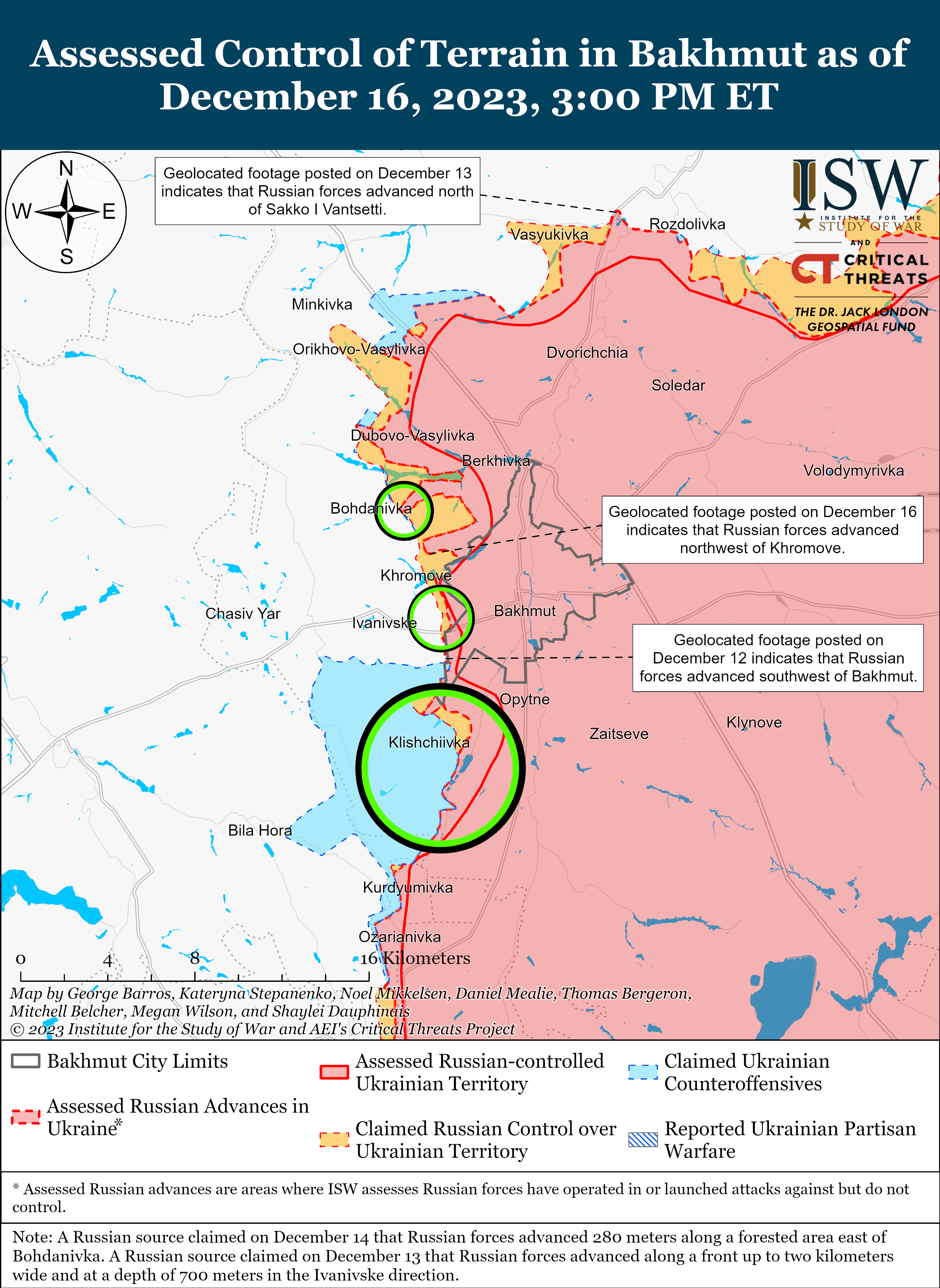 The Russian Ministry of Defense (MoD) claimed that Ukrainian forces unsuccessfully attacked near Bakhmut near Ivanivske (6km west of Bakhmut) and Klishchiivka (7km southwest of Bakhmut) on December 16.[42]