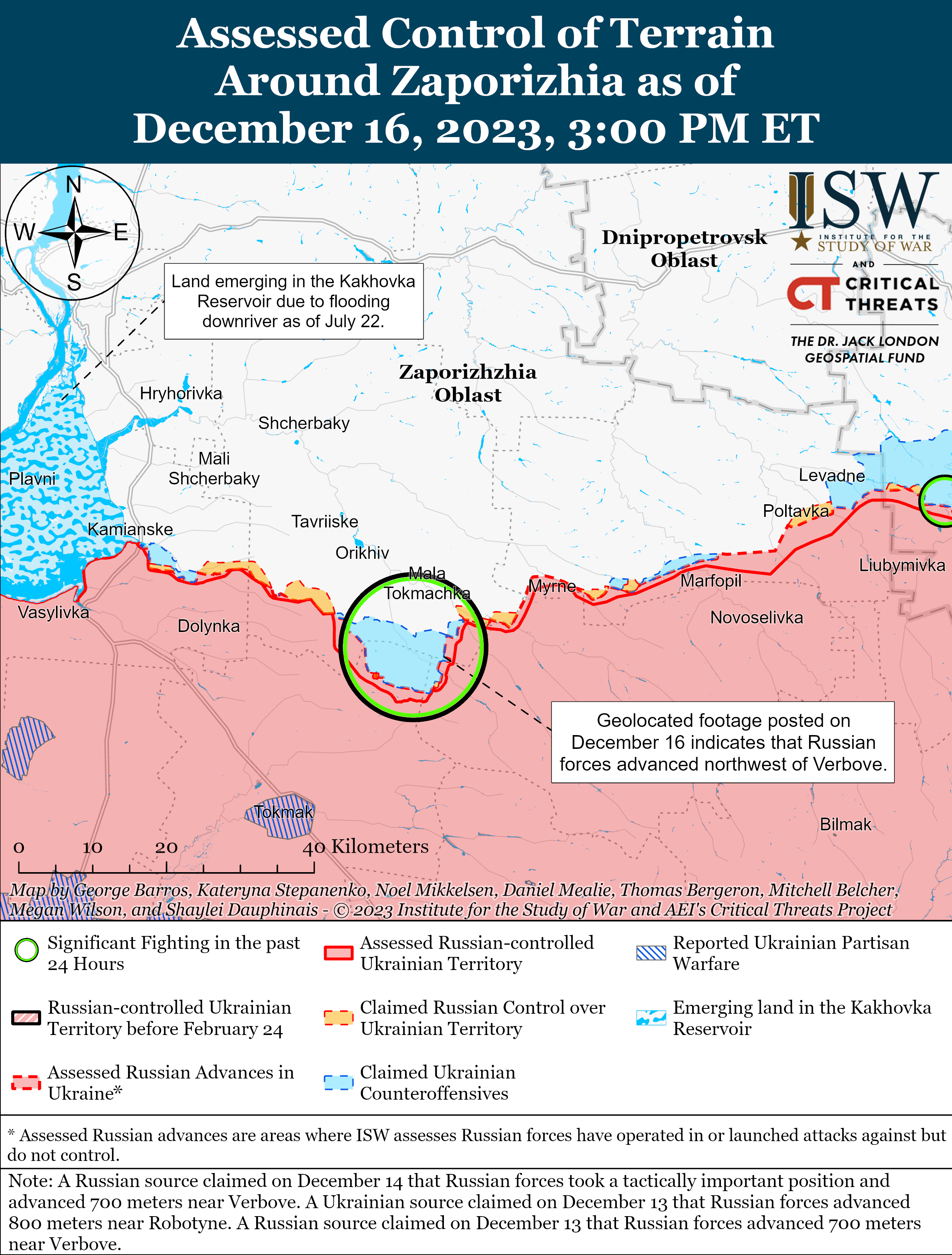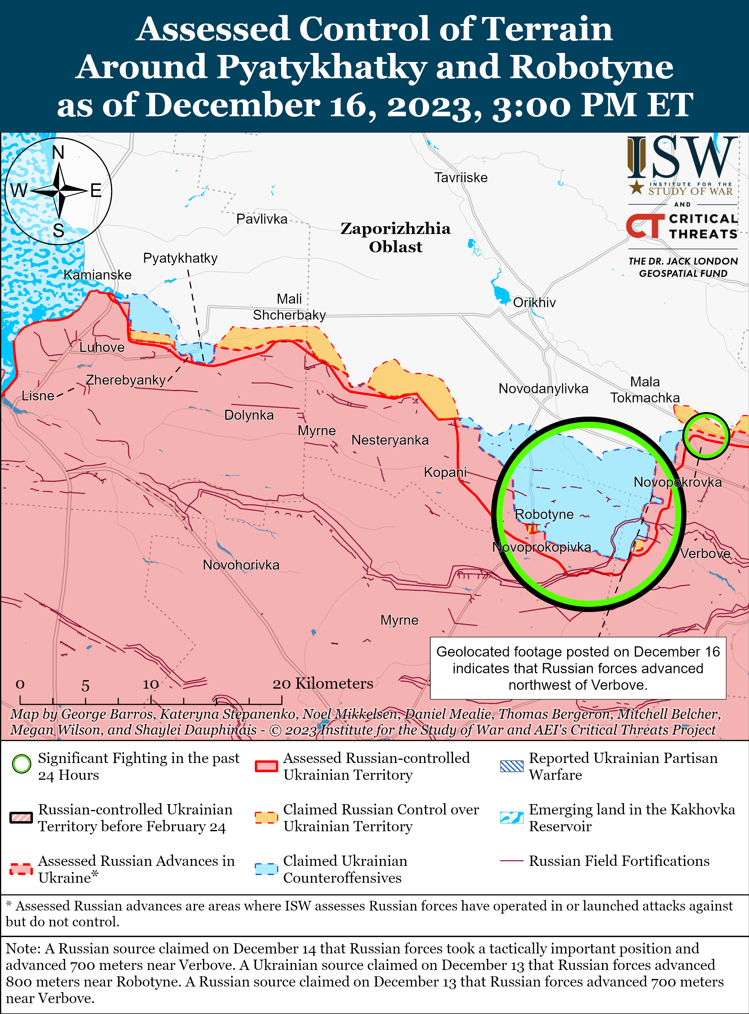 Ukrainian forces continued counteroffensive operations near Robotyne in western Zaporizhia oblast on December 16 but did not make any confirmed advances. Russian sources, including the Russian Ministry of Defense (MoD), claimed that Russian forces repelled Ukrainian assaults near Robotyne and Verbove (9km east of Robotyne).[64]