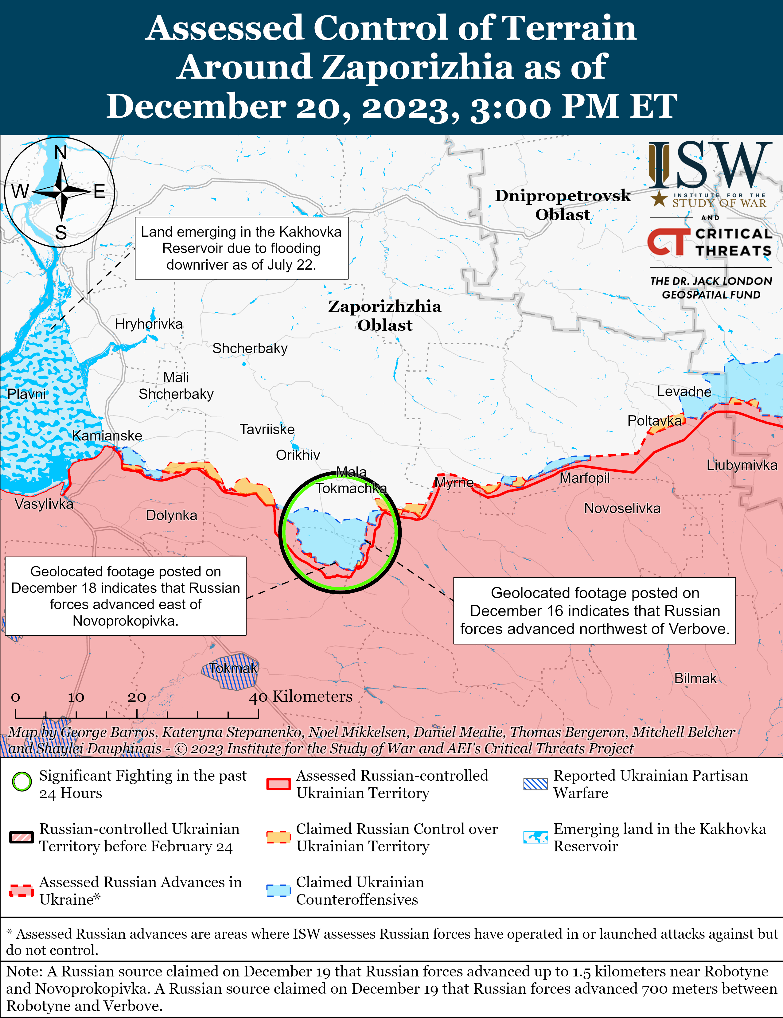 Russian forces reportedly advanced in western Zaporizhia Oblast on December 20. Several milbloggers claimed that Russian forces advanced up to 1.5 kilometers near Robotyne and Novoprokopivka (just south of Robotyne) and up to several hundred meters near Verbove (east of Robotyne), although ISW has not observed visual confirmation of any Russian gains in this area.[59] Some Russian sources claimed that Ukrainian activity in this sector has decreased and that Ukrainian forces have largely shifted to defensive operations.[60] The Ukrainian General Staff reported that Ukrainian force repelled Russian attacks west of Verbove, south of Robotyne, and west of Novopokrovka (northeast of Robotyne).[61] Elements of the 247th Air Assault (VDV) Regiment (7th VDV Division) and 76th VDV Division are reportedly operating near Verbove.[62]