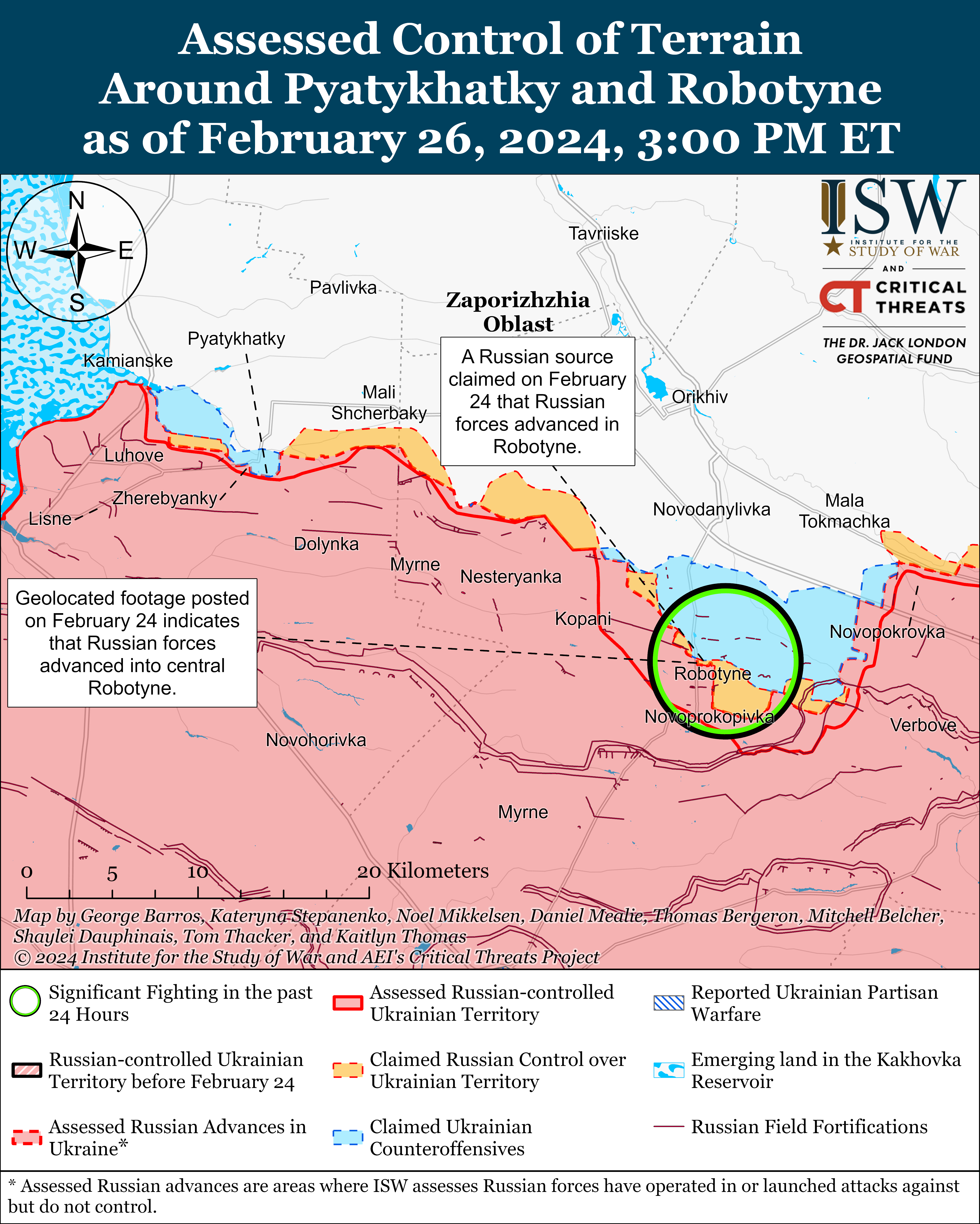 - Ukrainian President Volodymyr Zelensky stated on February 25 that Russia is preparing a new offensive that will start in late May or summer 2024, consistent with ISW’s assessment that Russian forces have regained the theater-wide initiative and will be able to pursue offensive operations when and where they choose as long as they hold the initiative.