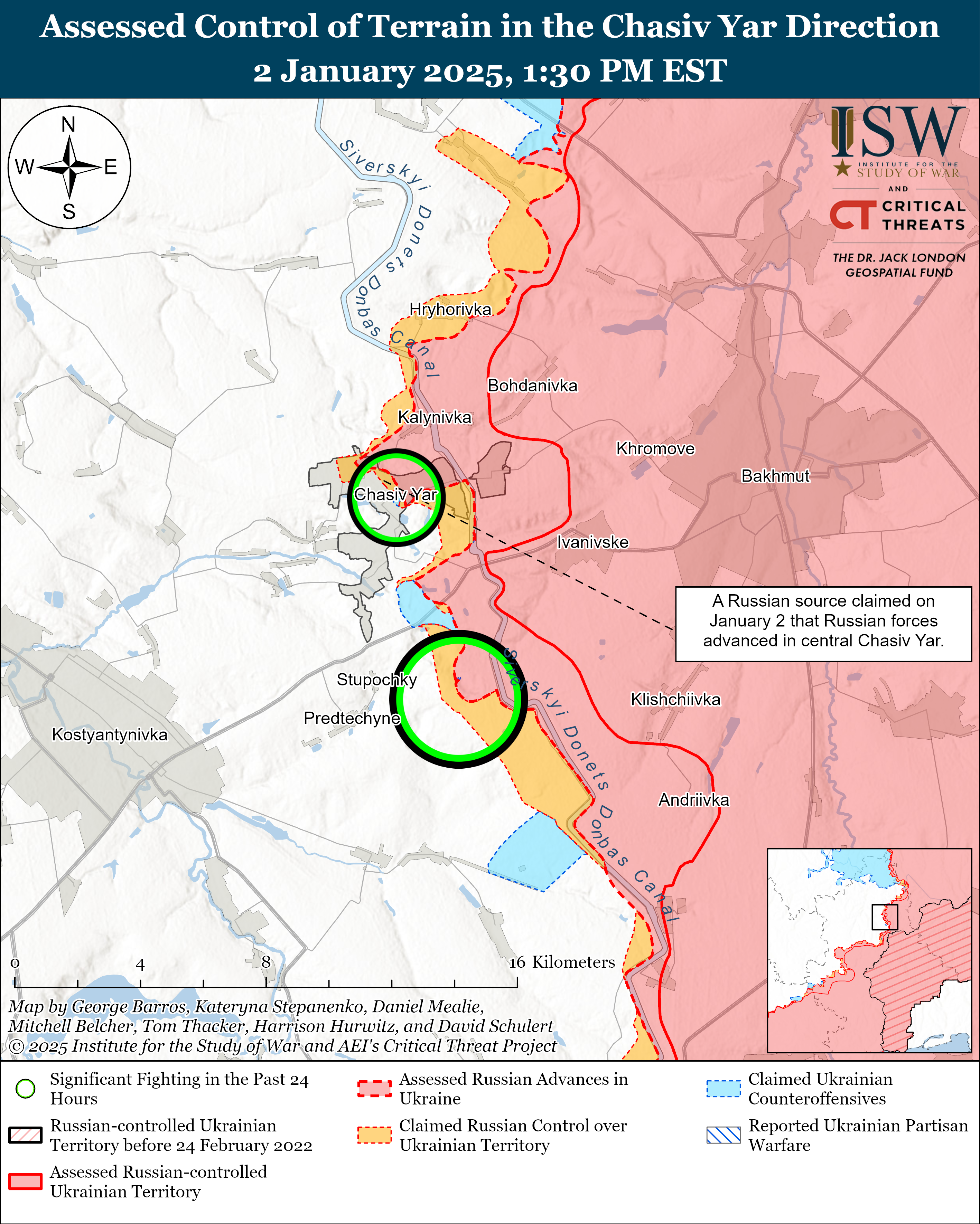 Russian forces continued offensive operations in the Chasiv Yar direction but did not make any confirmed advances on January 1 and 2. Russian milbloggers claimed on January 1 and 2 that Russian forces advanced in northern Chasiv Yar and near the Refractory Plant in central Chasiv Yar, and one milblogger claimed that Russian forces control most of Pivnichnyi Microraion in northern Chasiv Yar.[43] ISW has not observed confirmation of these claims, however. A Russian milblogger claimed on January 2 that Russian forces conducted heavy glide bomb and drone strikes against Ukrainian positions in the Chasiv Yar Refractory Plant in order to prepare for future ground assaults.[44] Russian forces continued ground attacks within Chasiv Yar; north of Chasiv Yar near Hryhorivka; and south of Chasiv Yar near Stupochky, Predtechyne, and Bila Hora on December 31 to January 2.[45] Ukrainian military officials reported on January 1 that Russian forces in the Chasiv Yar direction are mostly conducting infantry assaults and only conduct limited mechanized assaults in order to surprise Ukrainian forces.[46] Ukrainian military officials also stated that Russian forces are using the cover of fog and smoke grenades to conceal their ground attacks in Chasiv Yar and Toretsk. Elements of the Russian 98th Airborne (VDV) Division reportedly continue to operate in Chasiv Yar, and elements of the Russian 1008th Motorized Rifle Regiment (6th Motorized Rifle Division, 3rd AC) are reportedly recently operating near Klishchiivka (southeast of Chasiv Yar).[47]