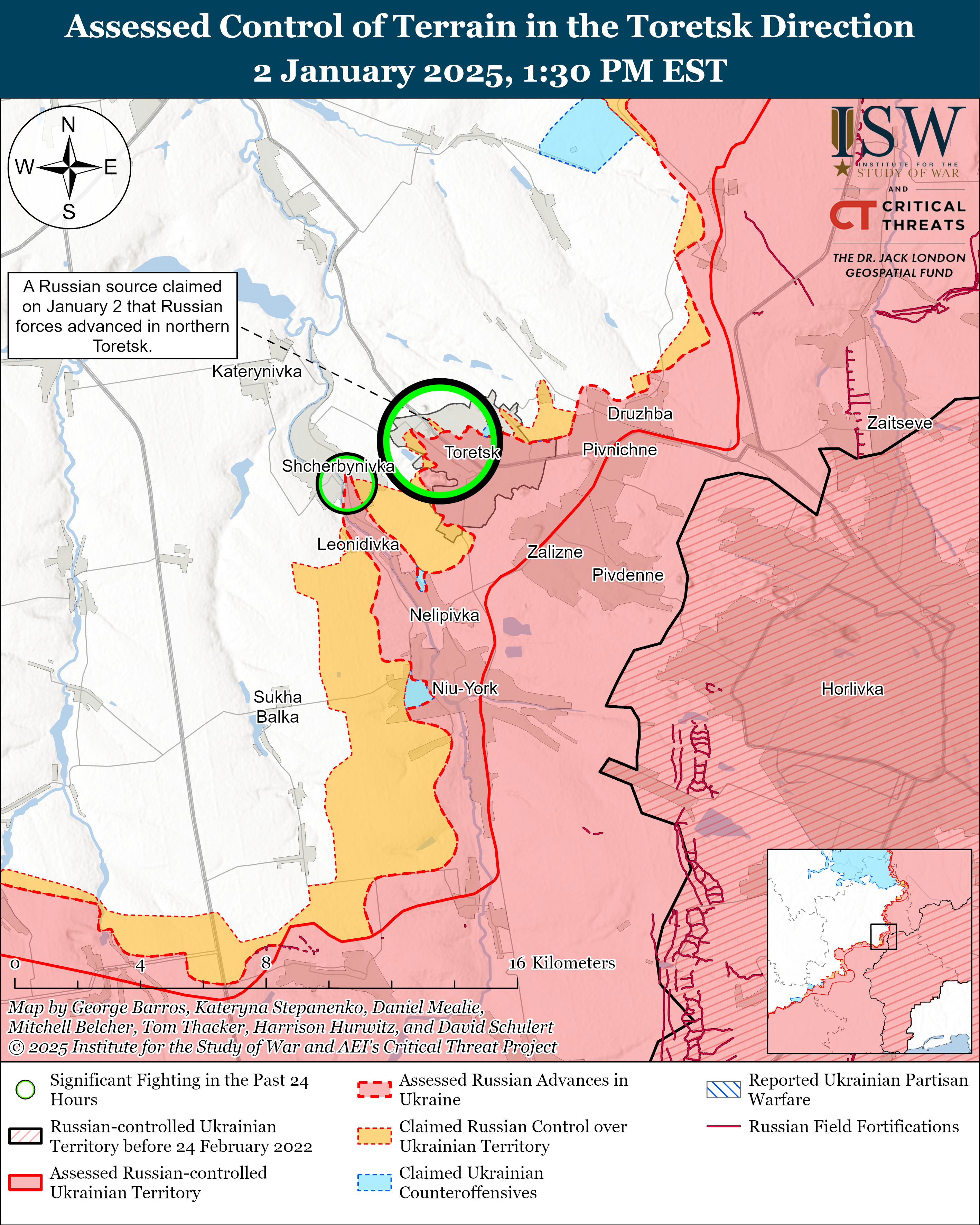 Russian forces recently advanced in Toretsk amid continued offensive operations in the Toretsk direction on January 1 and 2. Geolocated footage published on January 1 indicates that Russian forces recently advanced in northwestern and western Toretsk following a reduced-platoon sized mechanized assault.[48] A Kremlin-affiliated milblogger claimed on December 31 that Russian forces control roughly 60 percent of Toretsk, and ISW currently assesses that Russian forces occupy roughly 65 percent of the settlement.[49] Russian milbloggers claimed that Russian forces advanced up to Volohodska Street in western Toretsk, along 3 Hirskyi Street and Kachalova Street in northwestern Toretsk, and in northern Toretsk, but ISW has not observed confirmation of these claims.[50] A Russian milblogger claimed that drone operators of the Russian 9th Motorized Rifle Brigade (51st CAA, formerly the 1st Donetsk People’s Republic [DNR] AC) conducted drone strikes on Ukrainian vehicles near Toretsk, which enabled elements of the 1st Motorized Rifle Brigade (51st CAA) to advance in the area.[51] Russian forces attacked within Toretsk itself, northeast of Toretsk near Dyliivka, west of Toretsk near Shcherbynivka, and southwest of Toretsk near Leonidivka on December 31 to January 2.[52] Drone operators of the Russian 132nd Motorized Rifle Brigade (51st CAA) are reportedly operating near Toretsk.[53]