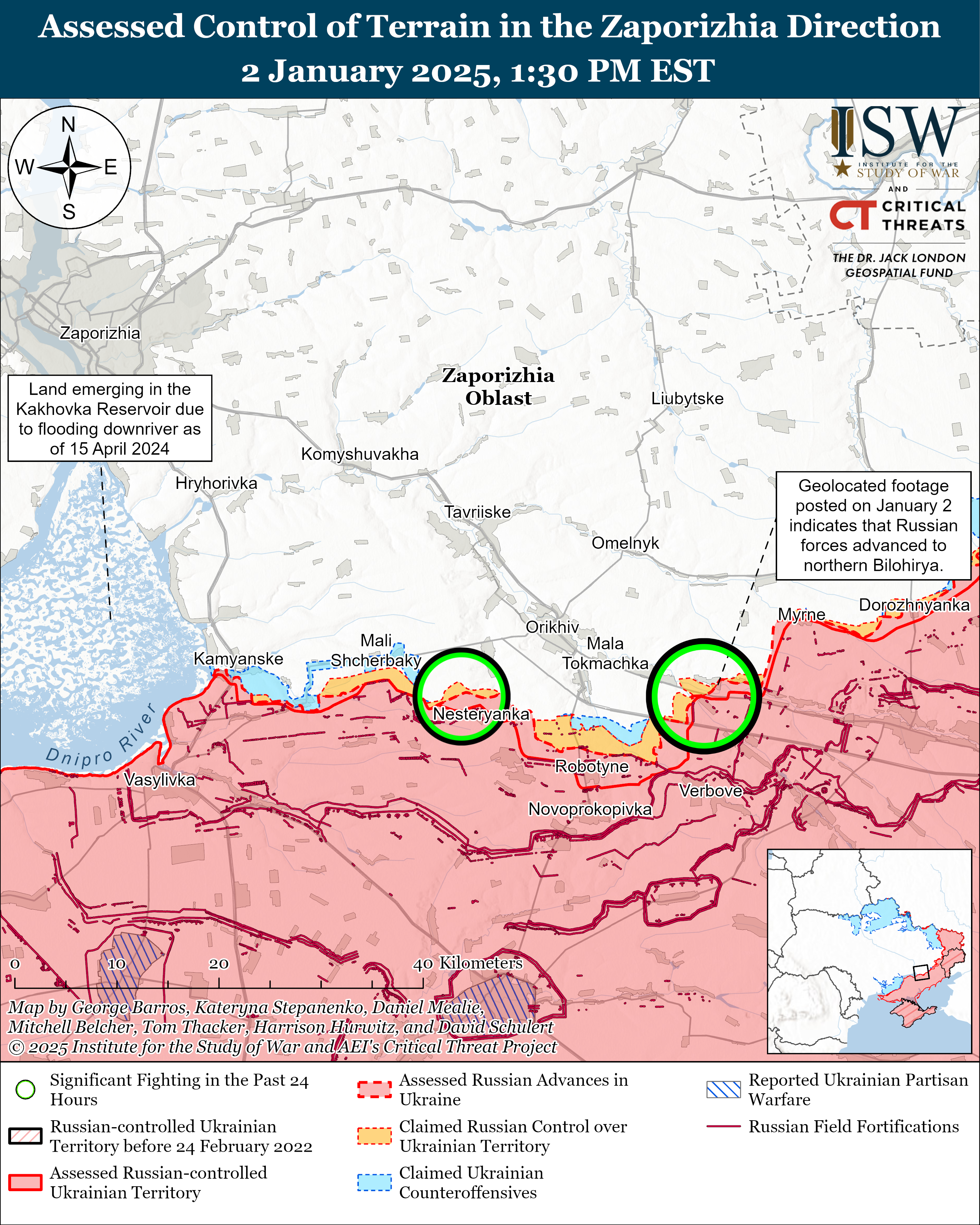 Russian forces recently advanced in western Zaporizhia Oblast amid continued offensive operations in the area on January 1 to 2. Geolocated footage published on January 2 indicates that Russian forces recently advanced in northern Bilohirya (northeast of Robotyne).[78] A Kremlin-affiliated Russian milblogger claimed on January 2 that elements of the Russian 70th Motorized Rifle Regiment (42nd Motorized Rifle Division, 58th CAA, Southern Military District [SMD]) raised a flag in central Bilohirya but then withdrew to their previous positions.[79] The milblogger claimed that Bilohirya is a contested “gray zone” but that the Russian raid in the settlement indicates that Russian forces seized Luhivske (just east of Bilohirya). Another Russian milblogger claimed that it is too early to claim that Russian forces control Bilohirya.[80] Russian forces conducted offensive operations near Novoandriivka (northwest of Robotyne) on January 1 and 2.[81] A Russian source claimed that Ukrainian forces unsuccessfully counterattacked near Orikhiv (north of Robotyne) and Kamyanske (northwest of Robotyne) on December 31.[82]