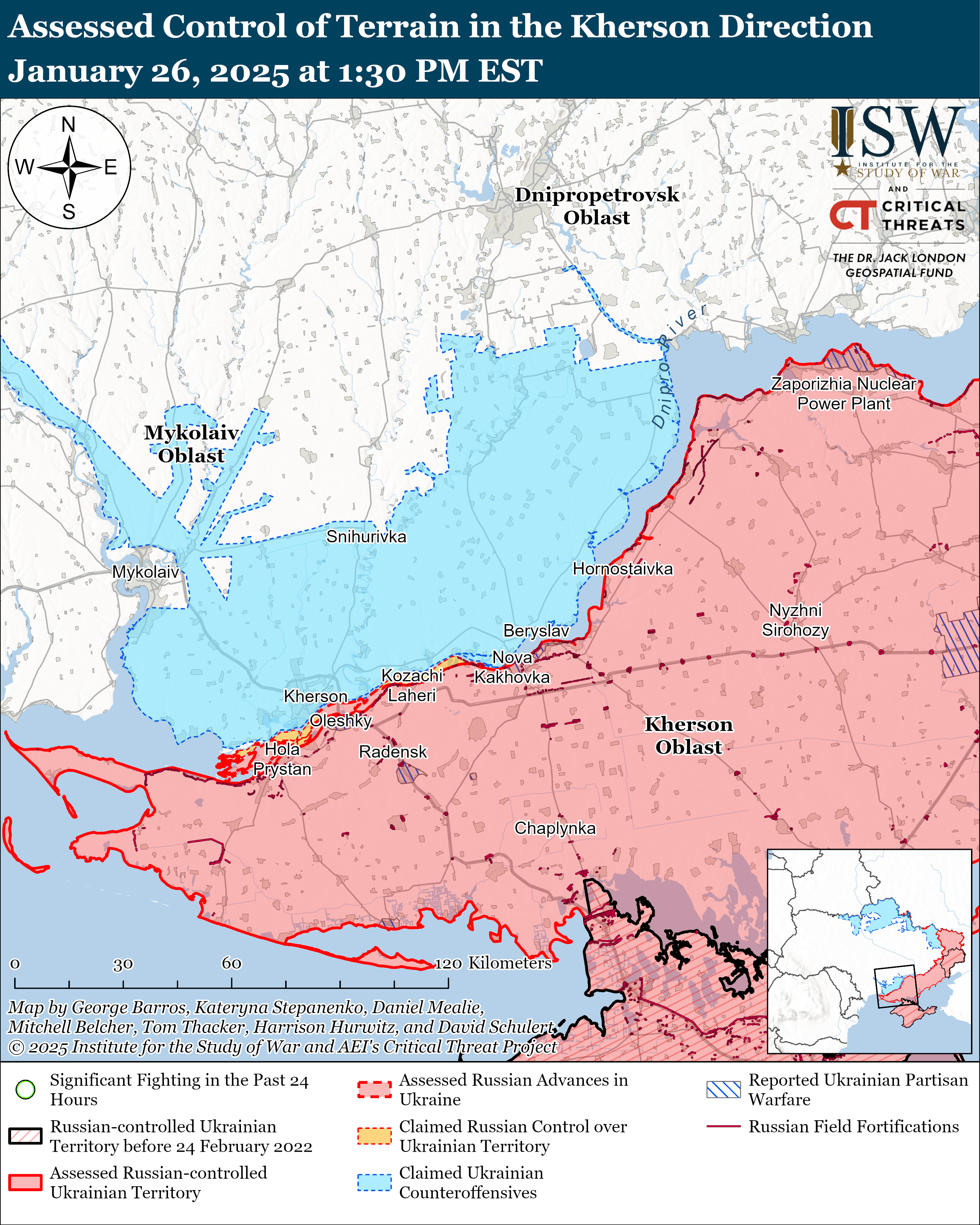 Russian forces continued assaults in the Kherson direction, including on Zabych and Kozatskyi islands (southwest and east of Kherson City, respectively) in the Dnipro River Delta, on January 25 and 26 but did not advance.[68]
