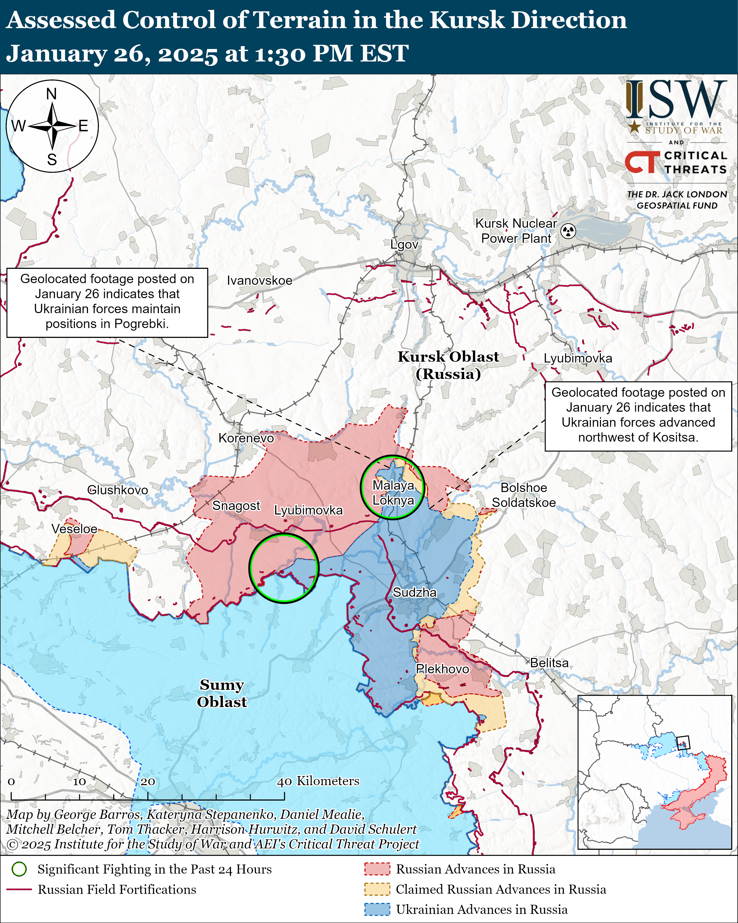 Ukrainian forces recently marginally advanced in Kursk Oblast amid continued fighting in the Ukrainian salient on January 26. Geolocated footage published on January 26 indicates that Ukrainian forces recently marginally advanced in central Pogrebki (north of Sudzha) and in the forested area northwest of Kositsa (northeast of Sudzha).[25] Russian milbloggers claimed that Ukrainian forces conducted counterattacks near Pogrebki.[26] Elements of the Russian 106th and 76th airborne (VDV) divisions, including the 76th VDV Division’s 234th VDV Regiment, are reportedly operating in Kursk Oblast; elements of the 34th Motorized Rifle Brigade (49th Combined Arms Army [CAA], Southern Military District [SMD]) are reportedly operating near Pogrebki; and elements of the 1427th Motorized Rifle Regiment (formed during 2022 partial reserve call up) are reportedly operating near Kositsa (north of Sudzha).[27]