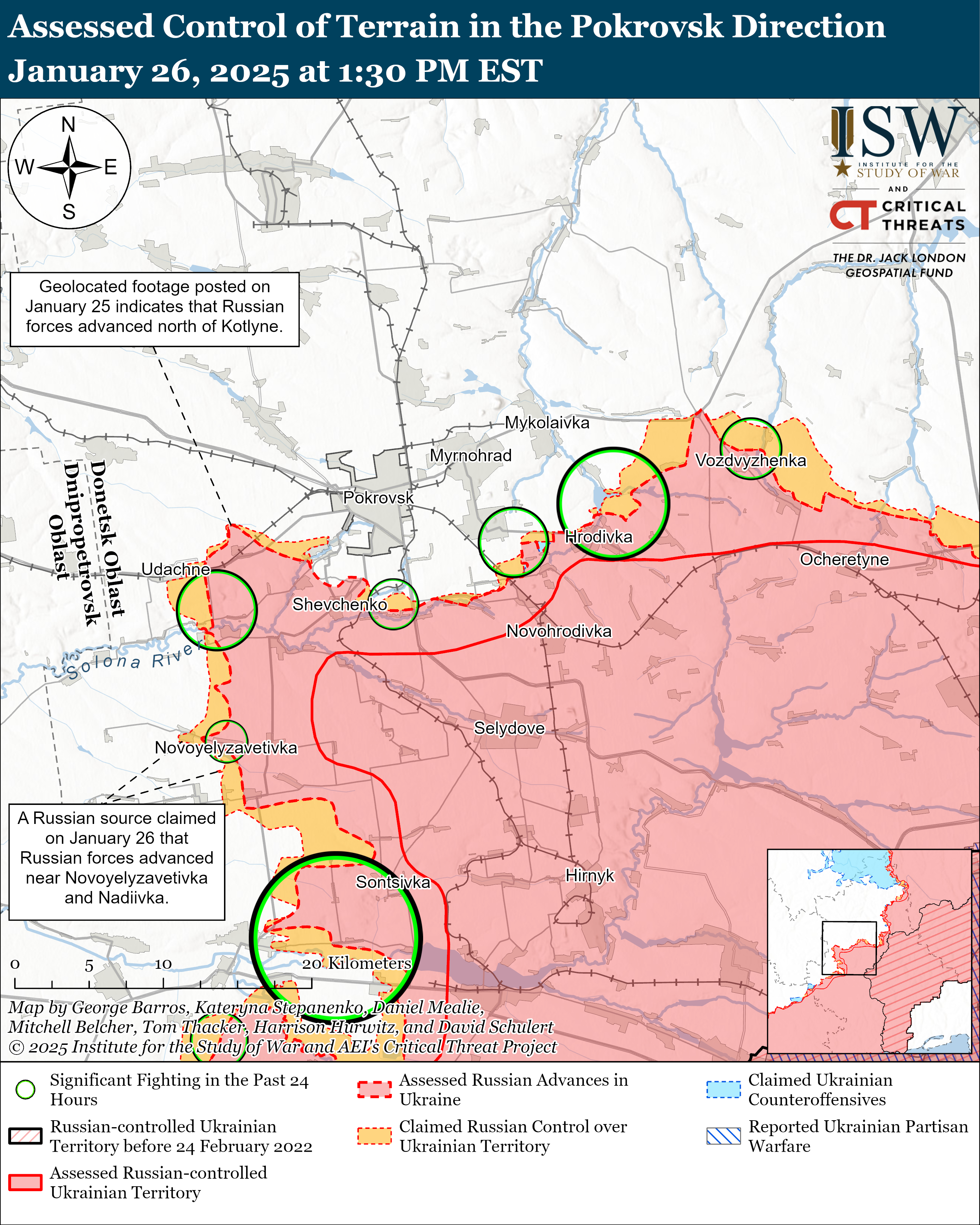 Russian forces recently marginally advanced west of Pokrovsk amid ongoing offensive operations in the Pokrovsk direction on January 26. Geolocated footage published on January 25 indicates that Russian forces recently marginally advanced in the fields north of Kotlyne (west of Pokrovsk).[55] The spokesperson of a Ukrainian National Guard Brigade operating in the Pokrovsk direction stated that Russian forces are transporting infantry on armored vehicles towards Ukrainian positions and are using several tanks to provide fire support for each group of disembarking infantry.[56] The Russian MoD claimed that Russian forces seized Zelene (south of Pokrovsk), and ISW assessed that Russian forces seized the settlement as of January 21.[57] Russian milbloggers claimed that Russian forces advanced further west of Kotlyne and seized a nearby mineshaft, advanced in the fields south of Udachne (west of Pokrovsk), south of Novoyelyzavetivka (southwest of Pokrovsk) and gained a foothold in eastern and southern Nadiivka (southwest of Pokrovsk), but ISW has not observed confirmation of these claims.[58] A Russian source claimed that Russian forces are attempting to bypass and envelop Yelyzavetivka (east of Pokrovsk).[59] Russian forces continued assault near Pokrovsk itself; east of Pokrovsk near Vozdvyzhenka, Vodyane Druhe, Myrolyubivka, Yelyzavetivka, and Promin; southeast of Pokrovsk near Lysivka; south of Pokrovsk near Zelene, Novoukrainka, and Zvirove; west of Pokrovsk near Udachne and Kotlyne; and southwest of Pokrovsk near Novovasylivka, Novooleksandrivka, Uspenivka, Novoserhiivka, Nadiivka, and Bohdanivka on January 25 and 26.[60] Elements of the Russian 35th Motorized Rifle Brigade (41st CAA, Central Military District [CMD]) and drone operators of the Russian Rubicon Center for Advanced Unmanned Technologies and the “Vega” Spetsnaz Detachment (24th Guards Spetsnaz Brigade, Main Intelligence Directorate of the Russian General Staff [GRU]) are reportedly operating in the Pokrovsk direction.[61]
