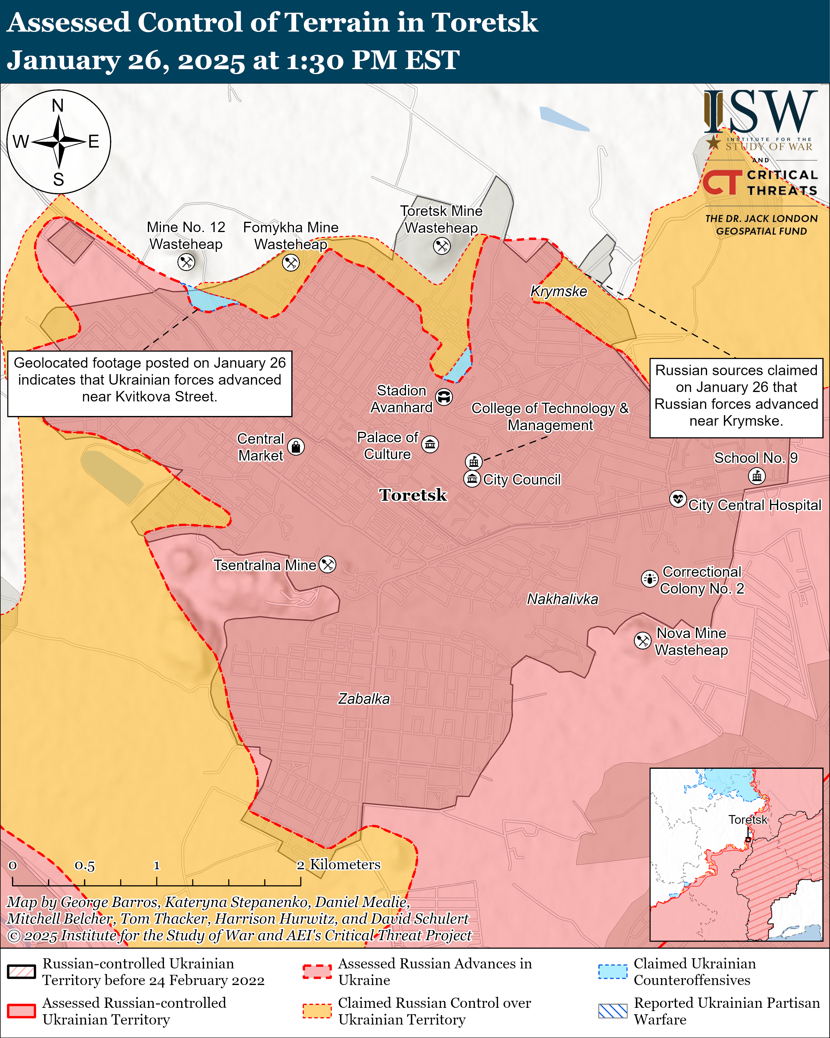 Ukrainian forces recently regained limited positions in Toretsk amid ongoing Russian assaults in the settlement on January 26. Geolocated footage published on January 26 indicates that Ukrainian forces recently regained limited positions in northwestern Toretsk.[50] A Ukrainian battalion commander operating in the Toretsk direction reported that Ukrainian forces maintain positions within the administrative boundaries of Toretsk.[51] Russian milbloggers claimed that Russian forces are advancing in Krymske (north of Toretsk) and Petrivka (west of Toretsk), but ISW has not observed confirmation of this claim.[52] Russian forces continued assaults near and within Toretsk, including near the Toretska Mine in northern Toretsk, on January 25 and 26.[53] Elements of the Russian 132nd Motorized Rifle Brigade (51st Combined Arms Army [CAA], formerly 1st Donetsk People’s Republic [DNR] AC) reportedly continue to operate in Toretsk.[54]
