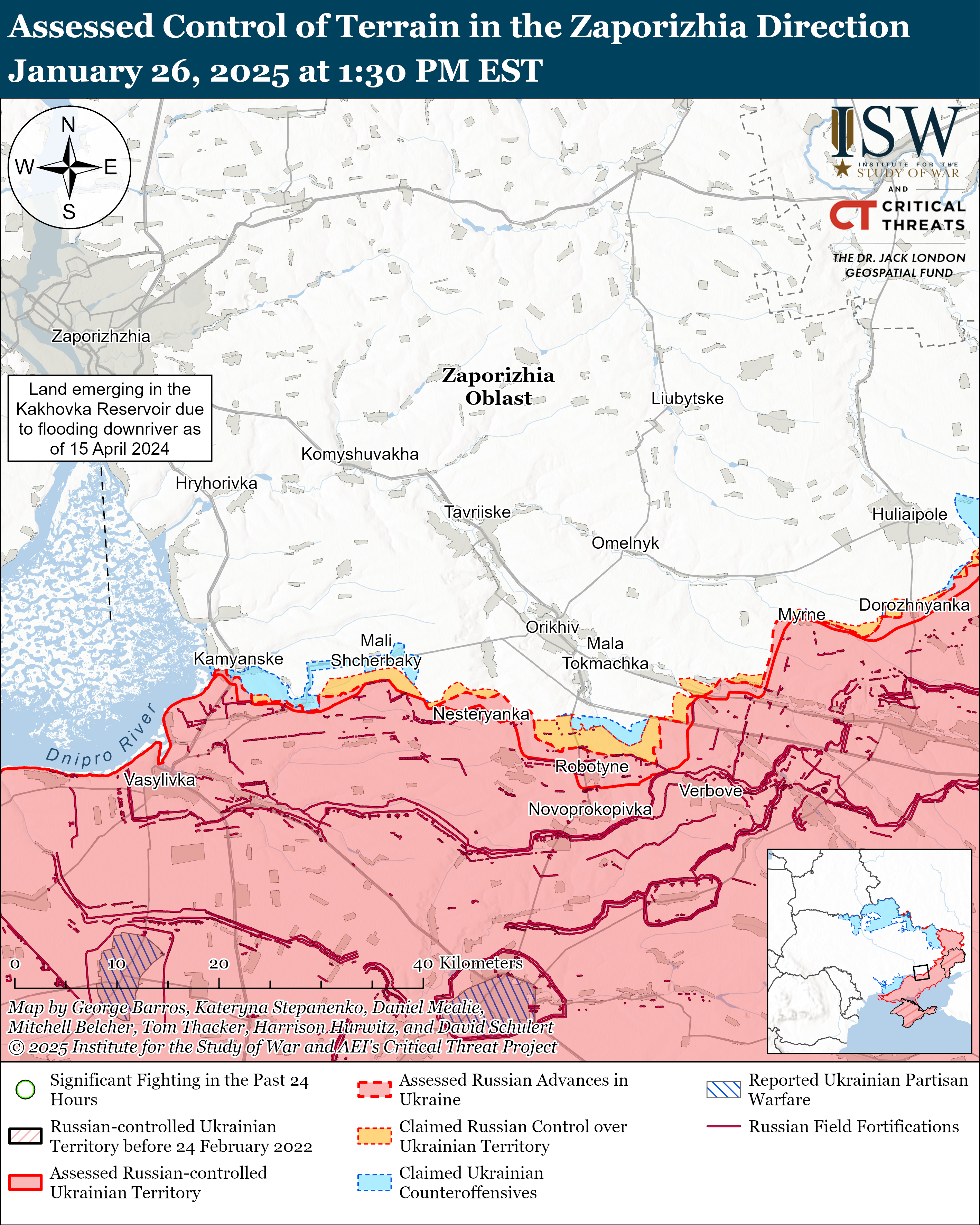 Neither Ukrainian nor Russian sources reported Russian offensive operations in the Zaporizhia direction on January 26. A spokesperson for a Ukrainian brigade operating in the Zaporizhia direction stated that Russian forces are using fiber optic drones more frequently.[67]