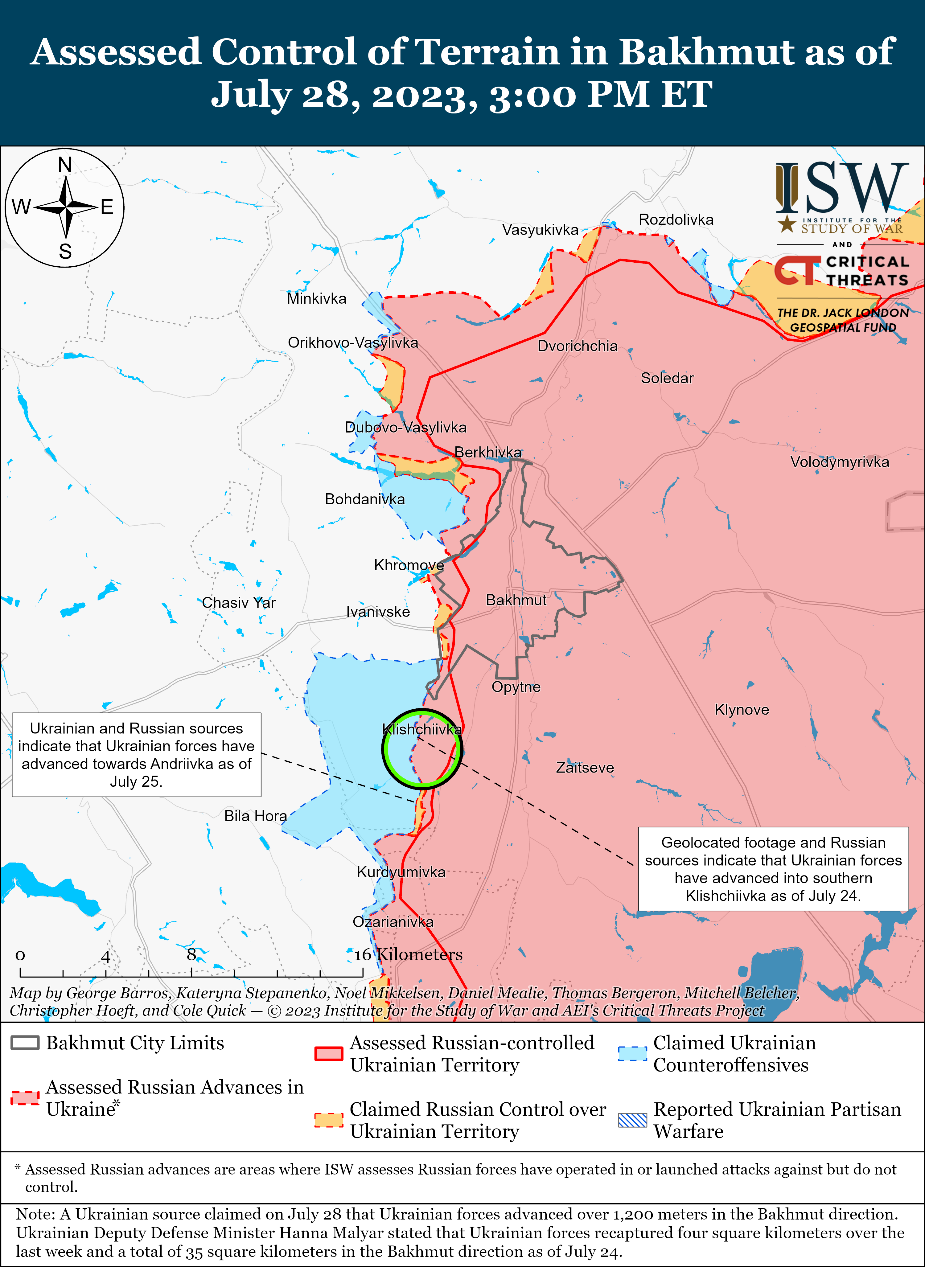 Russian forces continued counterattacks to stymie ongoing Ukrainian offensive operations near Bakhmut and reportedly advanced on July 28. Russian milbloggers claimed that Russian forces pushed Ukrainian forces back from Klishchiivka and that Russian forces fully control the settlement.[54] One milblogger claimed that Klishchiivka is currently contested, however.[55] The Ukrainian General Staff reported that Ukrainian forces repelled Russian ground attacks west and south of Klishchiivka.[56] A milblogger claimed that Russian forces also conducted an unsuccessful ground attack near Khromove (immediately west of Bakhmut).[57] A Ukrainian source assessed that Russian forces are preparing for counterattacks on the Klishchiivka-Kurdyumivka-Andriivka line in order to buy time to build additional defensive fortifications rather than withdraw to prepared defensive positions further behind the front line.[58]