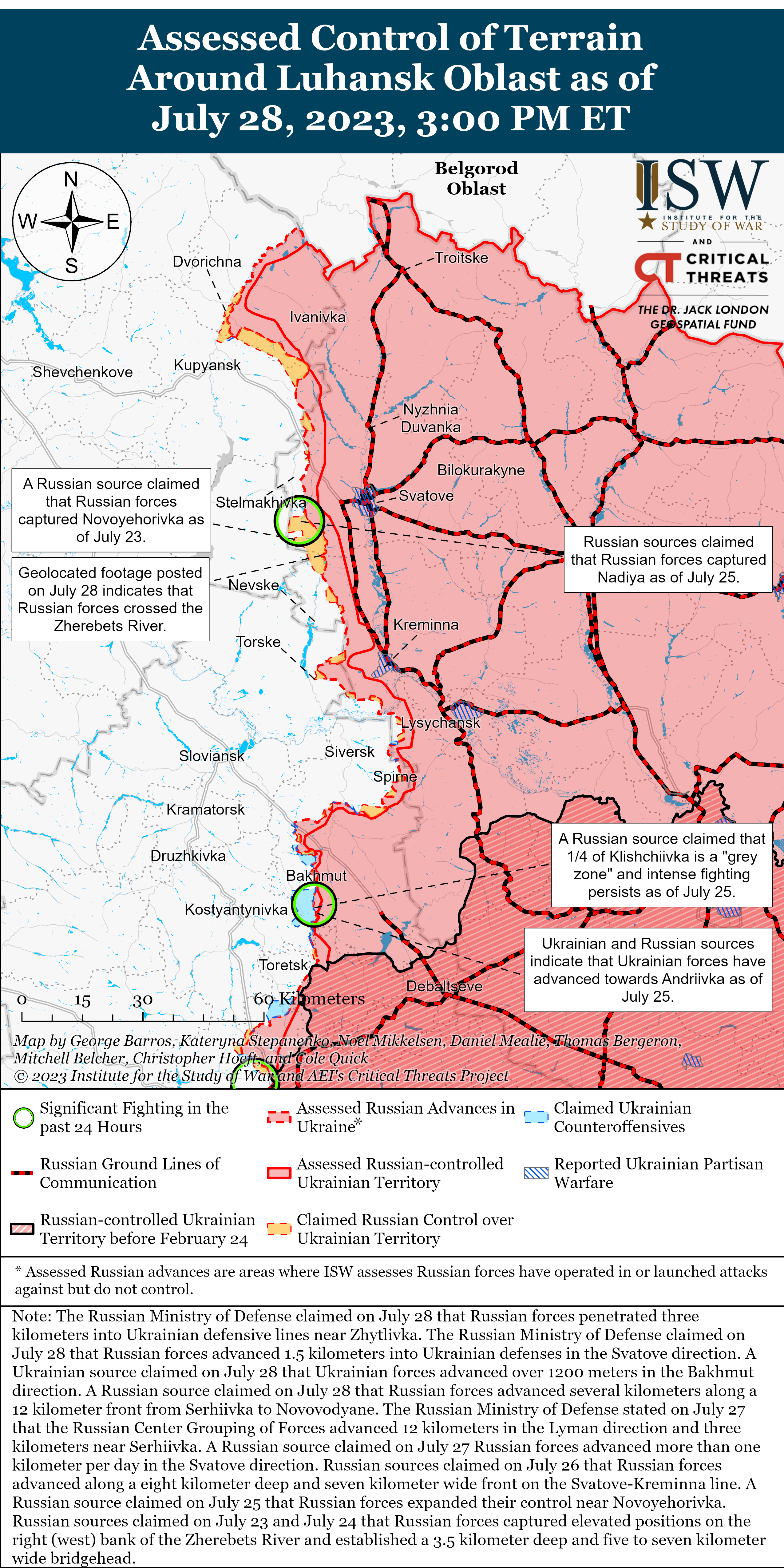 Ukrainian forces continued offensive operations near Bakhmut and reportedly advanced on July 28. A Ukrainian source claimed on July 28 that Ukrainian forces advanced over 1,200 meters in the Bakhmut direction.[48] Ukrainian Deputy Defense Minister Hanna Malyar reported on July 27 that Ukrainian forces continued advancing south of Bakhmut, and the Ukrainian General Staff reported on July 28 that fighting is ongoing north of Bakhmut and south of Bakhmut near Klishchiivka, Kurdyumivka, and Andriivka (all 5-11km south of Bakhmut).[49] Ukrainian Ground Forces Commander Colonel General Oleksandr Syrskyi stated that Ukrainian forces are focusing on counterbattery fire against significant Russian artillery concentrations near Klishchiivka, Kurdyumivka, and Andriivka.[50] A Russian milblogger claimed that Ukrainian forces made some advances near Kurdyumivka and Andriivka.[51] Russian milbloggers claimed that heavy fighting continues near Klishchiivka and that Ukrainian forces conducted unsuccessful ground attacks near Berkhivka (6km northwest of Bakhmut).[52] Geolocated footage posted on July 27 shows a Ukrainian drone striking a Russian TOS-1A thermobaric artillery system in Zaitseve (7km southeast of Bakhmut).[53]