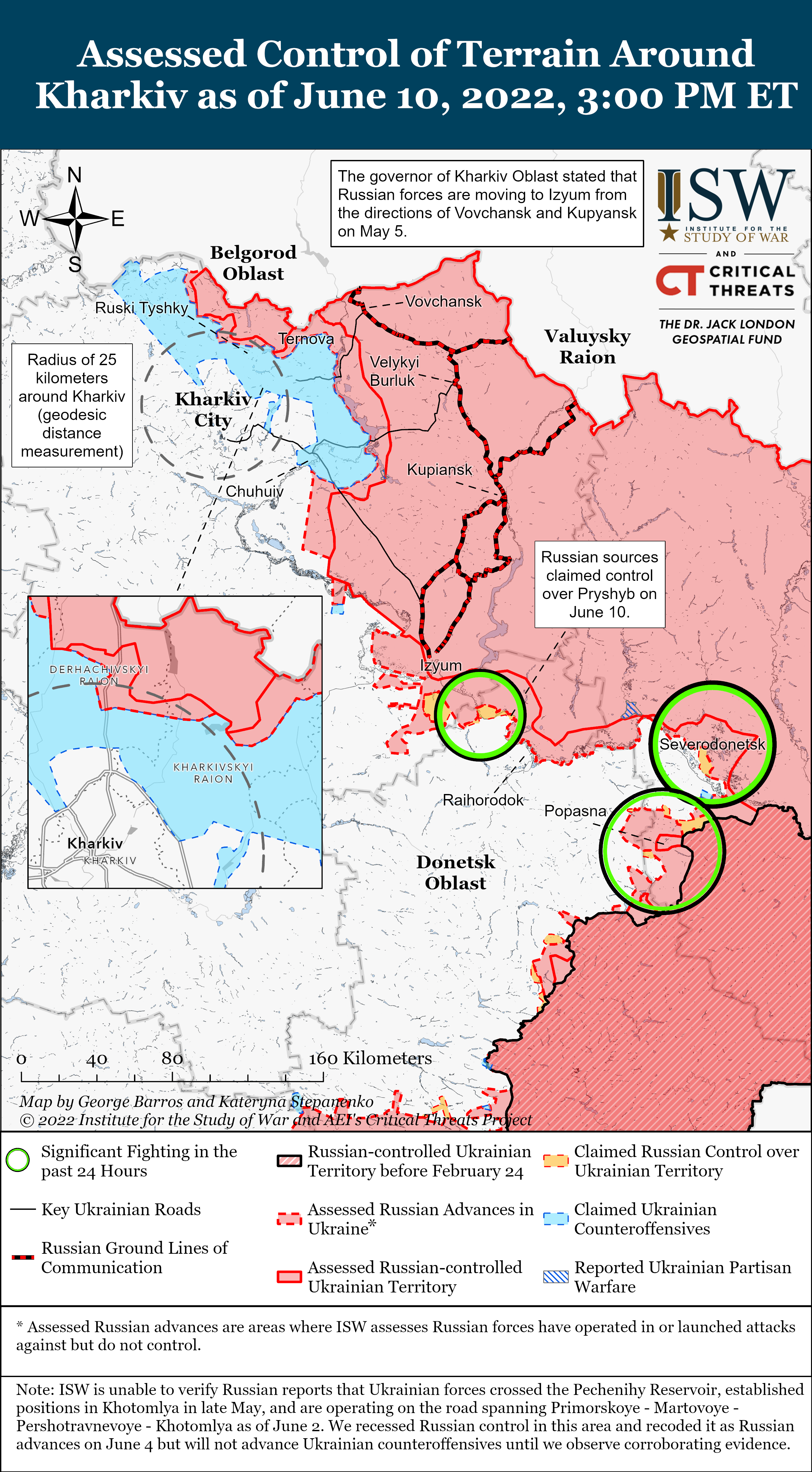 Russian forces continued to prepare for offensive operations from the southeast of Izyum and west of Lyman toward Slovyansk and likely made marginal gains north of Slovyansk on June 10.[9] The Ukrainian General Staff stated that 30 Russian battalion tactical groups (BTGs) are now operating in the direction of Kharkiv Oblast, 10 more than previously reported on June 3.[10] Russian forces on this axis are continuing to prioritize efforts to link advances in southeast Kharkiv Oblast with efforts in northwestern Donetsk Oblast.[11] However, these BTGs have likely suffered heavy combat losses and may be comprised of the remnants of other units. Ukrainian reports of an additional 10 BTGs operating on this axis likely indicate that the Kremlin has reorganized its units and possibly deployed some reinforcements, but it is unlikely that Russian forces have truly increased their available combat power by 50%. Additionally, Russian attacks remain largely road-bound and confined to narrow frontages, and Russian forces will likely struggle to leverage any new weight of numbers.