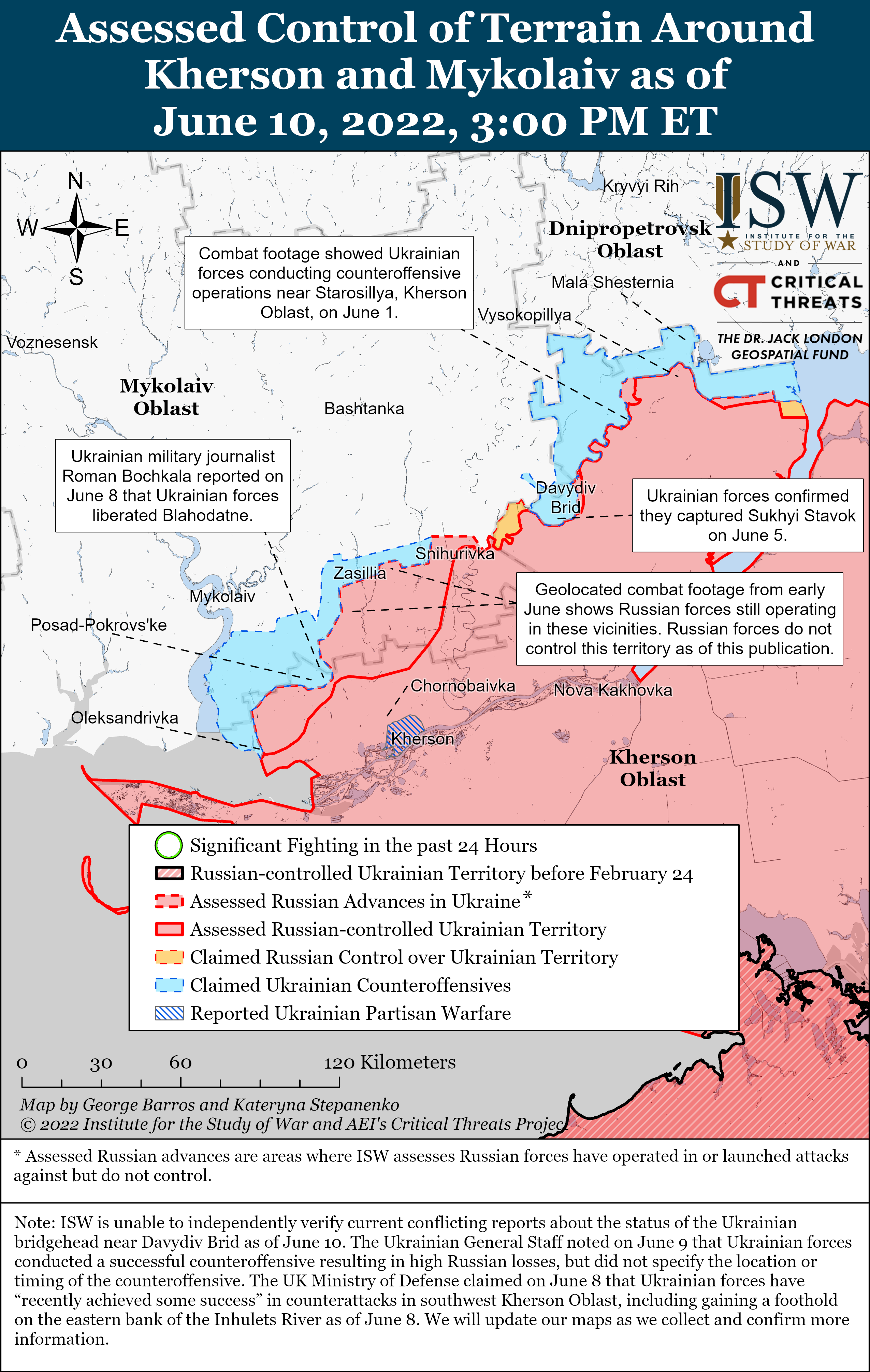 Russian forces continued to strengthen their defensive lines and conducted ground and artillery attacks along the Southern Axis on June 10.[17] The Ukrainian General Staff noted that Russian forces focused on improving the fortification of their second and third lines of defense and carried out camouflage measures to support defensive operations.[18] Russian sources notably claimed that Russian troops took control of the Kinburn Split–a small peninsula near Ochakiv in the northern Black Sea, on the southern border of Mykolaiv and Kherson oblasts.[19] Russian forces have consistently bombarded Ukrainian naval assets in Ochakiv for the last month, and if these Russian claims are true, control of the Kinburn Split will allow Russian troops to exert greater control of the northwestern Black Sea coast. Russian troops continued to fire on various locations in Mykolaiv, Dnipropetrovsk, Zaporizhia, and Kherson oblasts.[20]