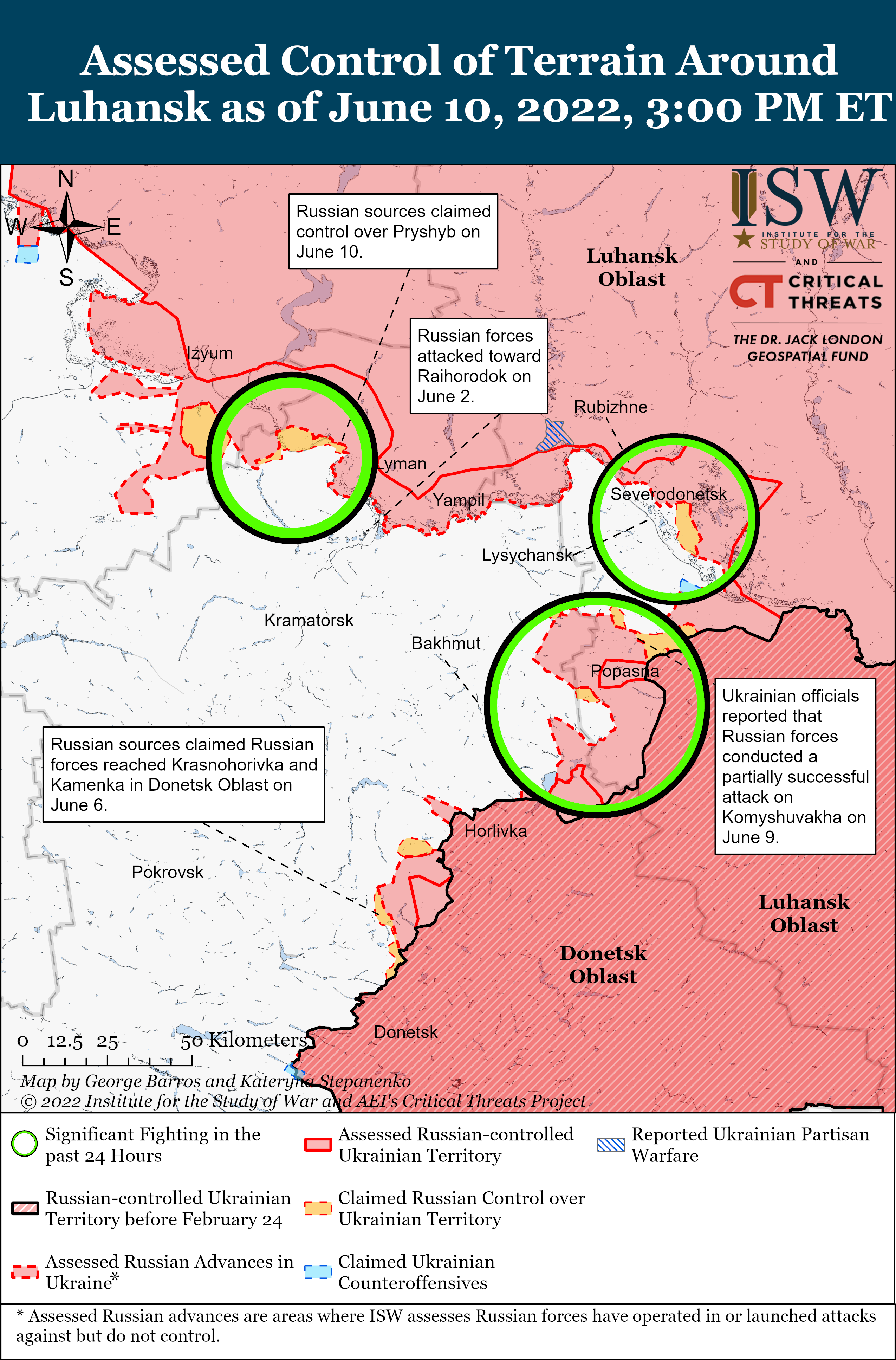 - Russian forces are continuing ground assaults within Severodonetsk but have yet to secure full control of the city as of June 10.