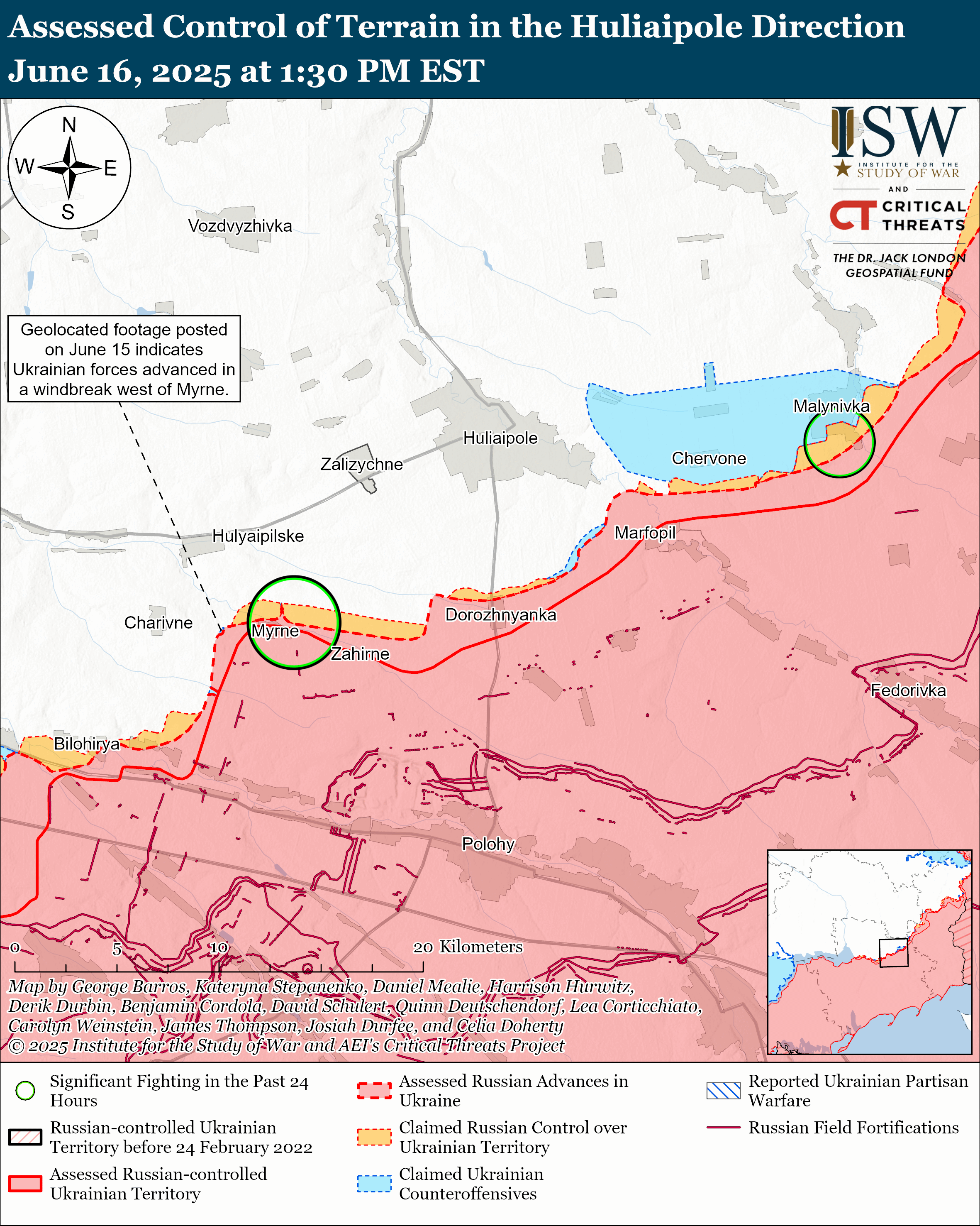 Assessed Ukrainian advances: Geolocated footage published on June 15 indicates that Ukrainian forces recently marginally advanced west of Myrne (east of Orikhiv).[78]