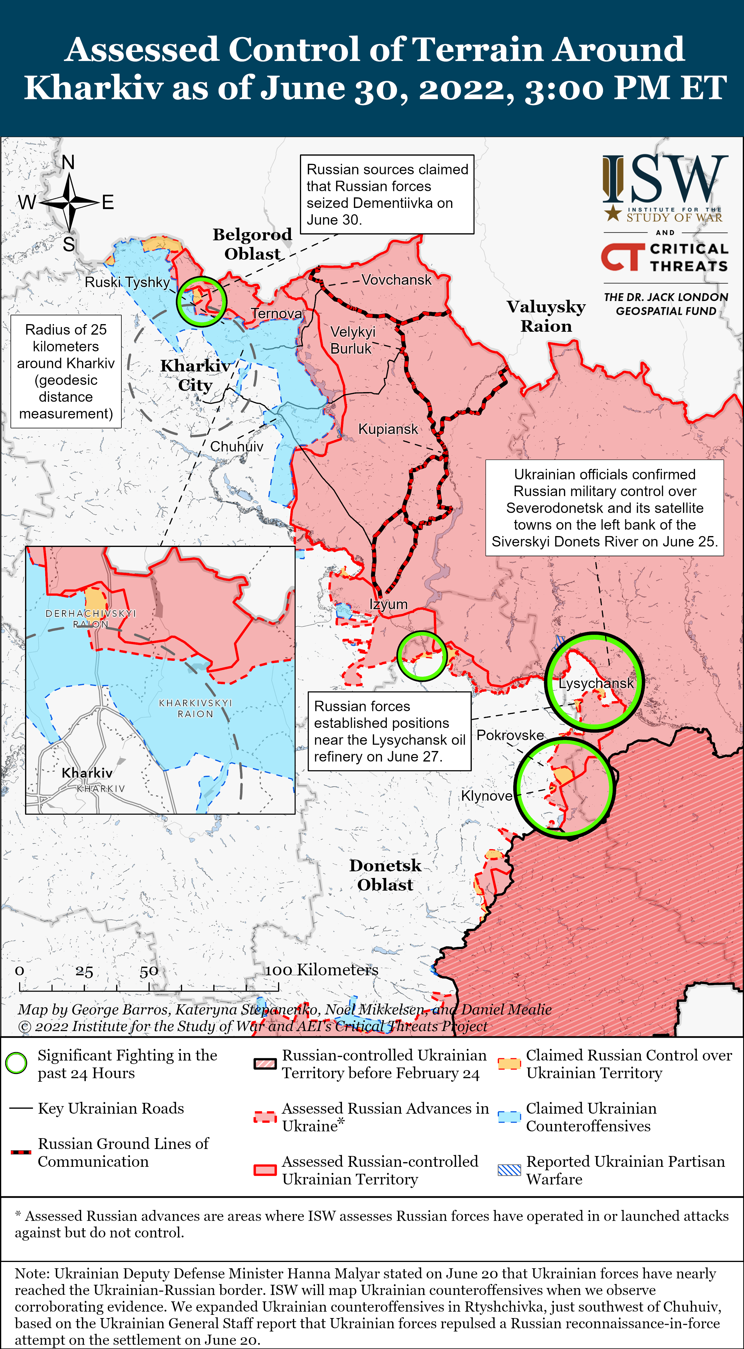 Russian forces continued limited ground assaults to regain positions north of Kharkiv City on June 30.[23] Russian Telegram channels claimed that Russian forces took control of Dementiivka (20km north of Kharkiv City) between June 29 and June 30.[24] Ukrainian sources disputed this claim and stated that fighting is ongoing in Dementiivka, indicating that the current frontlines in northern Kharkiv Oblast continue to be highly contested.[25] Russian and Ukrainian forces reportedly clashed near the international border and fought for control of Udy, Prudyanka, Pytomnyk, Tsupivka, and Velky Prokhody.[26] Russian forces additionally conducted air, artillery, and missile strikes against Ukrainian positions and civilian infrastructure throughout northern Kharkiv Oblast.[27]