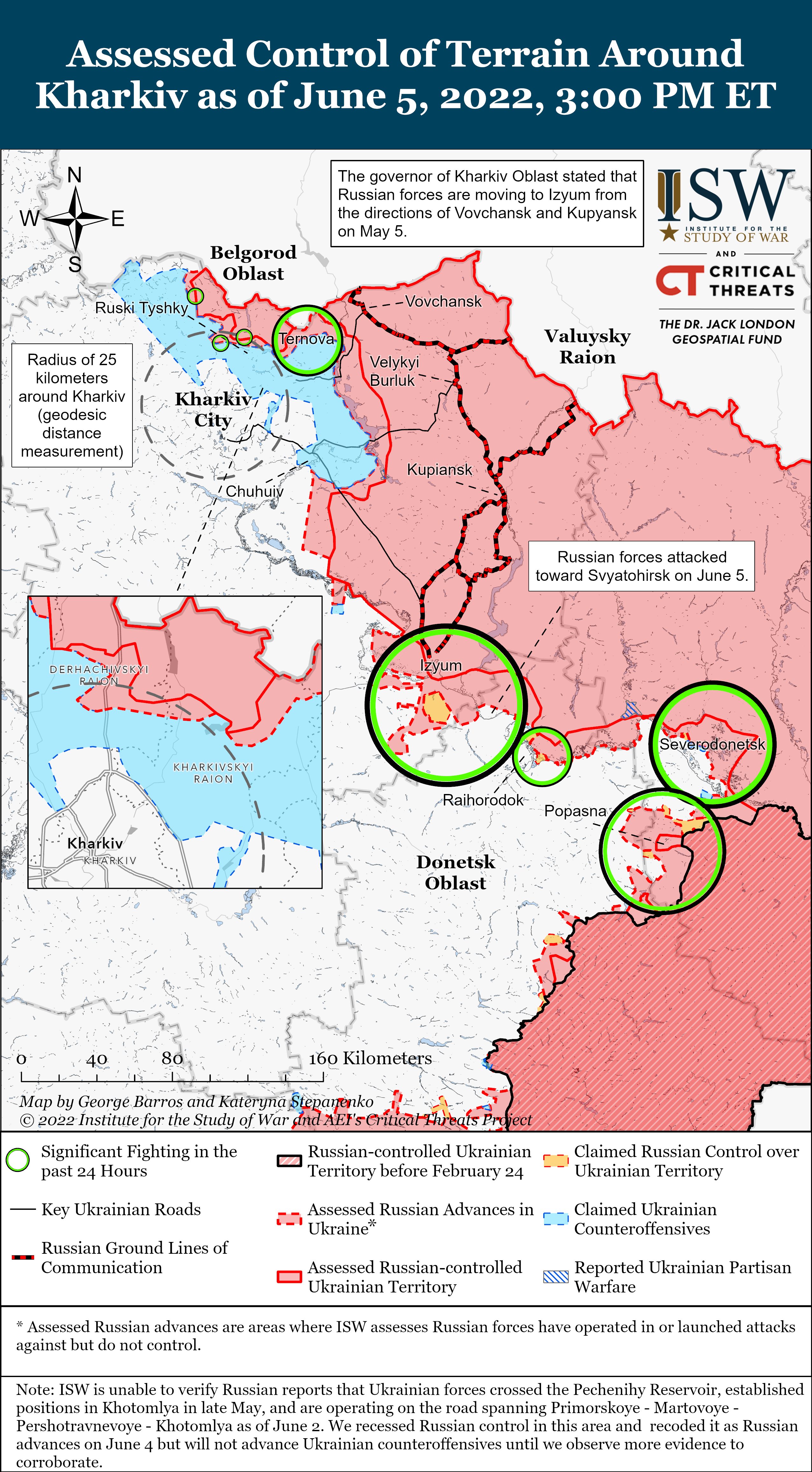 Russian forces are reportedly fighting to hold their occupied positions north of Kharkiv City following limited Ukrainian counterattacks on June 5. A Russian Telegram channel claimed that Ukrainian forces launched a counterattack against Russian positions in northern Kharkiv Oblast and that Ukrainian forces are attempting to advance in Tsupivka, Turove, Velyki Prokhody, Ternova, Rubizhne (the Rubizhne in Kharkiv Oblast, not in Luhansk) and Staryi Saltiv.[21] ISW cannot independently confirm if Ukrainian forces recaptured these locations or are currently contesting them. However, Ukrainian forces likely seek to take advantage of the Russian focus on Severodonetsk to make prudent counterattacks in other sectors. Russian forces continued artillery strikes against Kharkiv City and its environs and fired on Tsyrkuny, Derhachi, Ruski and Cherkasy Tyshky, Staryi Saltiv, and Kozacha Lopan.[22]