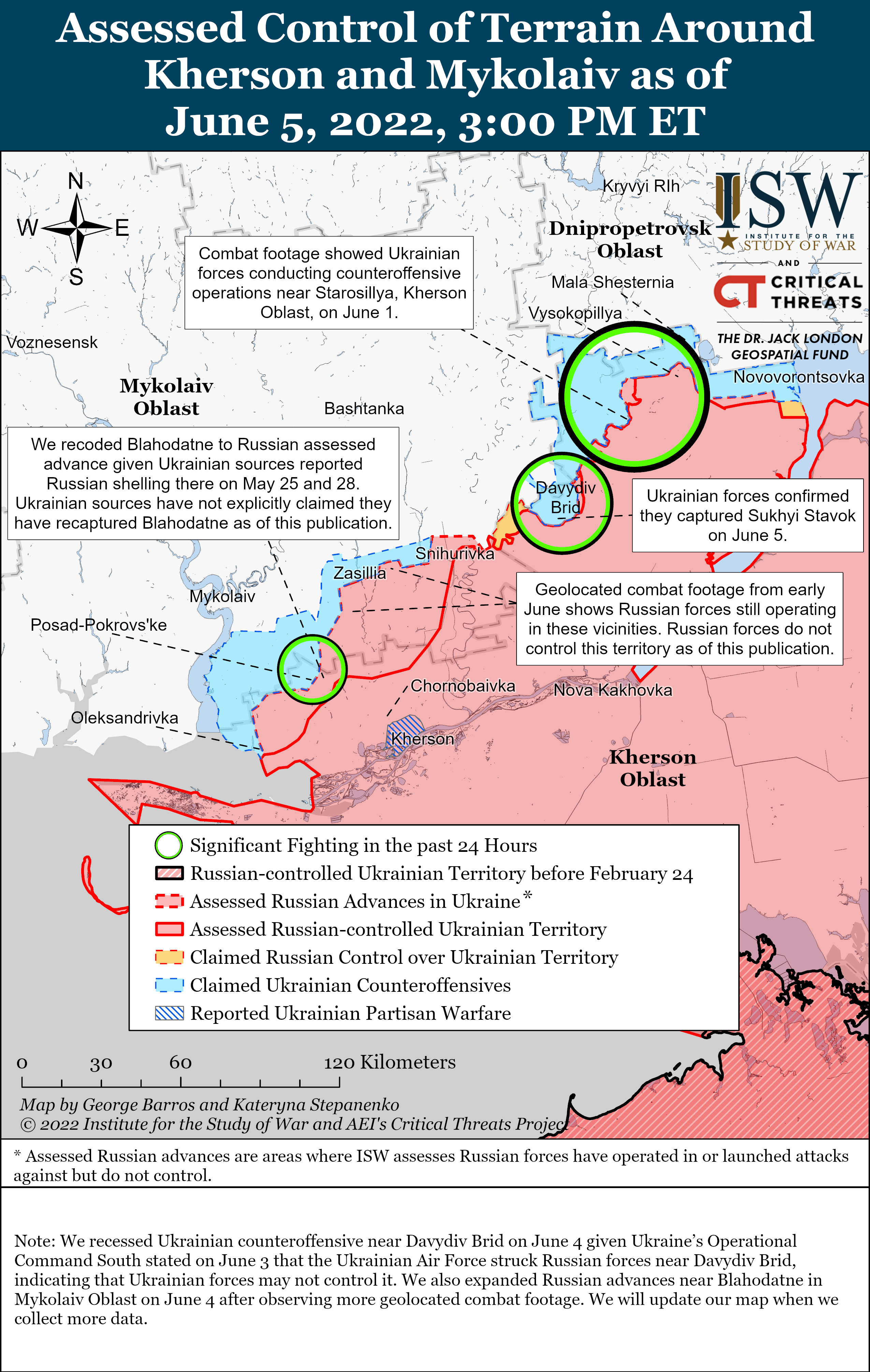 Russian forces continued to hold their defensive lines and fire on Ukrainian positions along the Southern Axis on June 5.[23] The Ukrainian General Staff reported that Russian forces mined the bank of the Inhulets River in anticipation of Ukrainian counteroffensives in Kherson Oblast, indicating that Russian troops are feeling the pressure of recent localized Ukrainian counterattacks along the Kherson-Mykolaiv Oblast border.[24] Russian troops continued unsuccessful ground assaults in northern Kherson around Vysokopillya and Kochubeivka and intensively fired on the line of contact in Zaporizhia, Dnipropetrovsk, and Mykolaiv Oblasts.[25]