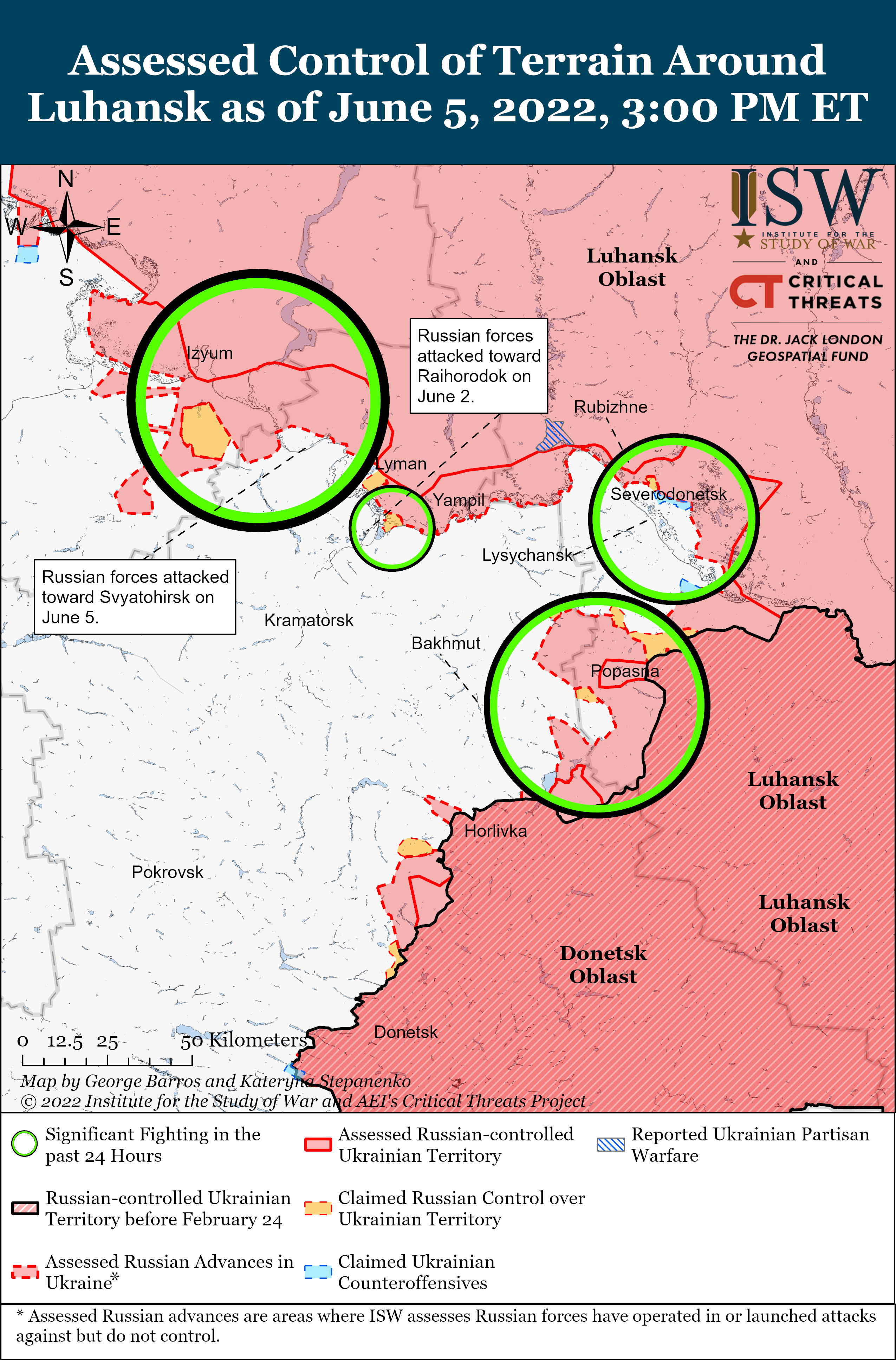 Ukrainian forces conducted further counterattacks in Severodonetsk on June 5, halting Russian advances and recapturing large areas of the city. Head of the Luhansk Regional State Administration Serhiy Haidai stated that Ukrainian forces have recaptured 70% of Severodonetsk from Russian forces in the last two days and that Russian forces now only control the eastern outskirts of the city.[13] A Russian Telegram channel additionally stated that a limited Ukrainian counterattack pushed Russian troops out of Syrotne and Lisna Dacha, villages on the southern outskirts of Severodonetsk.[14] Russian forces continued to carry out artillery, mortar, and MLRS strikes to support operations in Severodonetsk, Lysychansk, Toshkivka, and Ustynivka.[15] Ukrainian counterattacks in Severodonetsk will likely force Russian commanders to commit additional degraded units and equipment to the area to halt successful Ukrainian efforts to roll back gains Russian forces took over a week to secure.[16]