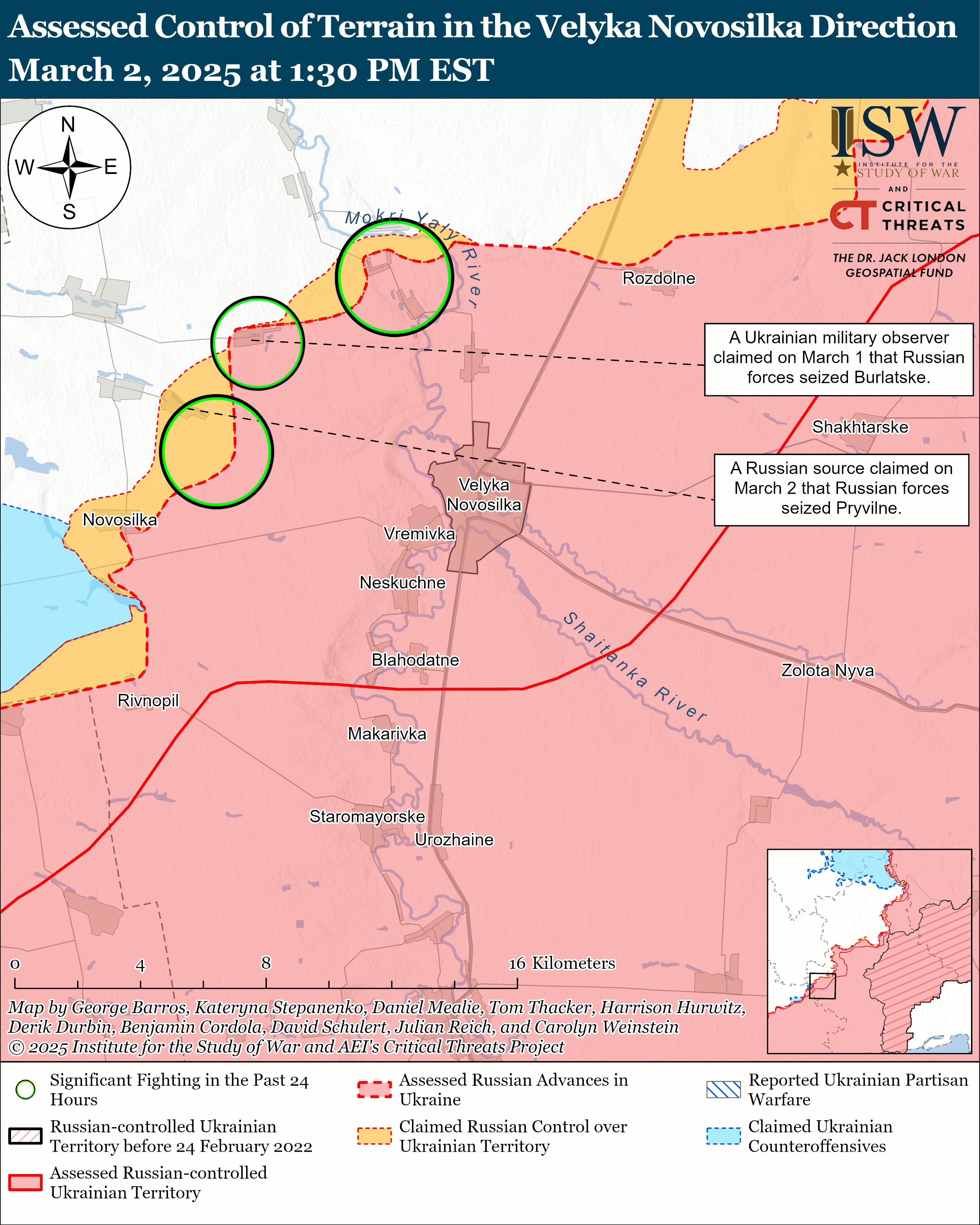 Russian forces continued assaults west of Kurakhove near Oleksiivka, Andriivka, Ulakly, Kostyantynopil, and Rozlyv on March 1 and 2.[61] A Ukrainian brigade operating in the Kurakhove direction posted footage on March 1 showing Ukranian forces repelling a reinforced platoon-sized Russian mechanized assault in an unspecified area of this direction.[62]