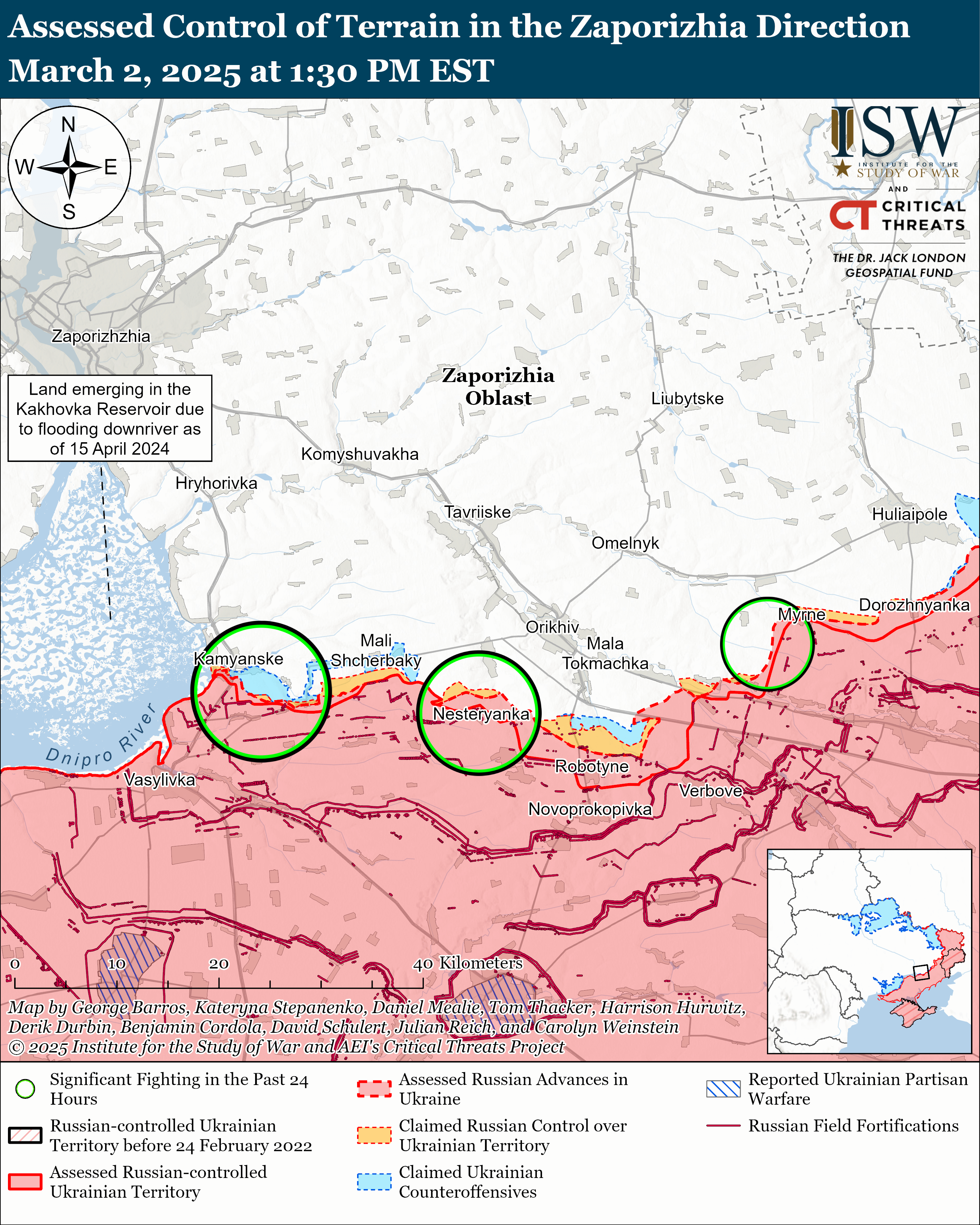 Unconfirmed Russian-claimed advances: Russian sources claimed on March 2 that Russian forces advanced six kilometers in the Orikhiv direction and advanced towards Shcherbaky and near Mali Shcherbaky (northwest of Robotyne).[69]