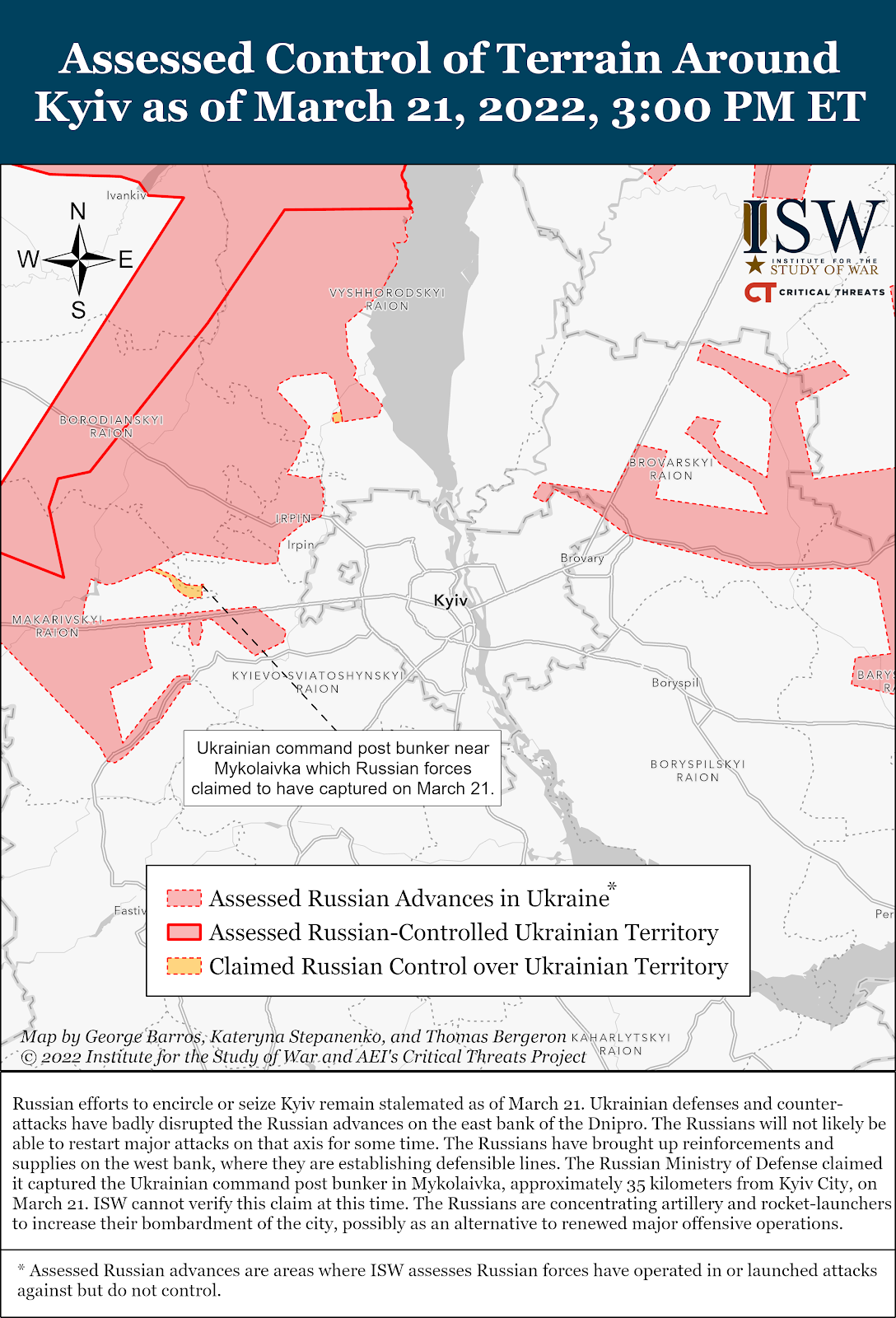 Russian forces did not conduct any offensive operations northwest of Kyiv on March 21.[10] Russian forces continued to deploy engineering equipment to fortify their forward positions around Kyiv and continued efforts to improve their logistics. The UK Ministry of Defense stated on March 21 that Russia’s primary military objective in Ukraine remains encircling Kyiv, but they are unlikely to successfully do so in the coming weeks.[11] The Ukrainian General Staff reported that Russian forces northwest of Kyiv continue to unsuccessfully prepare for resuming major offensive operations.[12] The Russian Ministry of Defense claimed that Russian forces captured a Ukrainian command bunker in Mykolaivka, approximately 30km directly west of Kyiv, but ISW cannot independently confirm this Russian claim.[13]