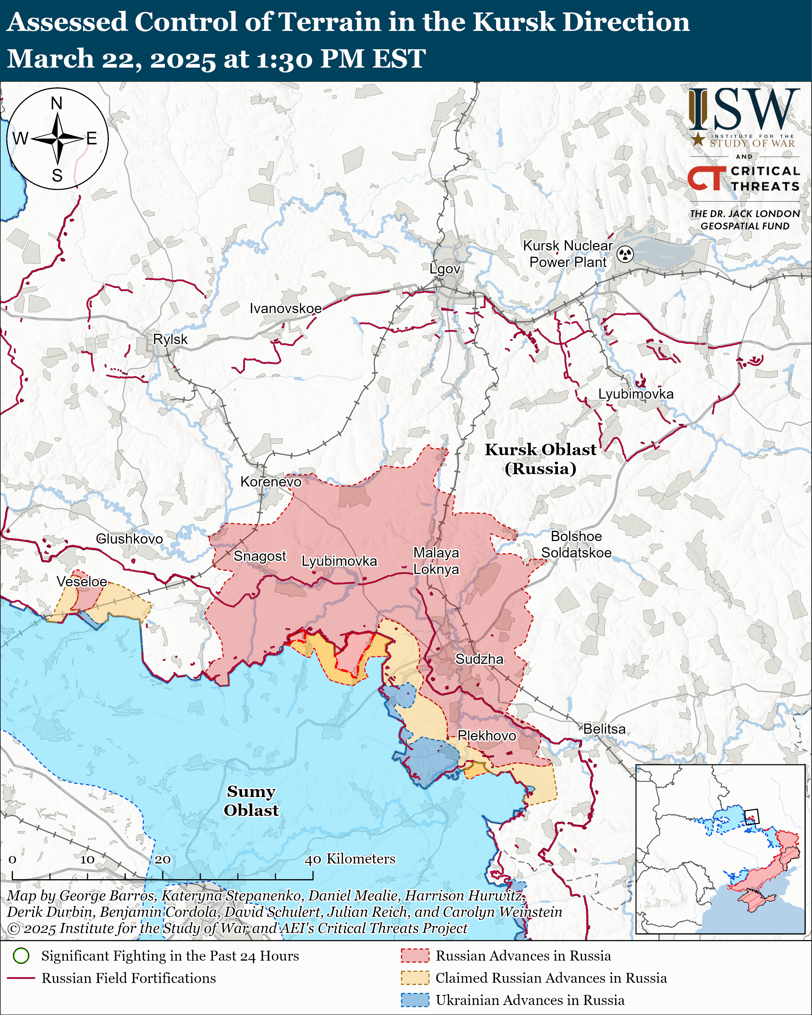 Witkoff’s statements undermine US President Donald Trump’s stated desired end state for the war in Ukraine that achieves an enduring peace and is in the best interests of the United States, Ukraine, and Europe. Trump has said that the United States will try to return as much territory to Ukraine as possible.[27] Trump also recently stated that the United States is interested in taking control of the Zaporizhzhia Nuclear Power Plant (ZNPP), which Russian forces currently occupy — implying that Russia would have to cede this territory in Zaporizhia Oblast before the United States can take control of the ZNPP.[28] Witkoff’s March 21 presentation of Russia’s territorial demands for the entirety of Luhansk, Donetsk, Zaporizhia, and Kherson oblasts — including areas of these four oblasts that Russian forces do not currently occupy — undermines Trump’s efforts to achieve a resolution to the war favorable to US interests. Ceding territory in these four oblasts to Russia — either along the current frontlines or along the oblasts’ administrative boundaries – would not provide Ukraine with the defensible lines required to reliably defend against renewed Russian aggression in the future, hindering Trump’s stated objective of securing a lasting, sustainable peace in Ukraine.[29] Witkoff also claimed that Ukrainian officials have “conceded” that Ukraine will not be a member of NATO — a preemptive US concession to Russia on one of the Kremlin’s main demands as Russia continues to make no concessions in return. Witkoff’s statements appear to yield to multiple Kremlin demands before the start of official negotiations for a peace settlement, ceding valuable US and Ukrainian leverage over Russia in future negotiations that the United States will need in order to achieve Trump’s desired end to the war.