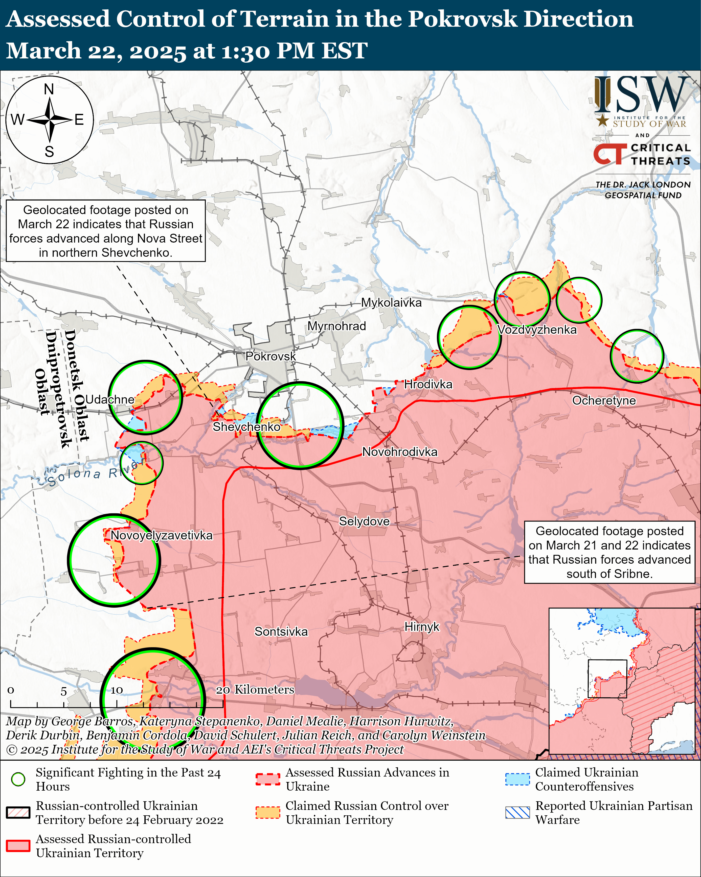 Assessed Russian advances: Geolocated footage published on March 22 indicates that Russian forces recently advanced within northern Shevchenko (southwest of Pokrovsk) and south of Sribne (southwest of Pokrovsk).[66]