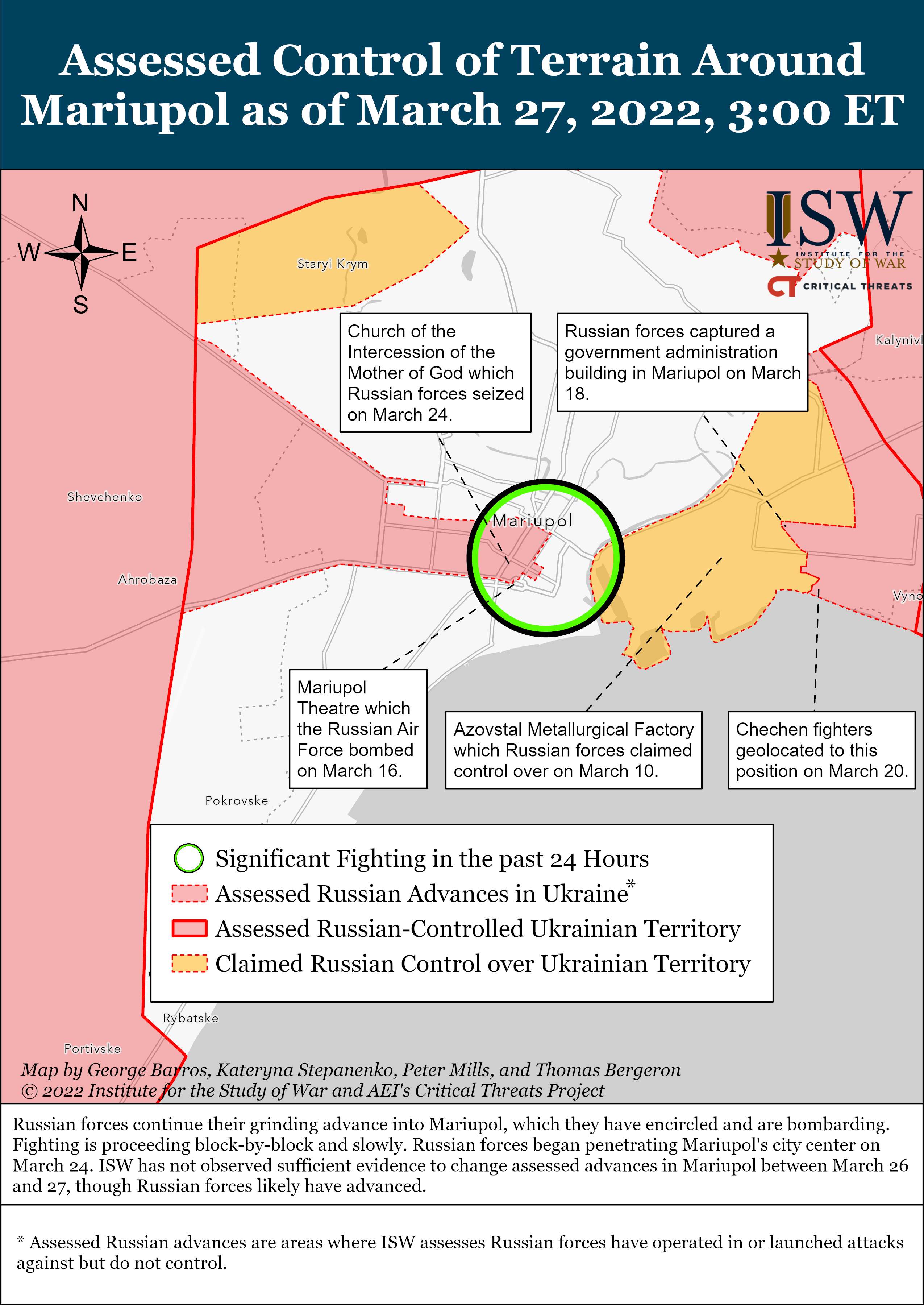 Russian assaults on central Mariupol continued on March 27, though ISW cannot confirm any changes in control of terrain.[23] Russian forces will likely gain control of the city in the relatively near future.