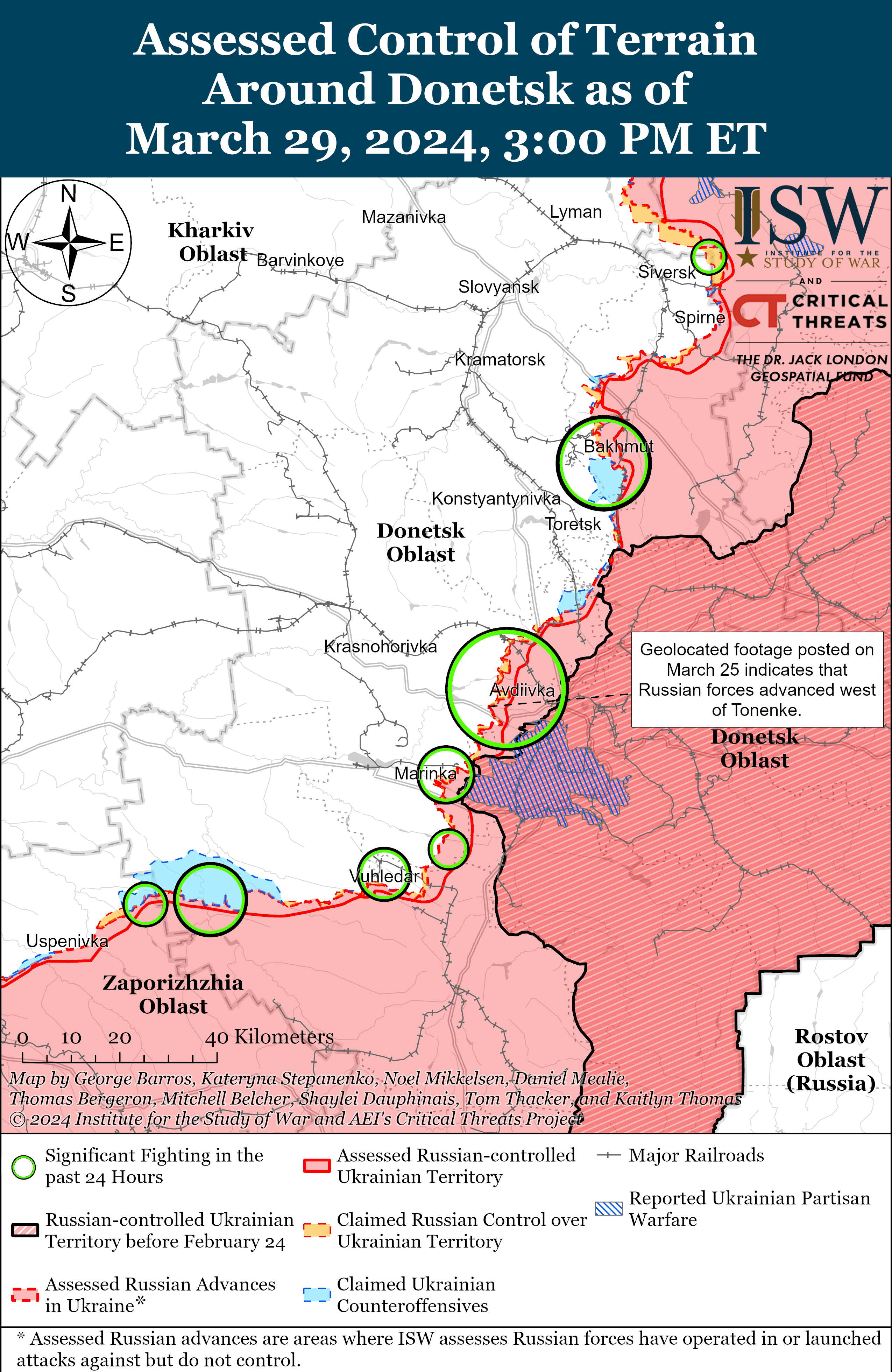 - Russian forces recently made confirmed advances near Bakhmut, Avdiivka, and Donetsk City and in the Donetsk-Zaporizhia Oblast border area amid continued positional engagements along the entire line of contact on March 29.