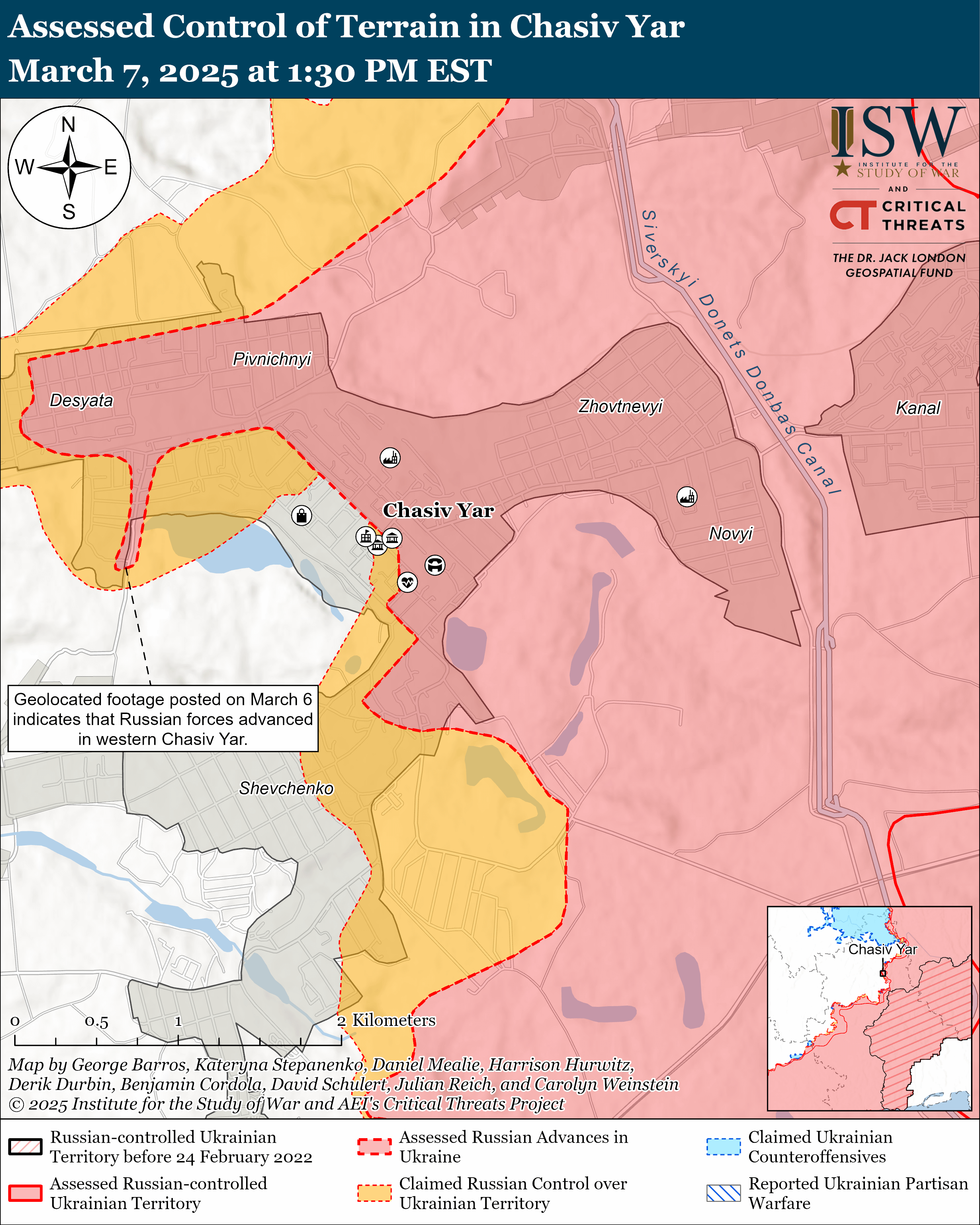 The March 6 Russian mechanized assault is part of an ongoing Russian effort to seize and break out of Chasiv Yar, advance on the northeastern outskirts of Kostyantynivka, and pressure Ukraine’s “fortress belt” – a 50-kilometer-long line of four major cities that forms the backbone of Ukraine’s defenses in Donetsk Oblast.[22] ISW previously assessed that a multi-axis campaign against Ukraine’s “fortress belt” would take Russian forces several years to complete, but this assessment is highly dependent on the provision of Western aid.[23] Any long-term pauses or the cessation of US aid to Ukraine will likely significantly impact Ukraine’s ability to defend against Russian advances and frontline strikes in the Kostyantynivka direction and will advantage Russian offensive operations along the entire frontline.