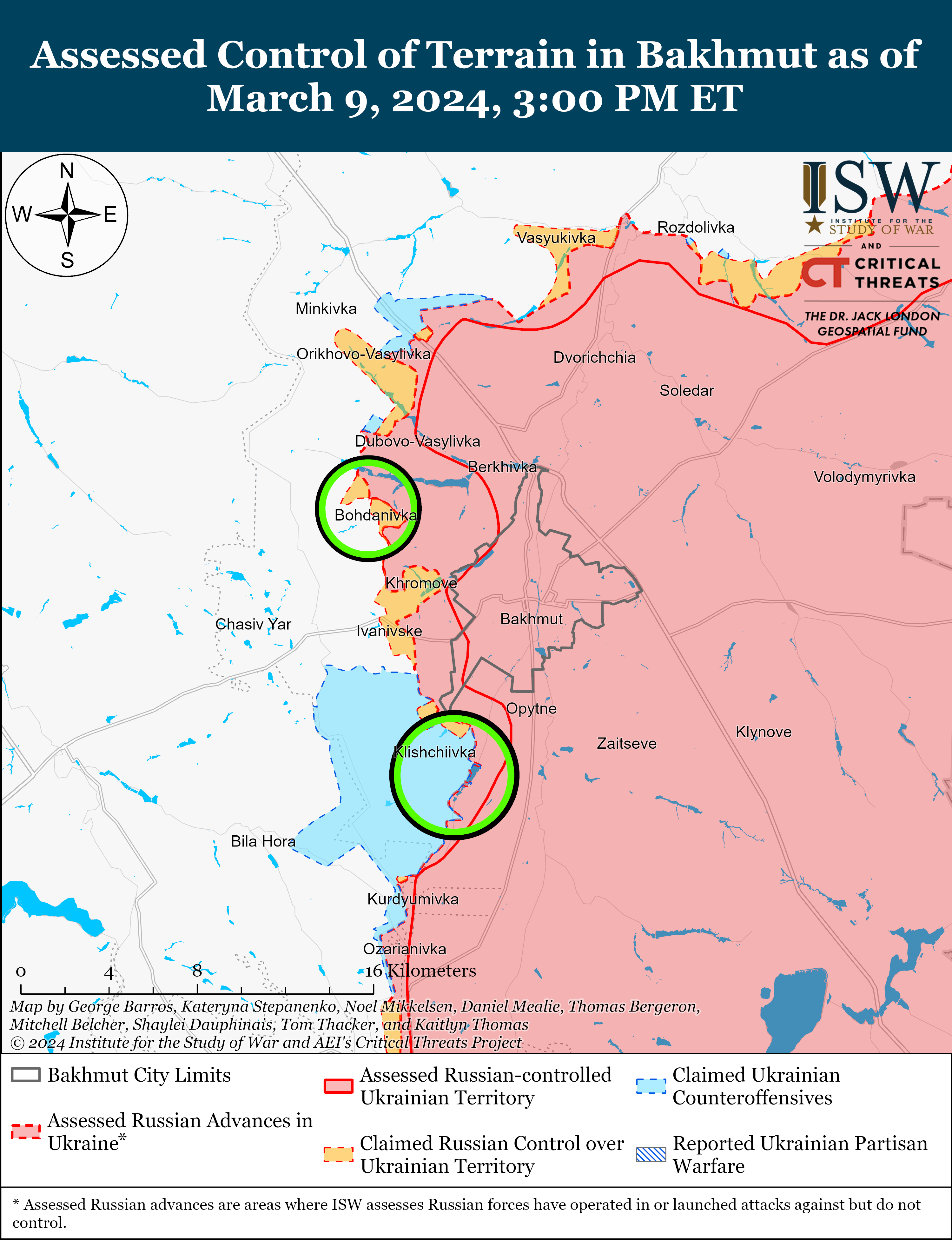 Positional fighting continued near Bakhmut on March 9, but there were no confirmed changes to the frontline. A Russian milblogger claimed that Russian forces marginally advanced within Ivanivske (west of Bakhmut) and that Russian forces control over half the settlement, but ISW has not observed visual confirmation of these claims.[24] Positional fighting continued northwest of Bakhmut near Bohdanivka; west of Bakhmut near Ivanivske; southwest of Bakhmut near Klishchiivka and Andriivka; and south of Bakhmut near Druzhba and Shumy.[25] Elements of the Russian “Vostok-V” Volunteer Brigade (Russian Volunteer Corps) are reportedly operating near Bohdanivka.[26]