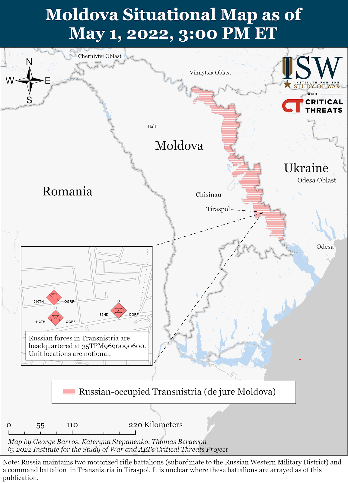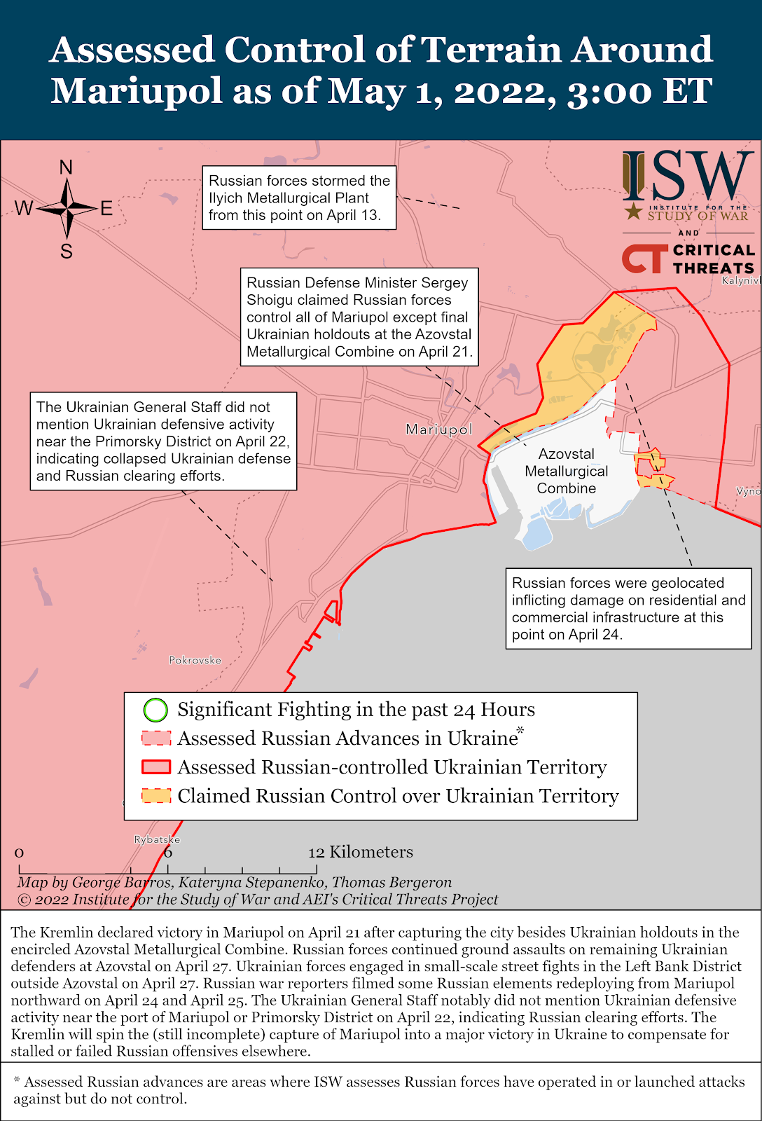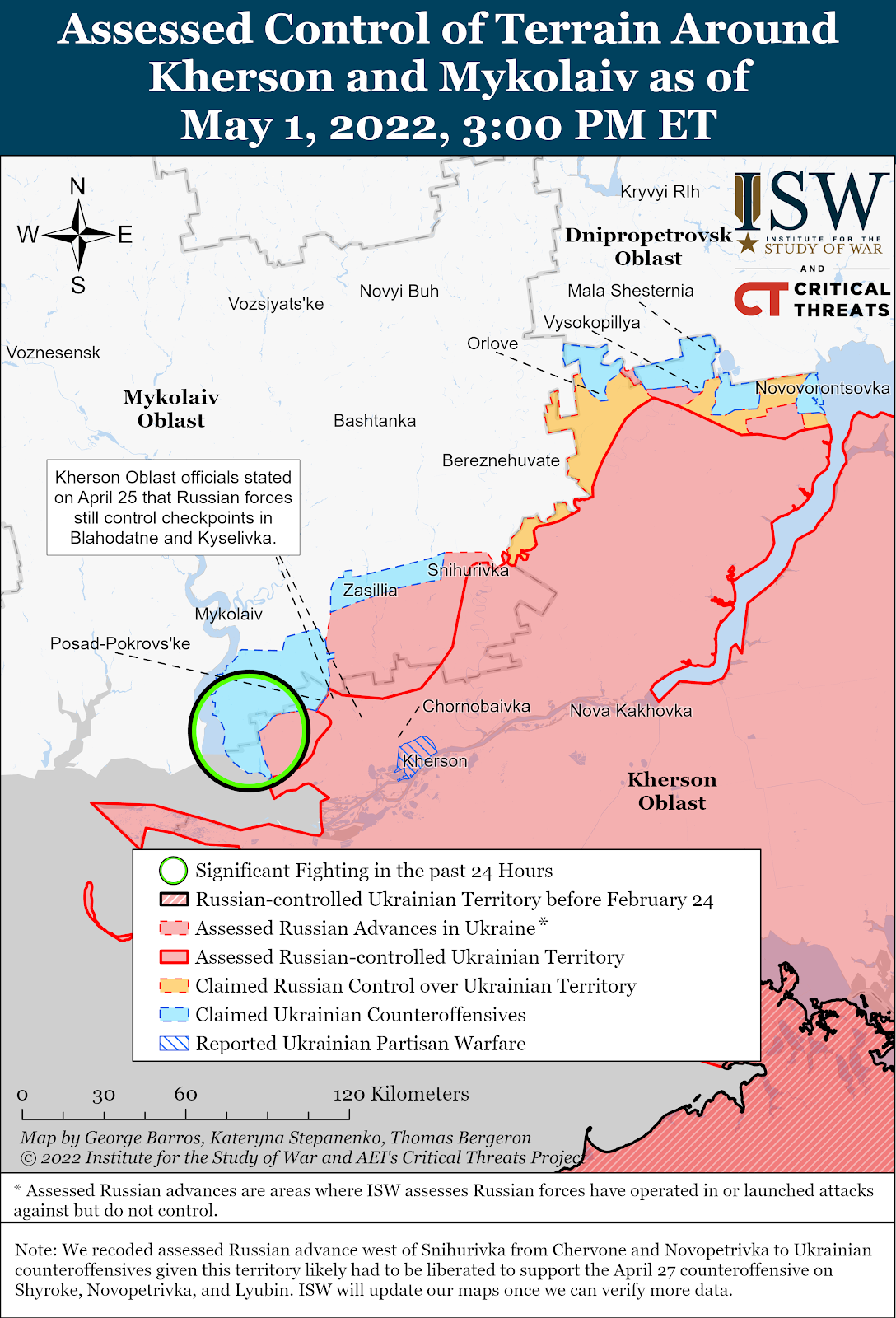 Russian forces continued regrouping and reconnoitering on the Southern Axis and did not make any confirmed advances on May 1.[20] The Ukrainian General Staff reported that Russian forces are attempting to set conditions to mount an offensive in the directions of Mykolaiv and Kryvyi Rih, although ISW cannot independently confirm this forecast at this time.[21] A Russian assault on Mykolaiv and Kryvyi Rih that occurs simultaneously with the battle for Donbas would divide Russian efforts and resources on the Southern Axis in a manner reminiscent of the initial failed Russian invasion plan.