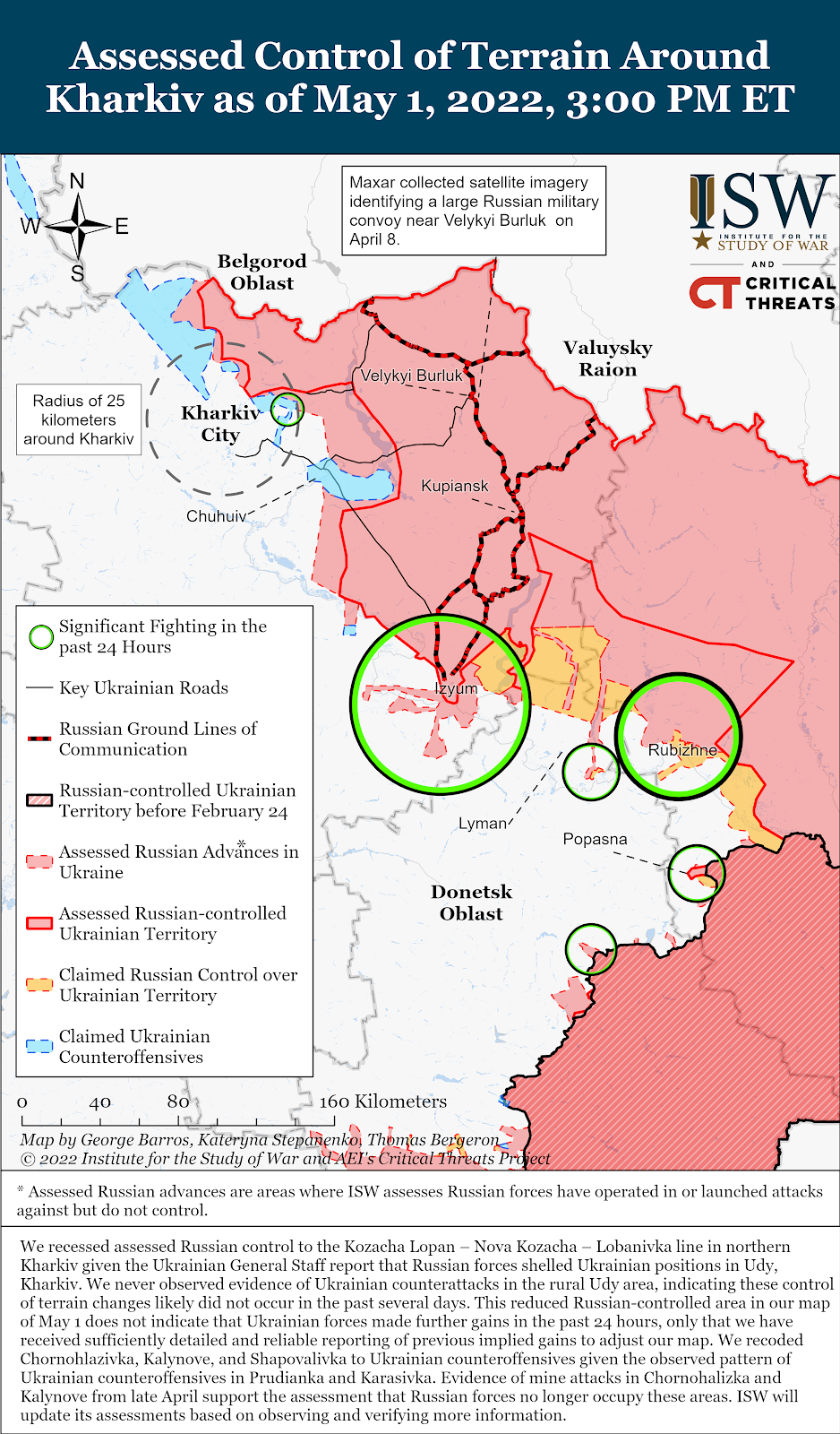 Russian forces continued to conduct unsuccessful ground assaults along the Donetsk-Luhansk frontline and did not make any substantial territorial gains on May 1.[8] Russian troops continued to focus efforts on completing the seizures of Rubizhne and Popasna with ground assaults supported by artillery.[9] The Ukrainian General Staff stated that Russian forces are blocking Ukrainian positions in the vicinity of Rubizhne and Popasna to prevent Ukrainian forces from maneuvering.[10] The Ukrainian General Staff also reported that Russian forces made limited advances in the direction of Lyman via Krymky and Oleksandrivka and attempted to advance toward Kurakhove via Olenivka and Novomykhailvka.[11]