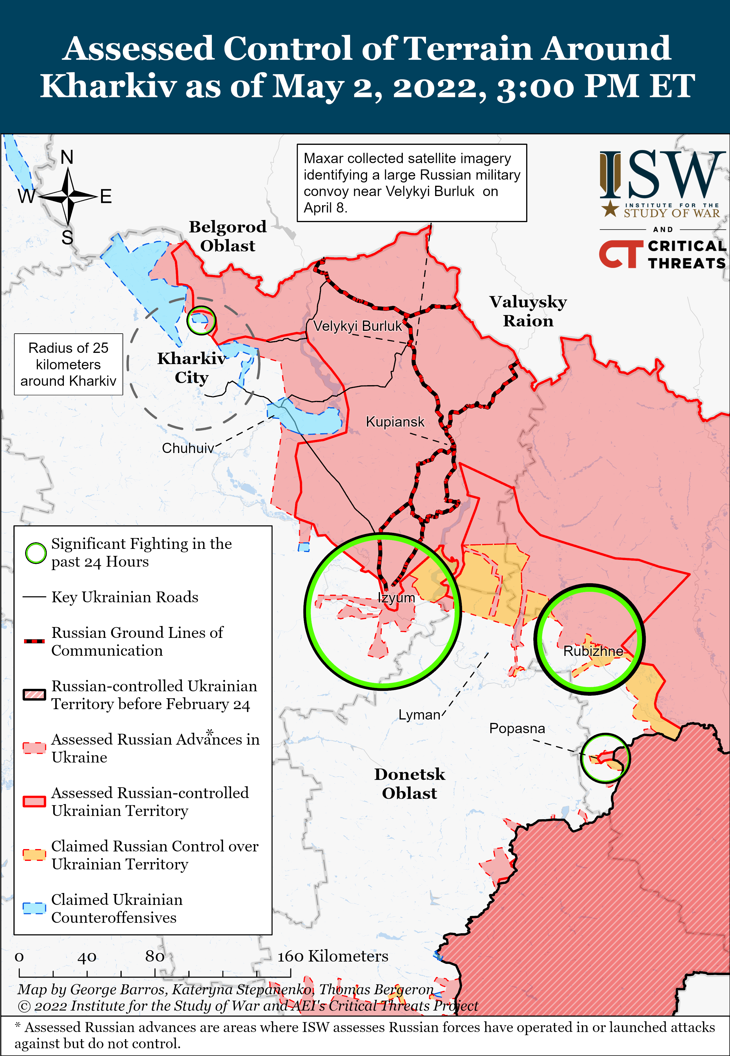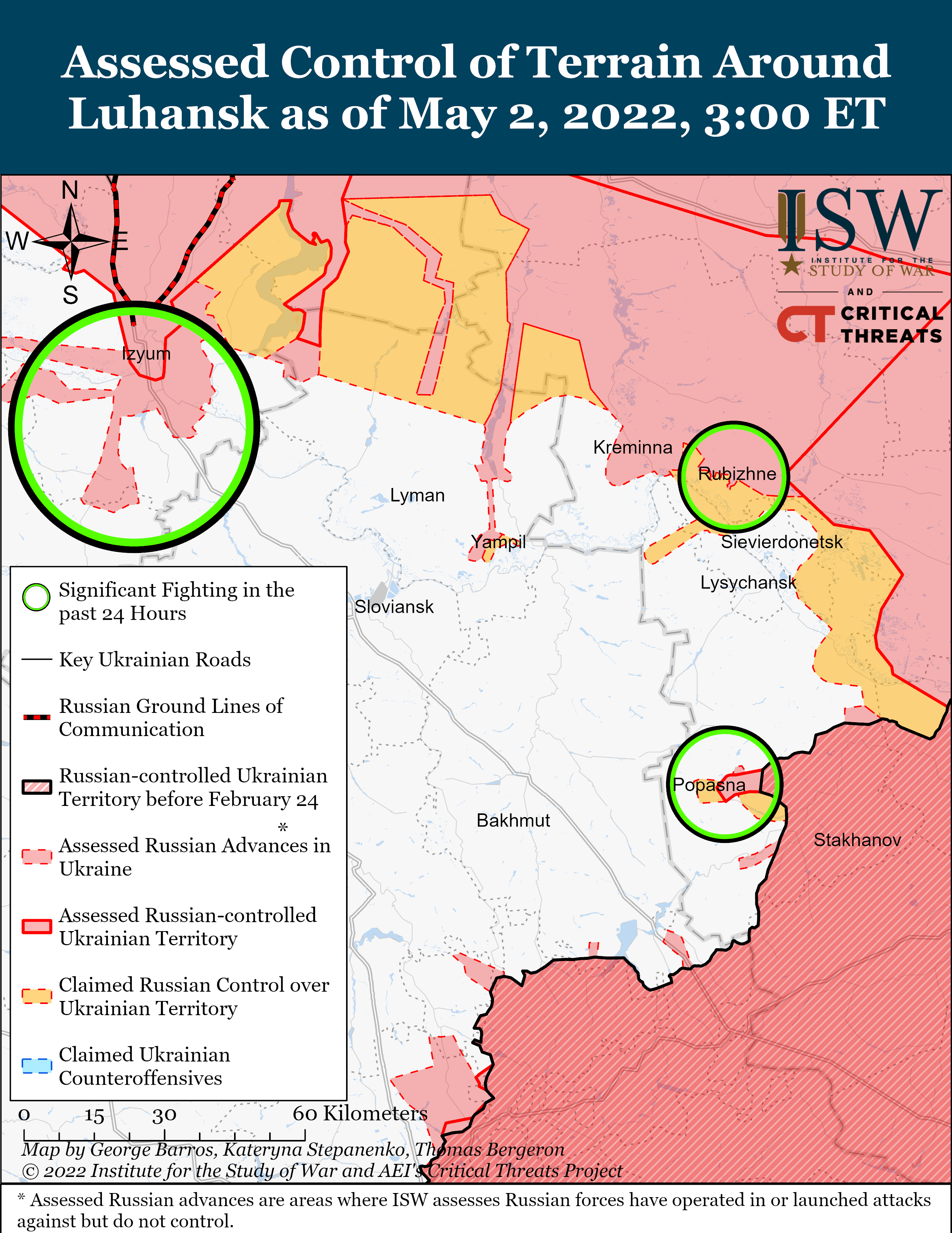 - The April 30 Ukrainian artillery strike on Russian command headquarters near Izyum likely disrupted Russian operations on the Izyum axis and may hinder Russian offensives from Izyum for the next few days.