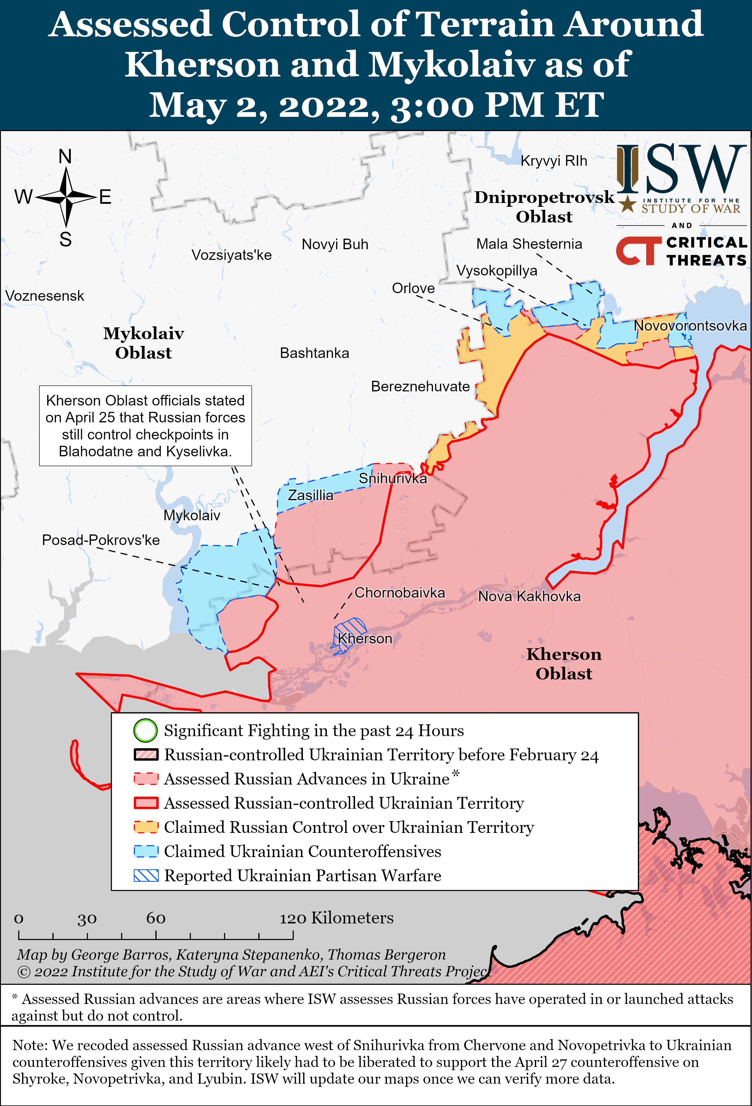 Russian forces continued to regroup, reconnoiter, and concentrate logistics on May 2, likely in preparation for ground assaults on Ukrainian position in the directions of Mykolaiv, Kryvyi Rih, and Zaporizhia.[13] The Ukrainian General Staff reported that Russian forces deployed an unspecified artillery unit to Tokmak that will likely support Russian attempts to seize Orihiv, Zaporizhia Oblast.[14] Orihiv is on the intersection of several major highways, and its seizure could allow Russian forces to push toward Zaporizhia city as well as Donetsk. Russian forces also reportedly established an equipment repair shop in an occupied Zaporizhia Oblast settlement.[15]