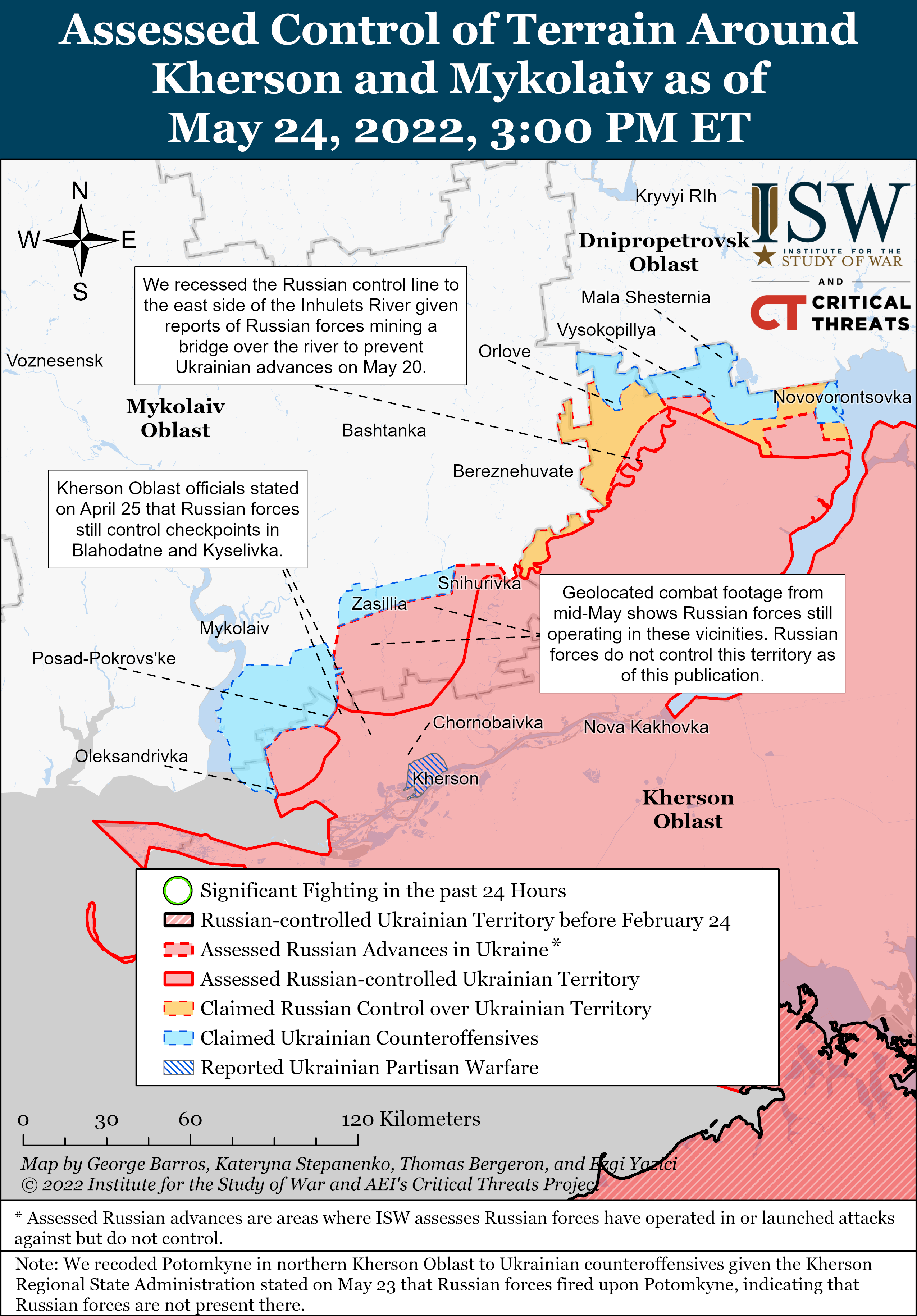 Russian forces continued to reinforce their positions on the Southern Axis but did not make any confirmed advances on May 24.[29] Russian troops are reportedly strengthening their grouping in Vasylivka and Kamyanske (both south of Zaporizhzhia City) in preparation for offensives to the north.[30] The Ukrainian General Staff noted that Russian troops in Crimea are forming reserves and a spokesman for the Odesa Military Administration stated that Russian forces are reportedly deploying S-400 missile systems to northwest Crimea. Russian milblogger Alexander Zhuchkovsky, however, called the situation on the Zaporizhia frontline of the Southern Axis “deplorable,” and indicated that Ukrainian artillery pressure has been effective in slowing Russian troop movements.[31] Zhuchkovsky noted that Zaporizhia Oblast is not a priority for Russian command and much of the Russian grouping in the area is comprised of reservists. His assertion is corroborated by the fact that Russian forces continued to shell Ukrainian positions in Kherson, Zaporizhia, and Dnipropetrovsk Oblasts on May 24, but did not engage in any active ground attacks.[32]