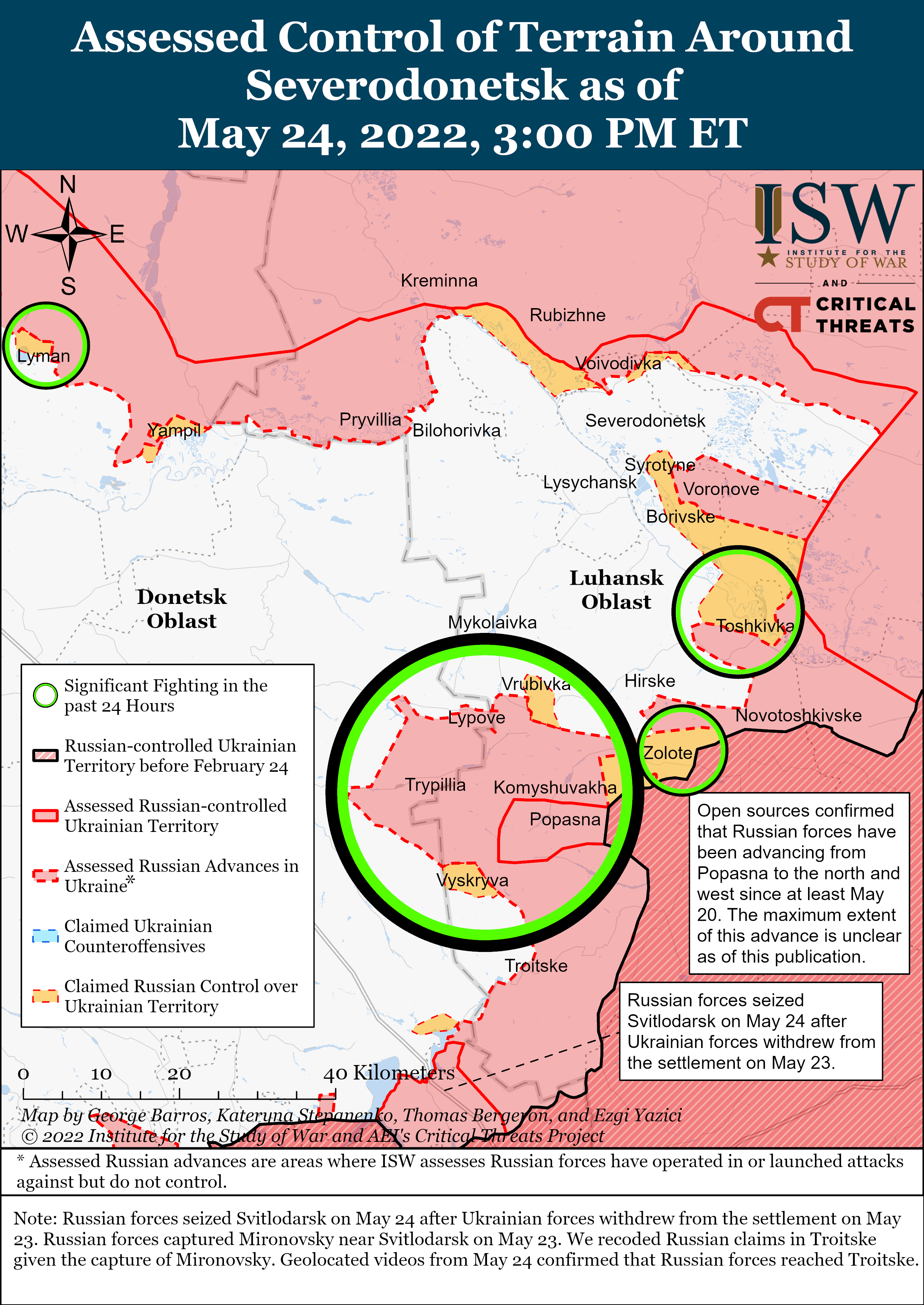 - The Russians will continue efforts to encircle Severodonetsk and Lysychansk at least from the south, possibly by focusing on cutting off the last highway connecting Severodonetsk-Lysychansk with the rest of Ukraine.