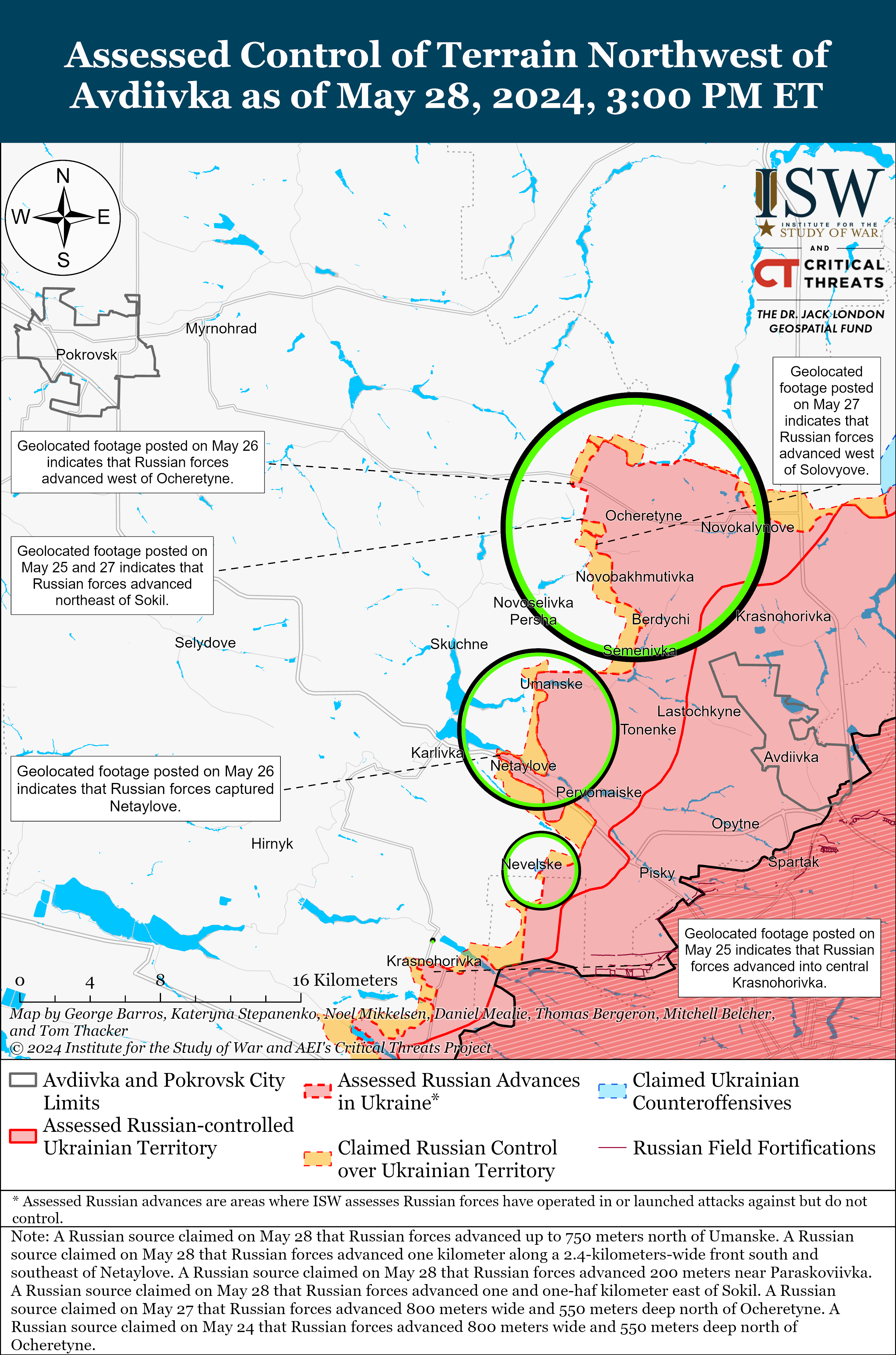 Russian forces recently marginally advanced during a platoon-sized mechanized attack northwest of Avdiivka. Geolocated footage published on May 28 shows that Russian forces marginally advanced in fields east of Novopokrovske (northwest of Avdiivka) during a roughly platoon-sized mechanized attack before Ukrainian forces repelled the attack.[78] Russian milbloggers also claimed that Russian forces advanced 750 meters north of Umanske (west of Avdiivka), 2.4 kilometers in width and one kilometer deep south and southeast of Netaylove (south of Umanske and southwest of Avdiivka), and approached the Karlivske Reservoir (west of Umanske) and Karlivka (west of Netaylove) from this flank.[79] Some Russian milbloggers claimed that Russian forces have begun fighting for Karlivka itself, while others claimed that the informational fog of war makes it too early to tell.[80] ISW has not yet observed visual evidence of Russian advances near Umanske or Netaylove. Russian forces also continued ground assaults northwest of Avdiivka near Novooleksandrivka, Prohres, Novoselivka Persha, Kalynove, Ocheretyne, and Sokil; west of Avdiivka near Yasnobrodivka; and southwest of Avdiivka near Nevelske.[81]