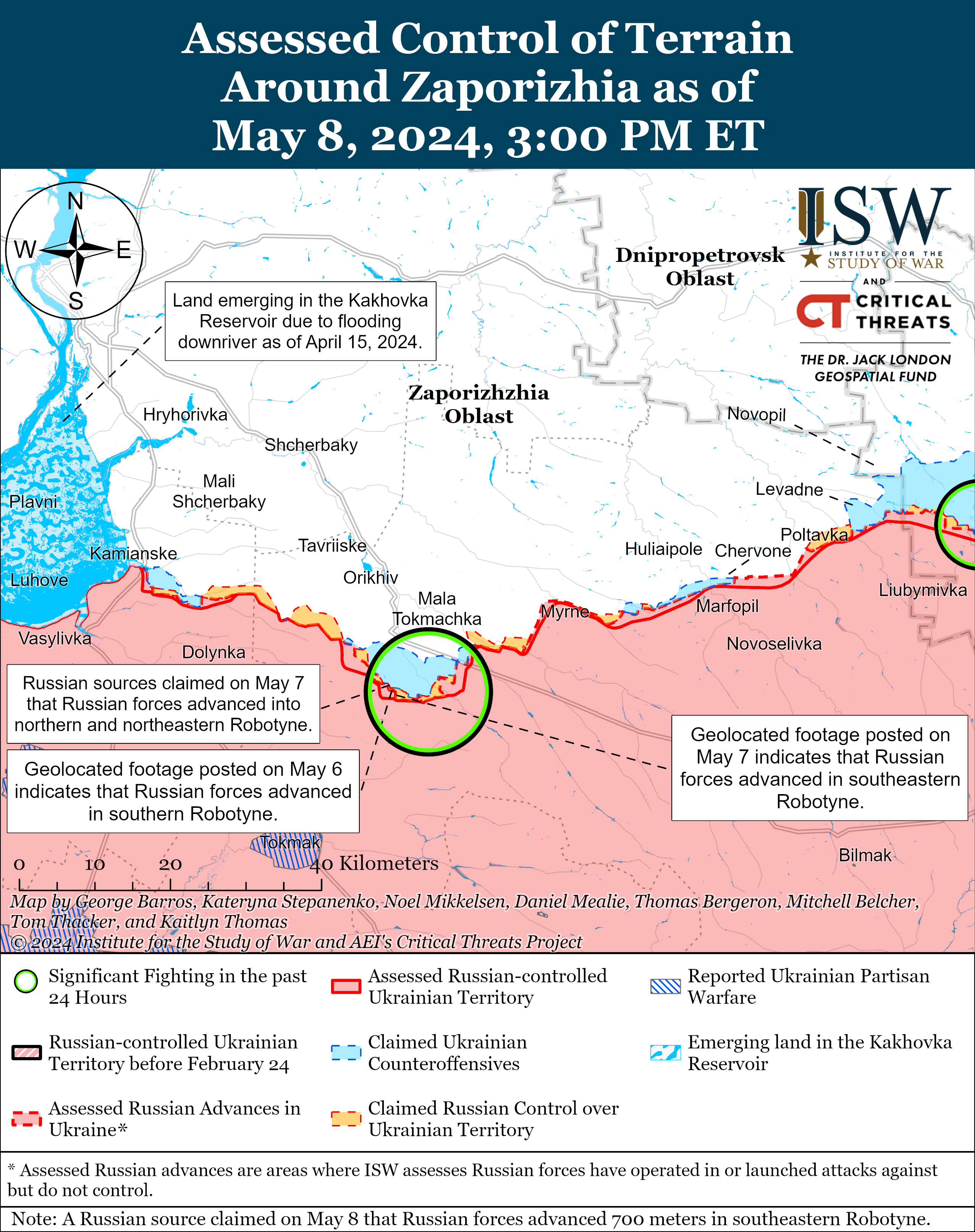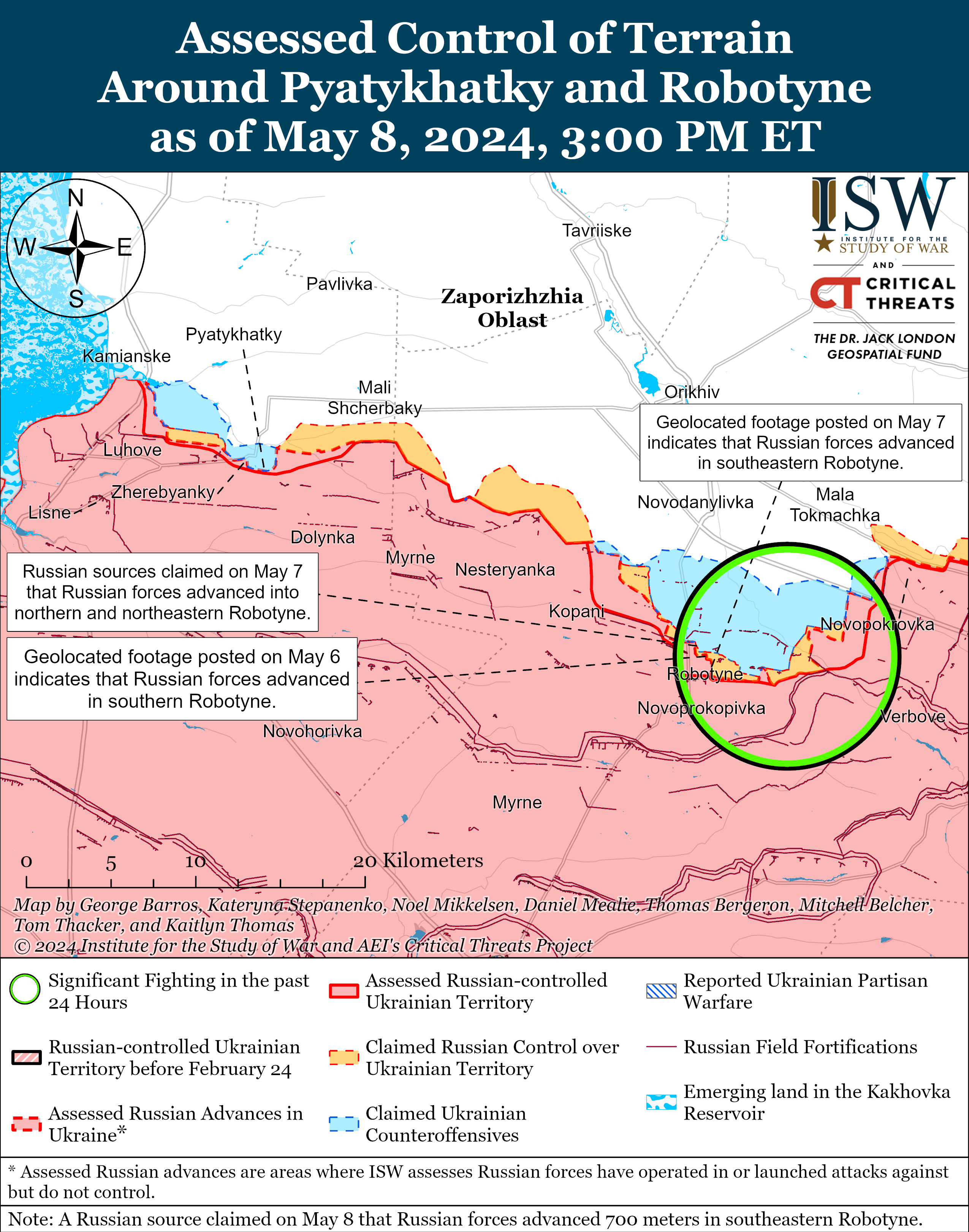 Positional engagements continued in western Zaporizhia Oblast on May 8, but there were no confirmed changes to the frontline. A Russian milblogger claimed that Russian forces advanced 700 meters in depth from southeastern Robotyne, although ISW has not observed visual evidence of this claim.[70] The milblogger may be referring to recent geolocated footage indicating that Russian forces recently advanced along Skidhna Street to new positions in southeastern Robotyne.[71] Positional engagements continued near Robotyne and Verbove (east of Robotyne).[72]