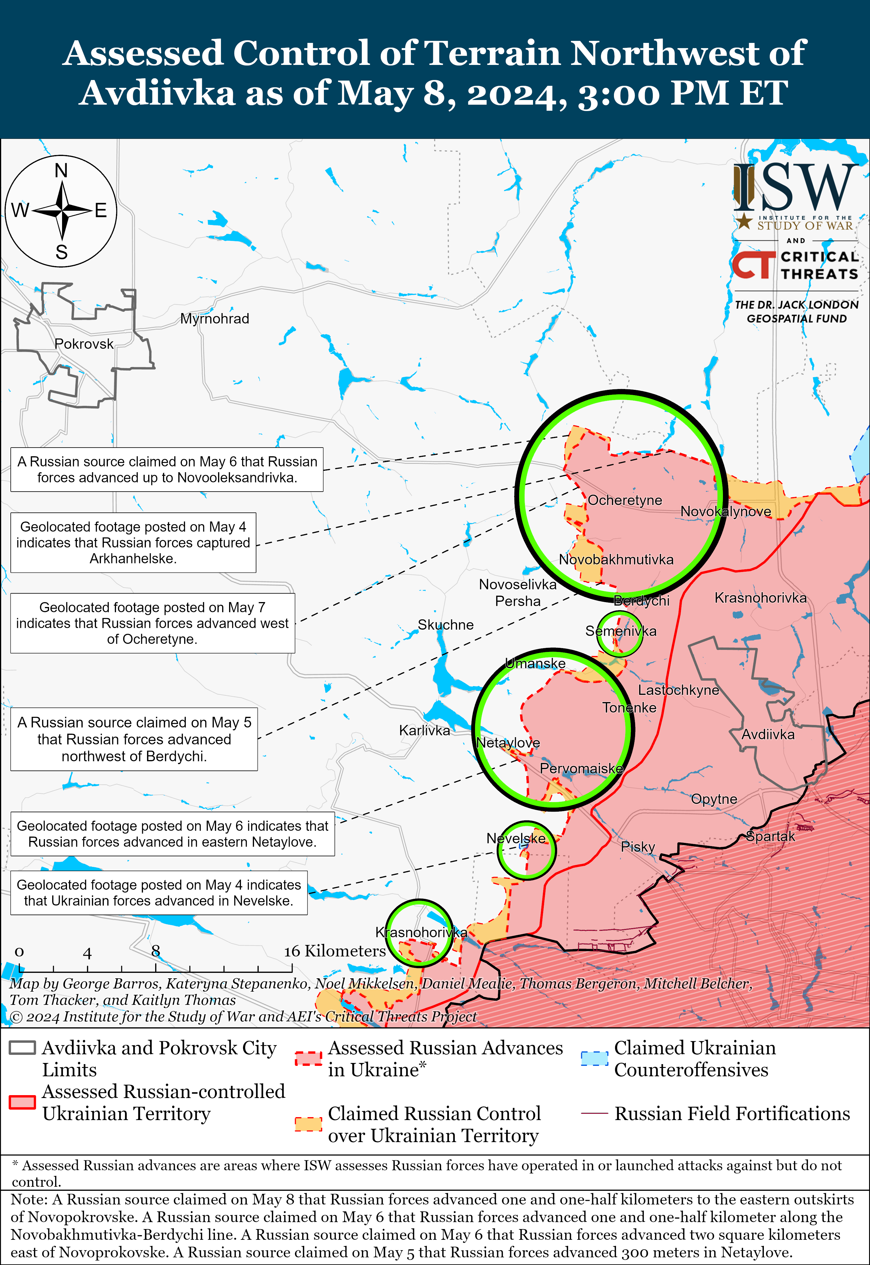 Russian forces recently made significant tactical gains northwest of Avdiivka and recently advanced elsewhere west of Avdiivka. Geolocated footage published on May 8 indicates that Russian forces recently advanced roughly four kilometers north of Ocheretyne (northwest of Avdiivka) towards the eastern outskirts of Novooleksandrivka (northwest of Avdiivka and Ocheretyne) and that Ukrainian forces do not maintain positions on the northwestern outskirts of Ocheretyne.[57] Additional geolocated footage published on May 8 indicates that Russian forces advanced to a windbreak south of Solovyove (northwest of Avdiivka) and northwest of Tonenke (west of Avdiivka).[58] The Russian Ministry of Defense (MoD) claimed that elements of the Russian Central Grouping of Forces seized Novokalynove (north of Avdiivka), and ISW assessed that Russian forces likely seized the settlement as of May 4.[59] Russian milbloggers claimed that Russian forces advanced further west of Ocheretyne towards Prohres and up to 1.5 kilometers in depth towards Novopokrovske, although ISW has not observed visual confirmation of these claims.[60] Russian forces also continued offensive operations north of Avdiivka near Oleksandropil; northwest of Avdiivka near Ocheretyne, Arkhanhelske, Yevhenivka, and Sokil; west of Avdiivka near Semenivka, Novoselivka Persha, Umanske, and Netaylove; and southwest of Avdiivka near Nevelske, Pervomaiske, and Vodyane.[61] Elements of the Russian 9th Motorized Rifle Brigade (Donetsk People’s Republic [DNR] 1st AC) are reportedly operating near Netaylove.[62]