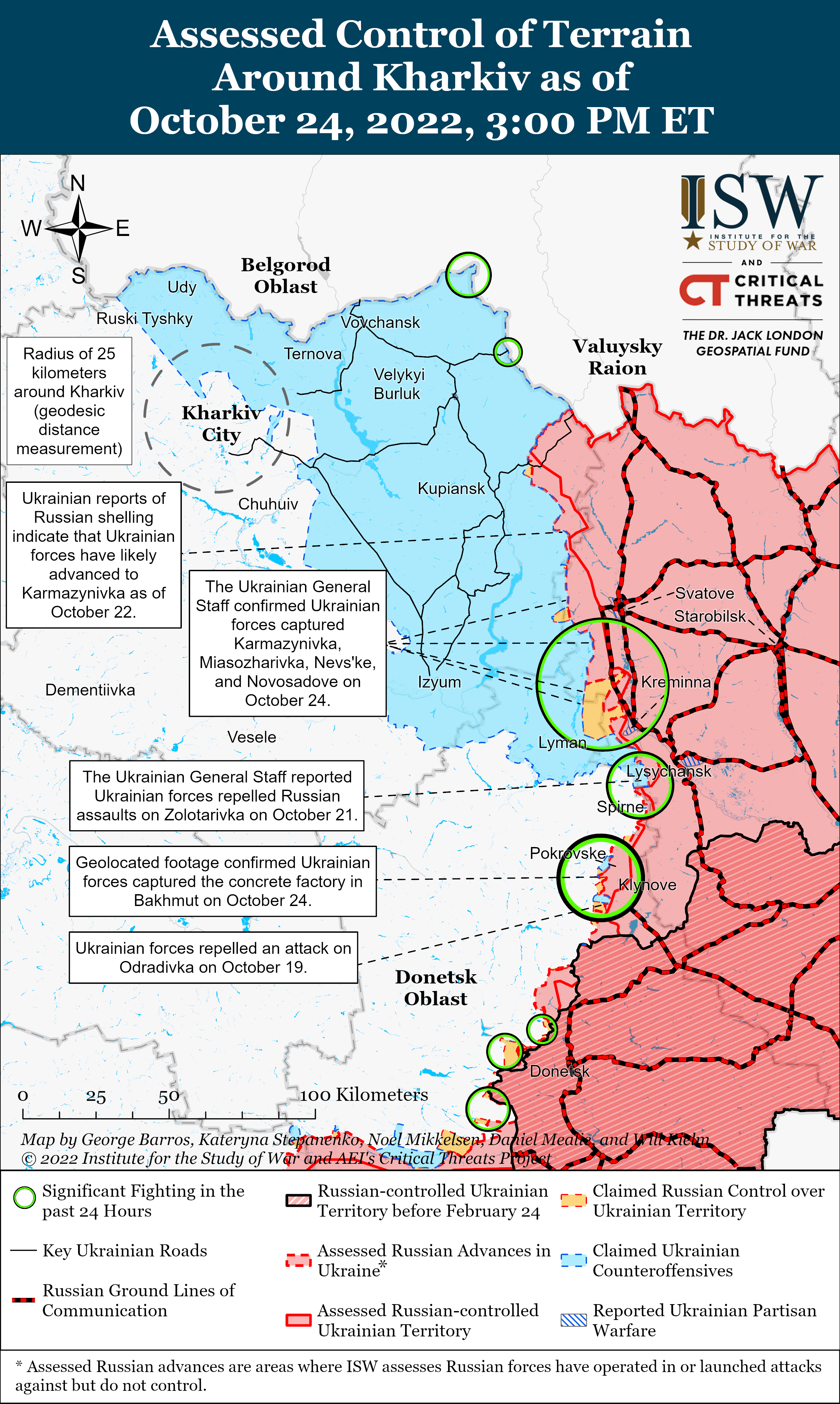 Russian sources claimed that Ukrainian forces conducted counteroffensive operations in the direction of Kreminna and Svatove on October 23 and 24. The Russian Ministry of Defense and multiple Russian milbloggers claimed that Russian forces repelled a Ukrainian attack in the direction of Chervonopopivka (6km northwest of Kreminna) on October 24.[28] A Russian milblogger reported that Ukrainian forces attempted an offensive in Bilohorivka, Luhansk Oblast on October 24.[29] One milblogger reported that Russian forces repelled Ukrainian attacks in eastern Kharkiv Oblast near Pershotravneve, Orlyanka, and Berestove (all west of the Svatove) on October 24.[30] A Russian milblogger wrote that Russian forces stopped a similar Ukrainian breakthrough attempt in intensive battles near Kreminna on October 23.[31] A Russian source reported that Ukrainian forces conducted reconnaissance-in-force along the Raihorodka-Kovalivka line on October 23.[32]