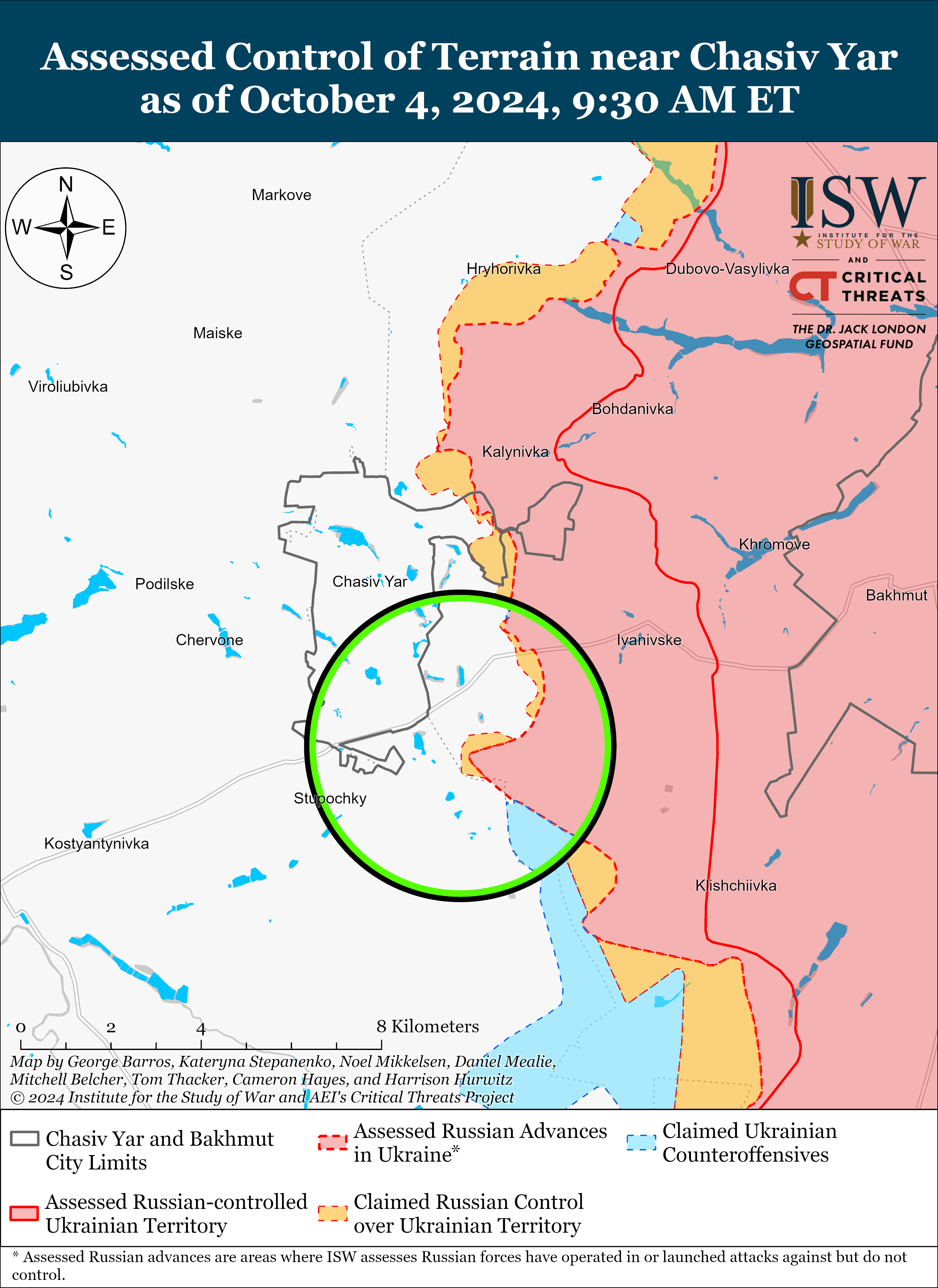 Russian forces continued offensive operations near Chasiv Yar on October 4 but did not make any confirmed gains. Russian forces continued offensive operations near Chasiv Yar; south of Chasiv Yar near Bila Hora and Stupochky; and southeast of Chasiv Yar near Andriivka on October 3 and 4.[19]