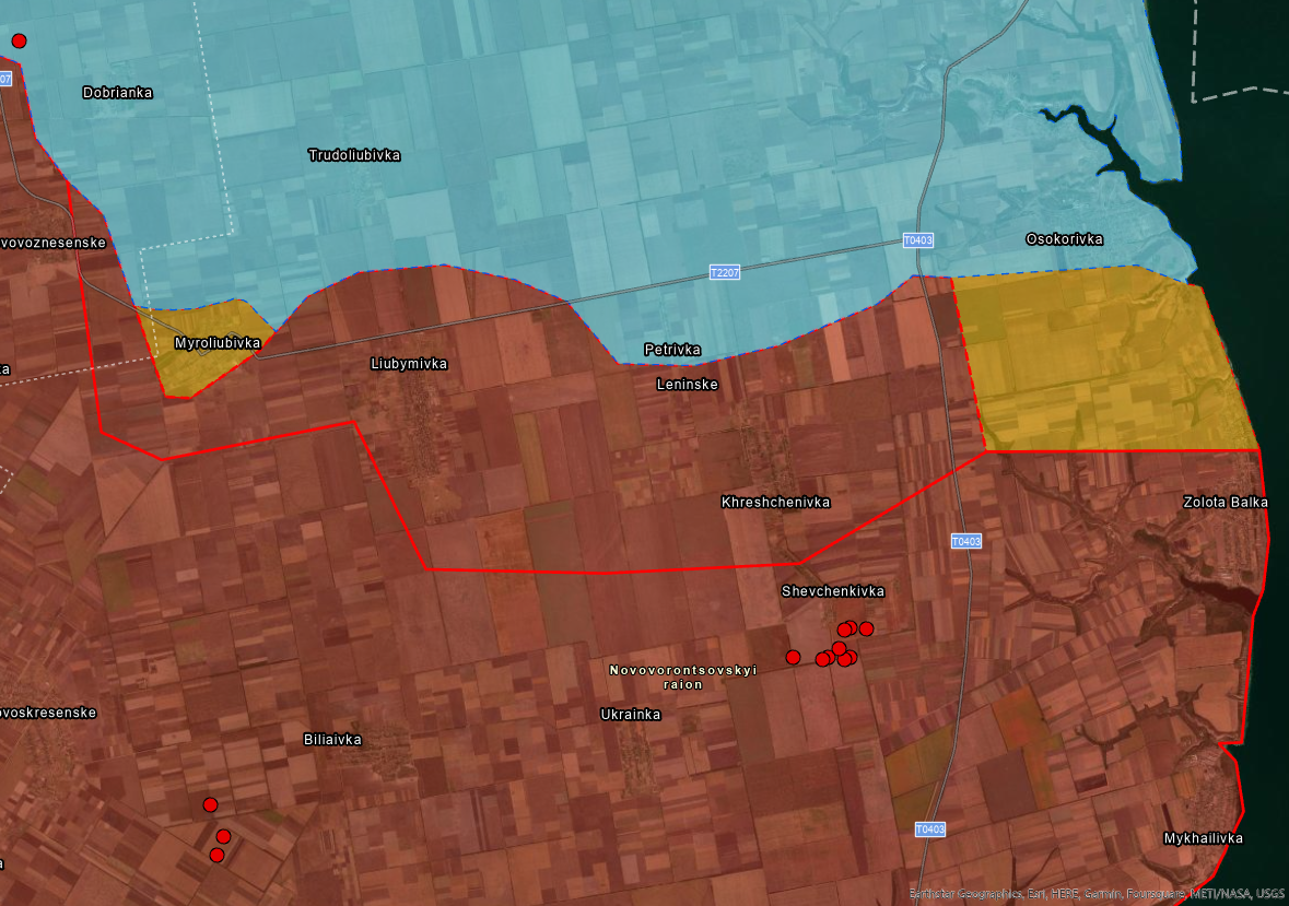 Several milbloggers claimed that Ukrainian forces continued to launch counteroffensives from the Kryvyi Rih direction and noted that Russian forces are using rocket artillery and aviation to repel Ukrainian attacks on settlements east of Vysokopillya.[30] Milbloggers also claimed that Ukraine’s main objective is to reach Beryslav (just north of Nova Kakhovka).[31] The Russian Ministry of Defense claimed that Russian forces continued to shell Ukrainian troops along the Kherson-Dnipropetrovsk Oblast border.[32] A Russian milblogger claimed that Ukrainian forces are attempting to accumulate enough forces to gain control over Vysokopillya, and another noted that Russian drones have been directing artillery fire at advancing Ukrainian military equipment in the vicinity of Vysokopillya.[33] The Russian Ministry of Defense also reported striking Ukrainian positions northwest of Vysokopillya.[34] Milbloggers claimed that Ukrainian forces advanced south of Kostromka (10km southeast of the Ukrainian bridgehead) to Bezimenne, after failing to advance to Shchastlyve (west of Bezimenne and in the direction of the T2207 highway).[35] Milbloggers additionally stated that Russian forces continued to use aviation to drop over a dozen FAB-500 500kg bombs on Ukrainian forces in Bezimenne.[36] The Russian Ministry of Defense claimed to have destroyed Ukrainian weapons in Bila Krynytsia (between the Ukrainian bridgehead and Davydiv Brid), inadvertently admitting to some Ukrainian advances in the area.[37] A milblogger stated that Ukrainian forces lost two infantry fighting vehicles after unsuccessfully attempting to launch an assault on Blahodatne (west of Snihurivka).[38] Milbloggers noted that Russian forces regained control over Zeleny Hai and Ternovi Pody (approximately 25km north of Kherson City), while Ukrainian forces maintained positional defenses in Myrne (approximately seven kilometers west of Zeleny Hai) and Lyubomyrivka (just north of Ternovi Pody).[39] Some milbloggers noted that Russian forces are preparing a strike group, increasing artillery and multiple launch rocket system (MLRS) fire, and are requesting air support in the direction of Posad-Pokrovske (about 27km northwest of Kherson City).[40]