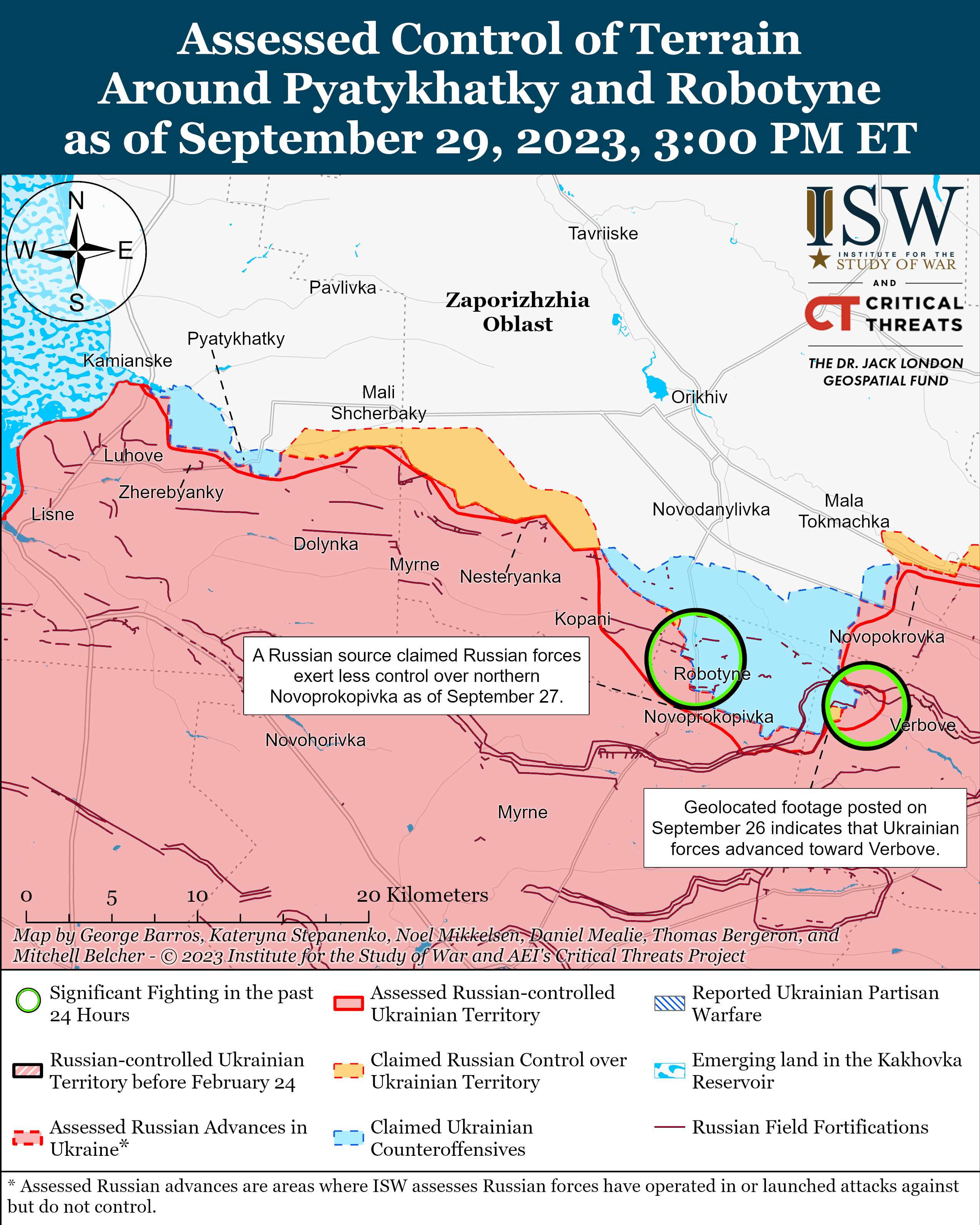 Ukrainian forces conducted offensive operations in western Zaporizhia Oblast but did not advance on September 29. A Russian milblogger claimed on September 28 that Ukrainian forces unsuccessfully attacked north of Robotyne (10km south of Orikhiv).[50] Russian sources claimed on September 28 and 29 that Ukrainian forces attempted to break through Russian defenses near Novoprokopivka (13km south of Orikhiv) but did not specify an outcome.[51] A Russian milblogger claimed on September 29 that Ukrainian forces continued offensive operations towards Novoprokopivka and Verbove (18km southeast of Orikhiv).[52] The Russian MoD claimed that Ukrainian forces conducted eight unsuccessful attacks near Robotyne and Verbove from September 24 to September 29.[53]
