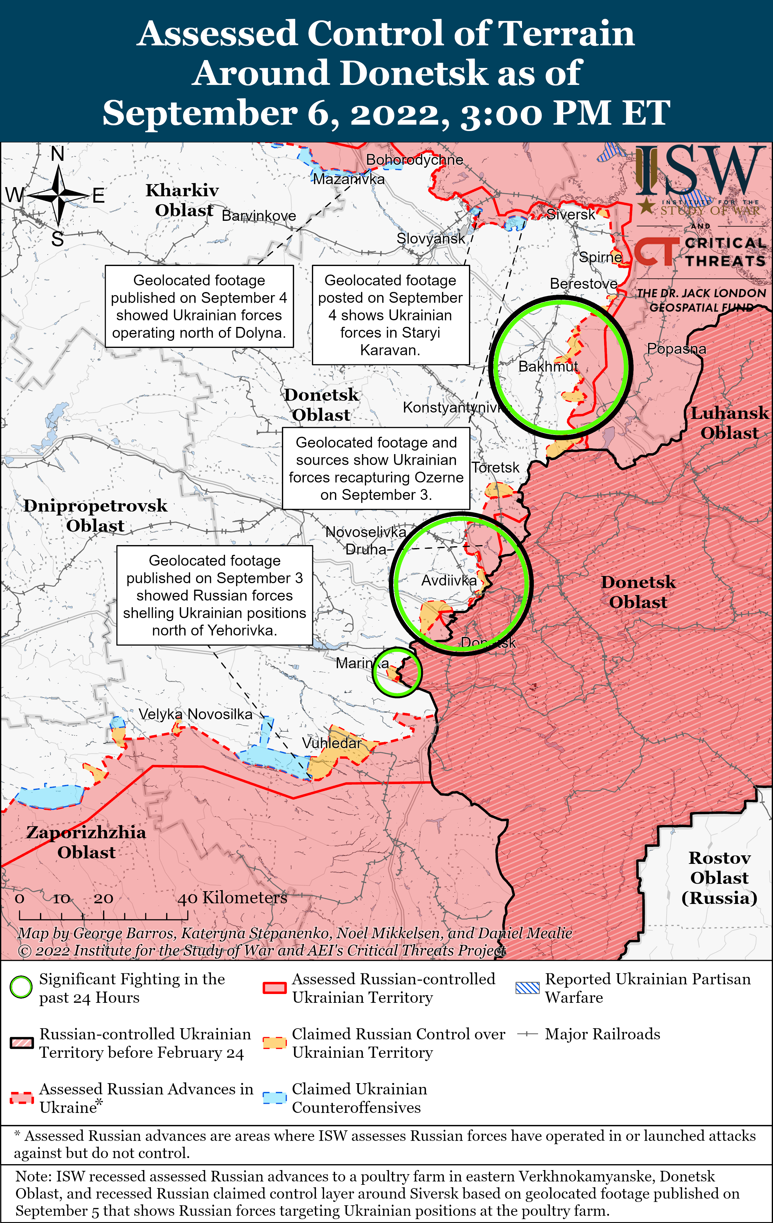Russian forces did not conduct any confirmed ground attacks along the Izyum-Slovyansk axis on September 6 and continued routine air and artillery strikes in this area.[30] Geolocated footage posted on September 5 shows Ukrainian troops walking freely along a road in Staryi Karavan, about 10km northeast of Slovyansk.[31] The footage suggests that Ukrainian forces may have conducted a limited counterattack northeast of Slovyansk and gained ground near the T0514 highway that runs into Slovyansk itself, or conducted an infiltration reconnaissance mission in the area. Russian forces’ control over Staryi Karavan is likely reduced in either event.