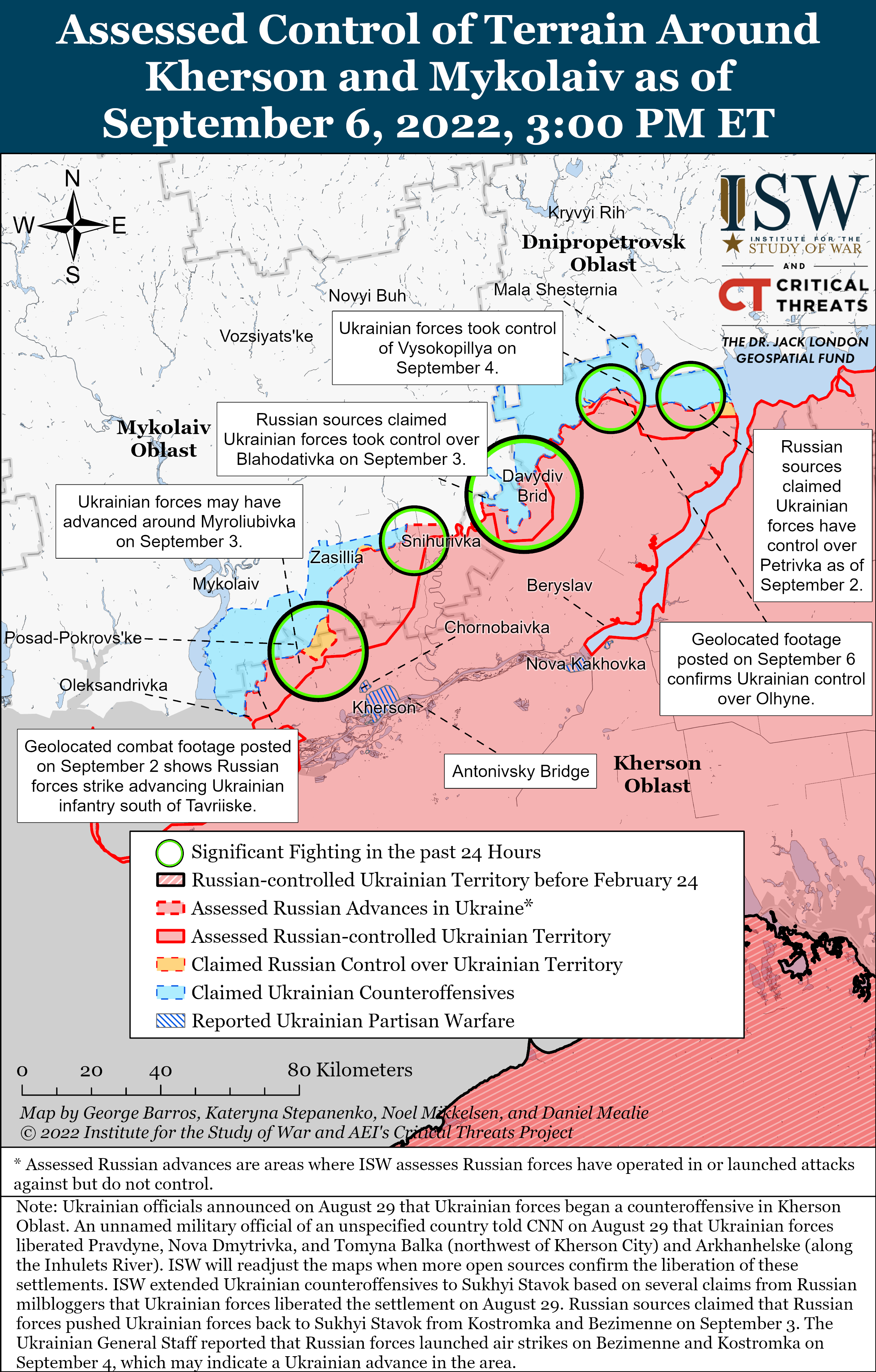 Ukrainian and Russian sources reported kinetic activity in two main areas along the Kherson Oblast frontline on September 6- northwest of Kherson City near the Mykolaiv-Kherson border and in western Kherson Oblast along the Inhulets River that runs between Mykolaiv and Kherson Oblasts. The Ukrainian General Staff reported that Ukrainian troops repelled an attempted Russian advance near Lyubomirivka, about 25km northwest of Kherson City.[23] Ukraine’s Southern Operational Command similarly noted that Ukrainian troops fought against Russian assaults near Schmidtove and Ternovi Pody, both about 25km north of Kherson City and along the Mykolaiv-Kherson Oblast border.[24] The frontline northwest of Kherson City is likely highly contested as Ukrainian troops attempt to push inwards toward Kherson City and Russian troops attempt to push outwards towards Mykolaiv City.
