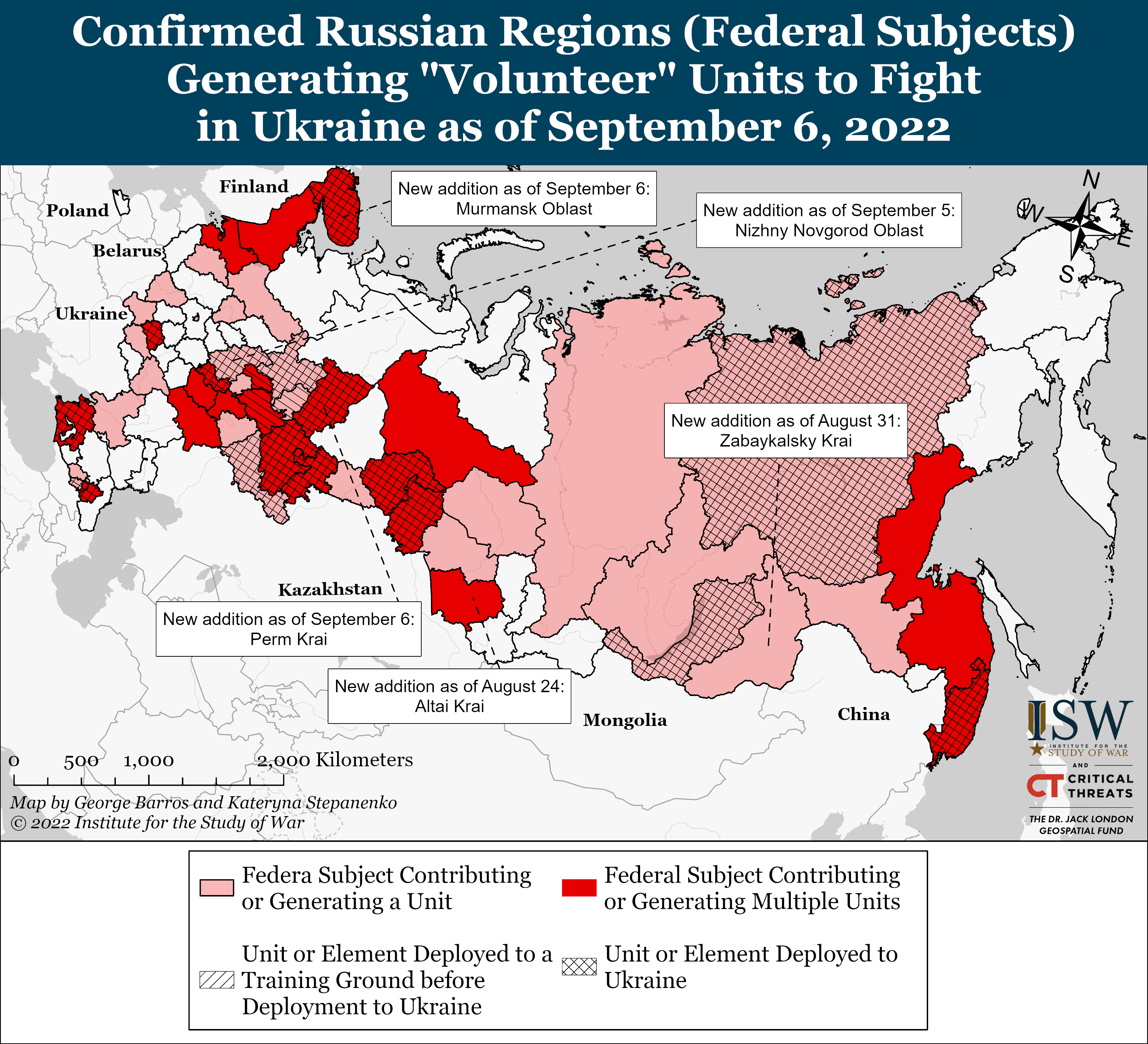 Former Deputy of Perm Oblast’s Legislative Assembly, Alexander Grigorenko, returned to Perm on September 5 after his unspecified volunteer unit deployed to Donbas.[53] Grigorenko’s return to Perm is the first indicator that ISW has observed of the deployment of a Perm Oblast’s volunteer unit to Ukraine. Russian media outlet Kasparov reported that military enlistment offices in Samara Oblast are conducting solicitation calls via phone to invite Samaran reserve officers to enlist for a one-time 300,000-ruble ($4,895) payment and 200,000-ruble ($3,263) monthly salary for volunteer service.[54] Russian media also stated that the ”Murman” rifle company, likely newly formed in Murmansk Oblast and part of the 200th Motorized Rifle Brigade, deployed to Ukraine on September 6 and that the “Komi“ motorized rifle company of the Northern Fleet deployed to Ukraine on August 30.[55] Russian outlet TVKOM reported that the formation of the Buryatian ”Baikal” battalion is at about 70 percent (of a planned end strength of 500 men) and that the battalion will deploy to Mulino, Nizhny Novgorod, to undergo training after forming.[56] Chechen Head Ramzan Kadyrov additionally stated on September 6 that the Chechen Republic is preparing ”several thousand” more volunteers and fighters for two new elements that will be part of the existing two volunteer Chechen regiments and three battalions generated to fight in Ukraine.[57]